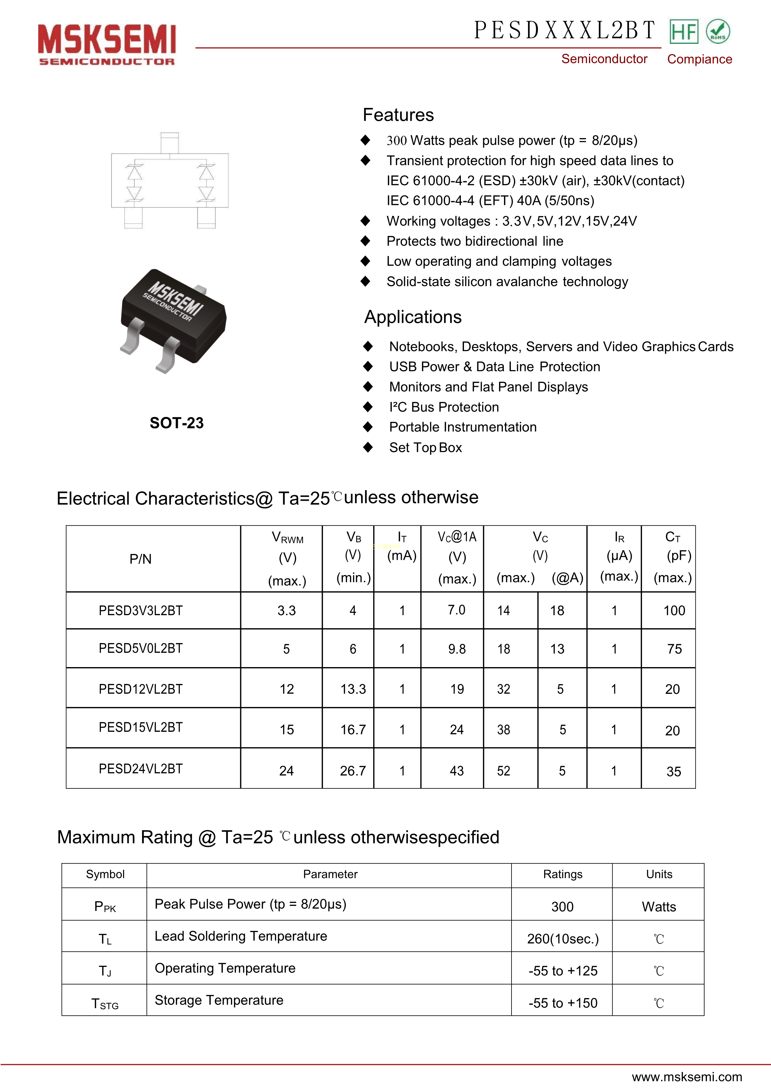 PESD5V0L2BT数据手册SOT-23封装MSKSEMI(美森科)PDF规格书,中英文下载