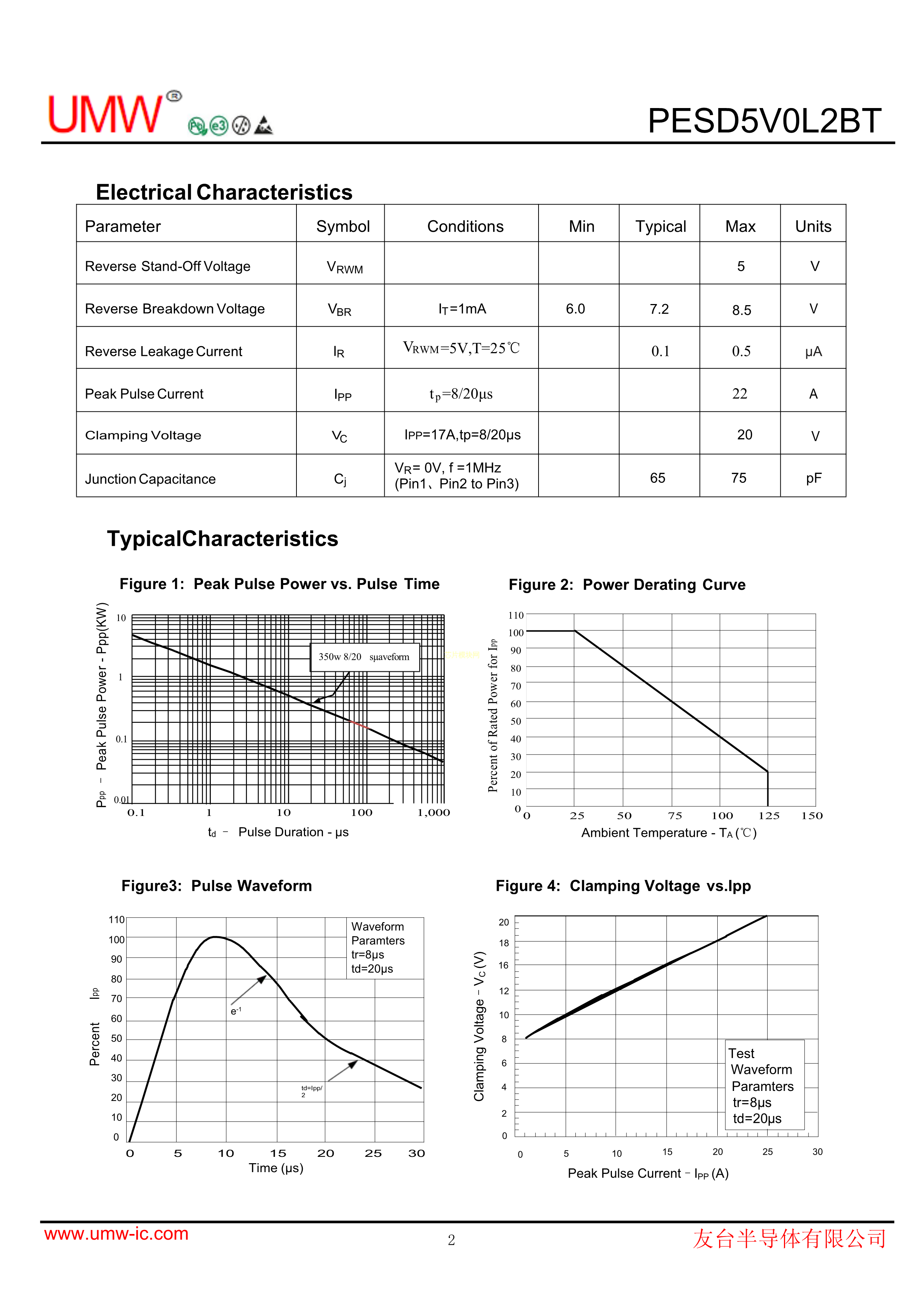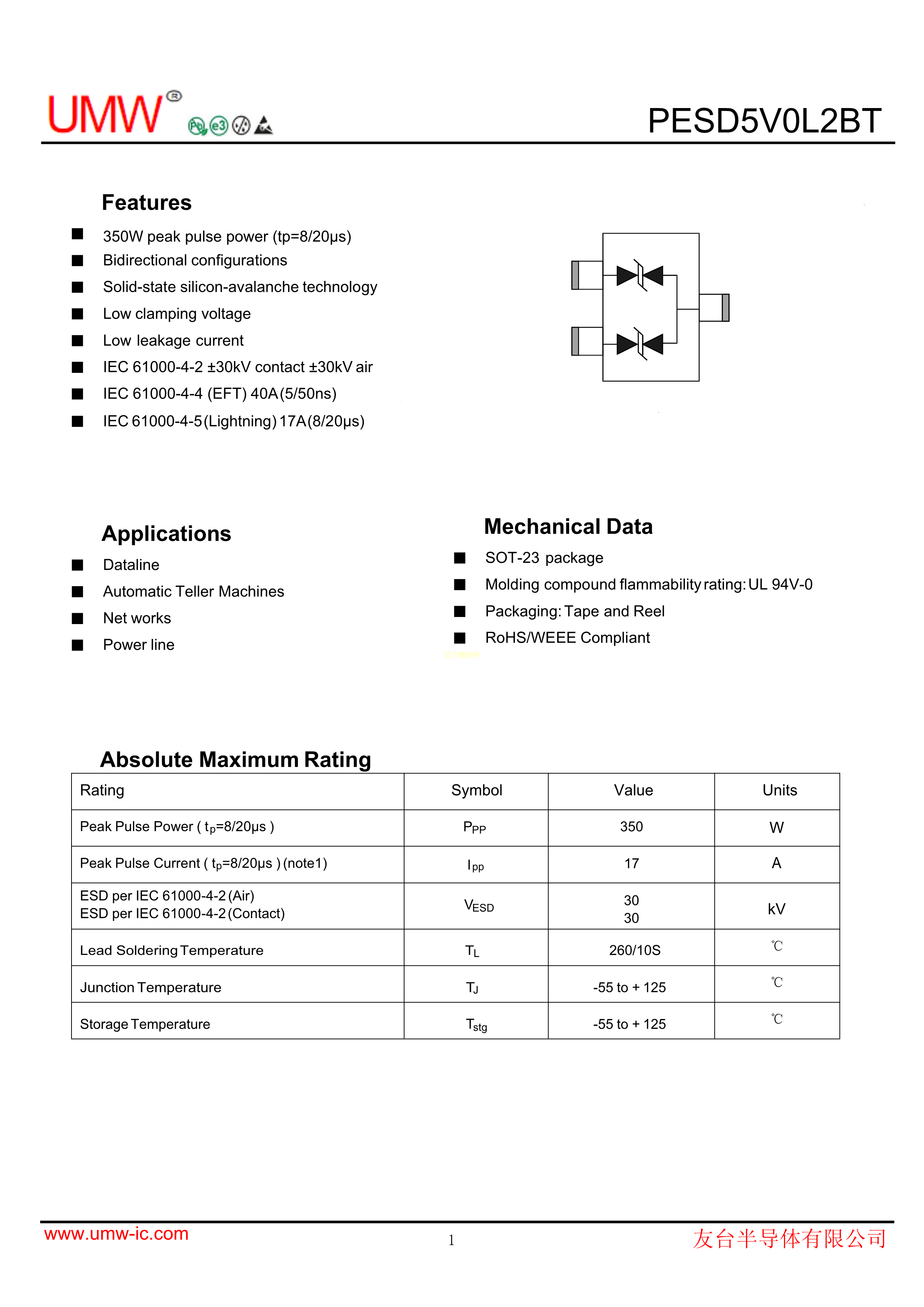 PESD5V0L2BT数据手册SOT-23封装UMW(友台半导体)PDF规格书,中英文下载
