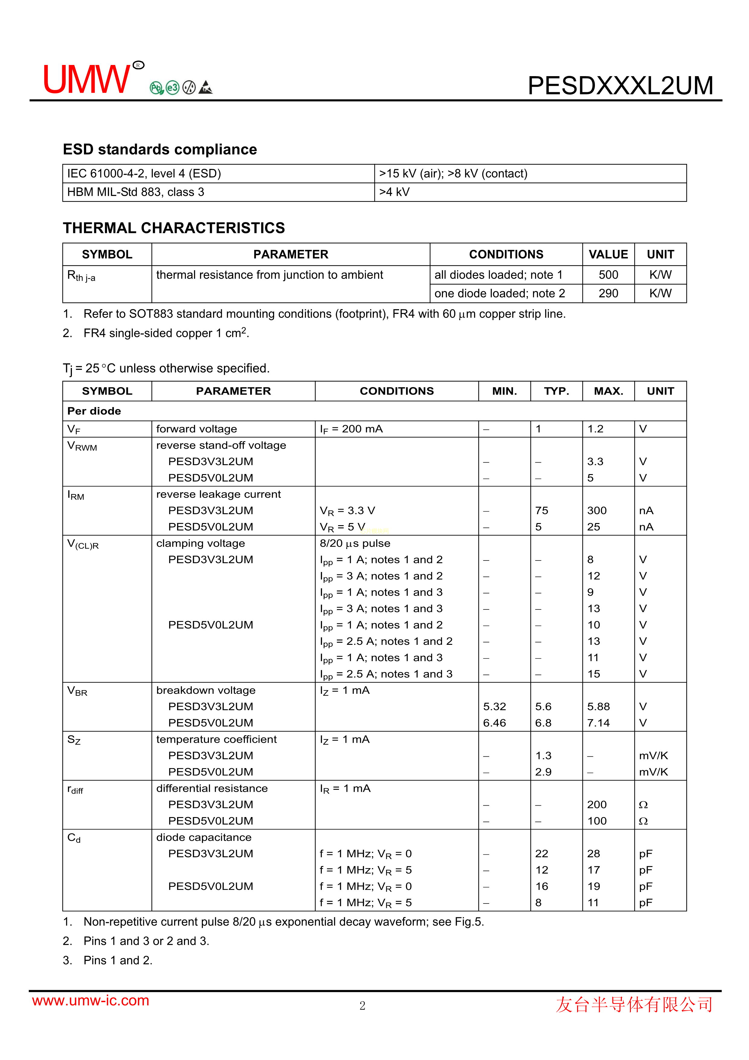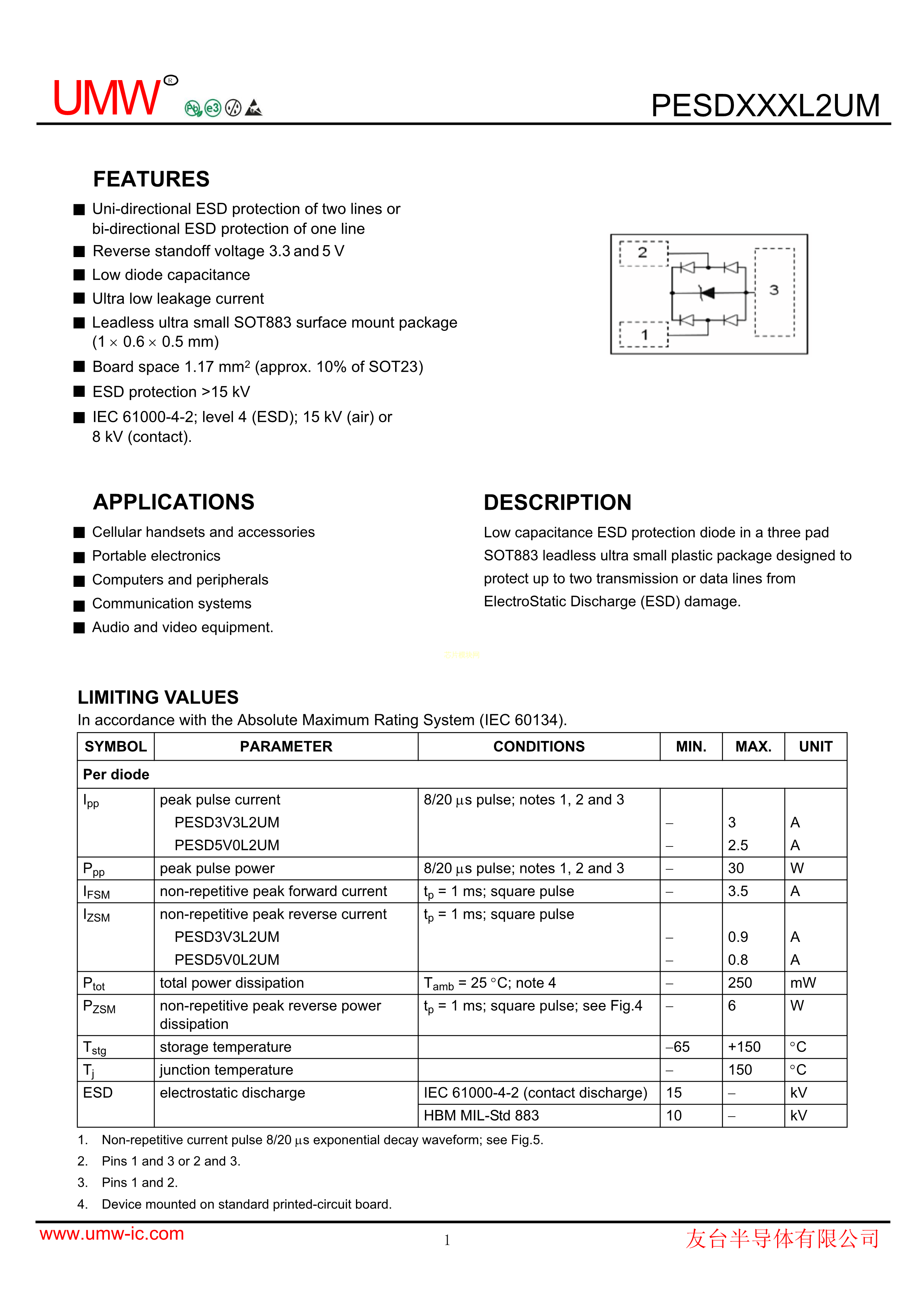 PESD5V0L2UM数据手册SOT-883封装UMW(友台半导体)PDF规格书,中英文下载