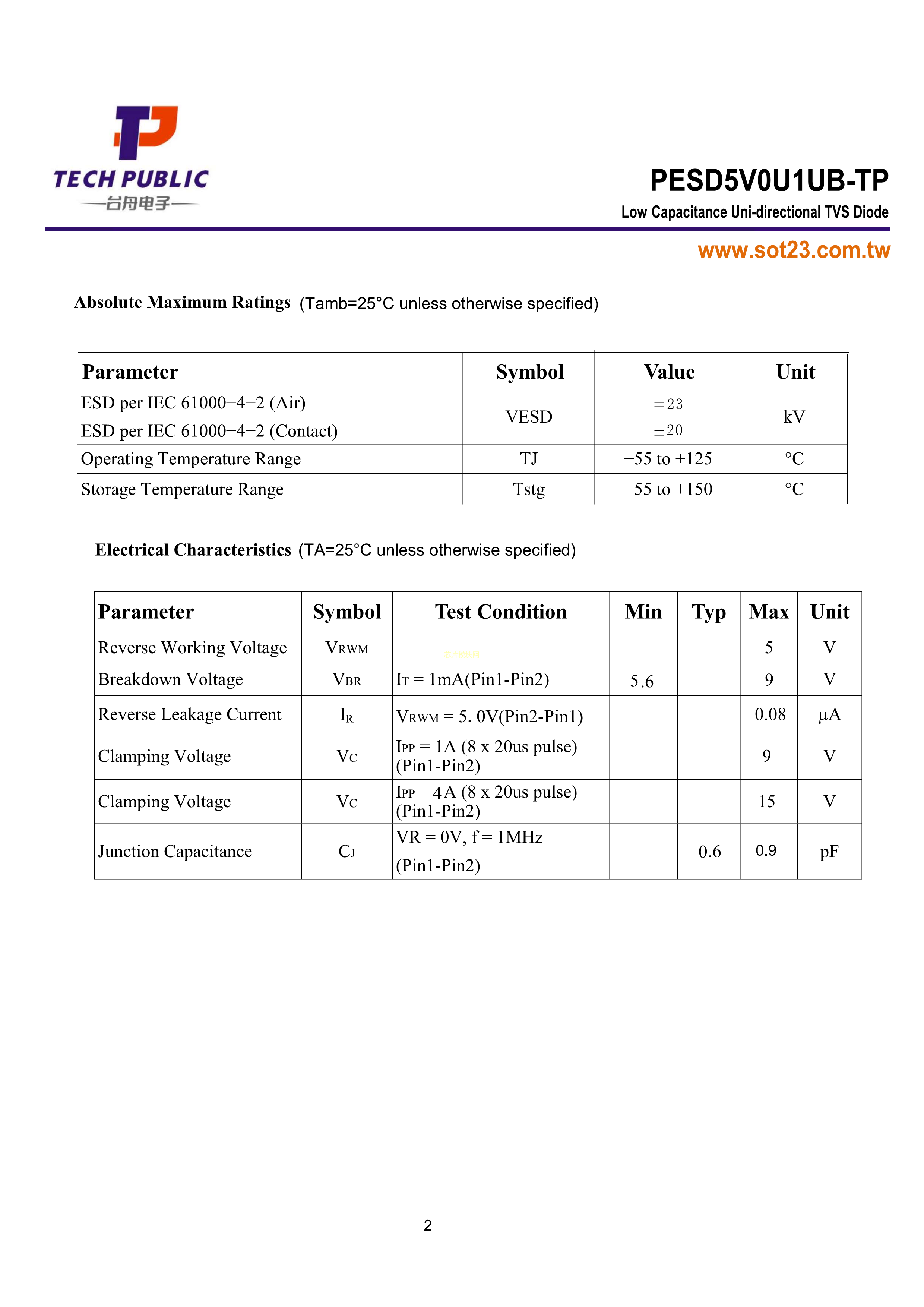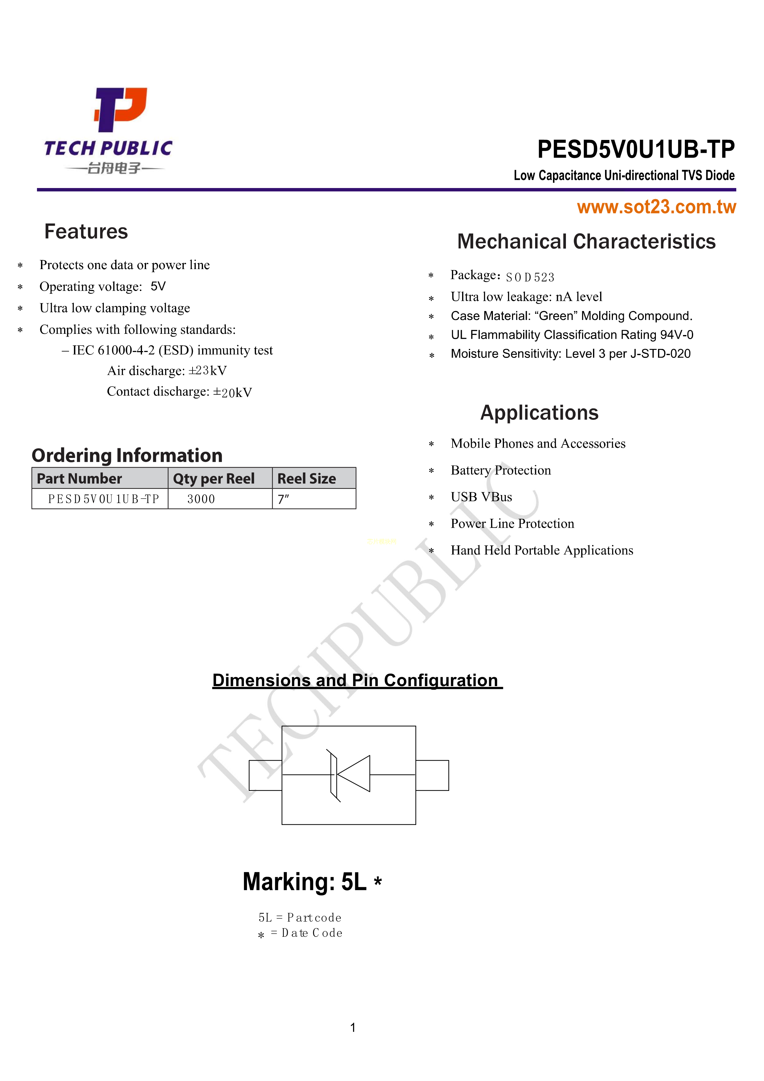 PESD5V0U1UB-TP数据手册SOD-523-0603封装TECH PUBLIC(台舟)PDF