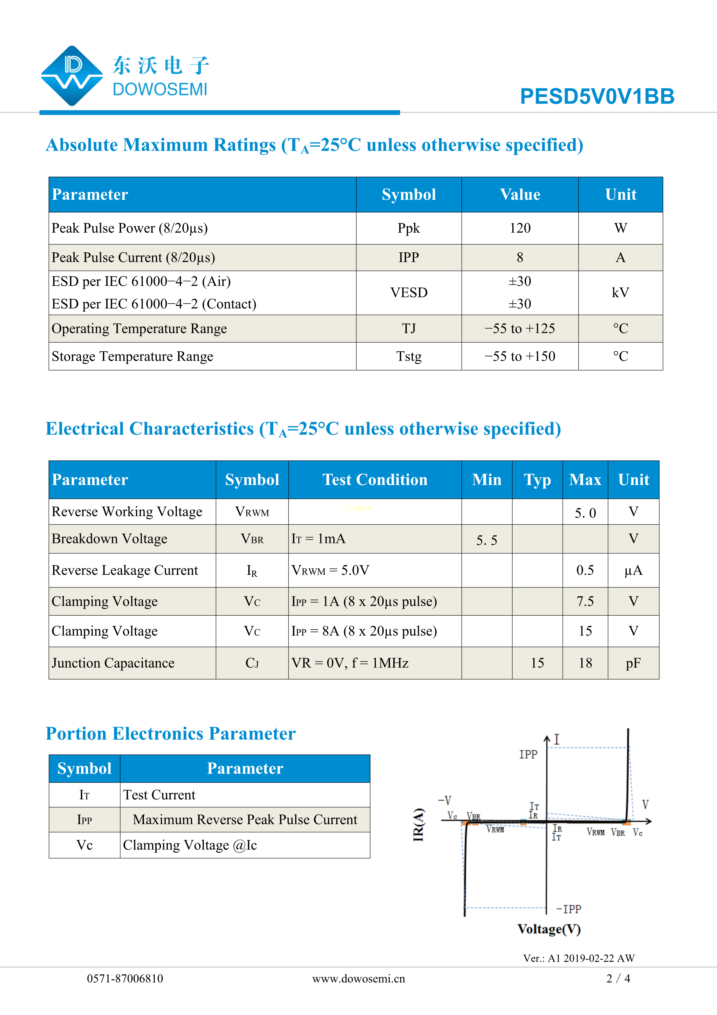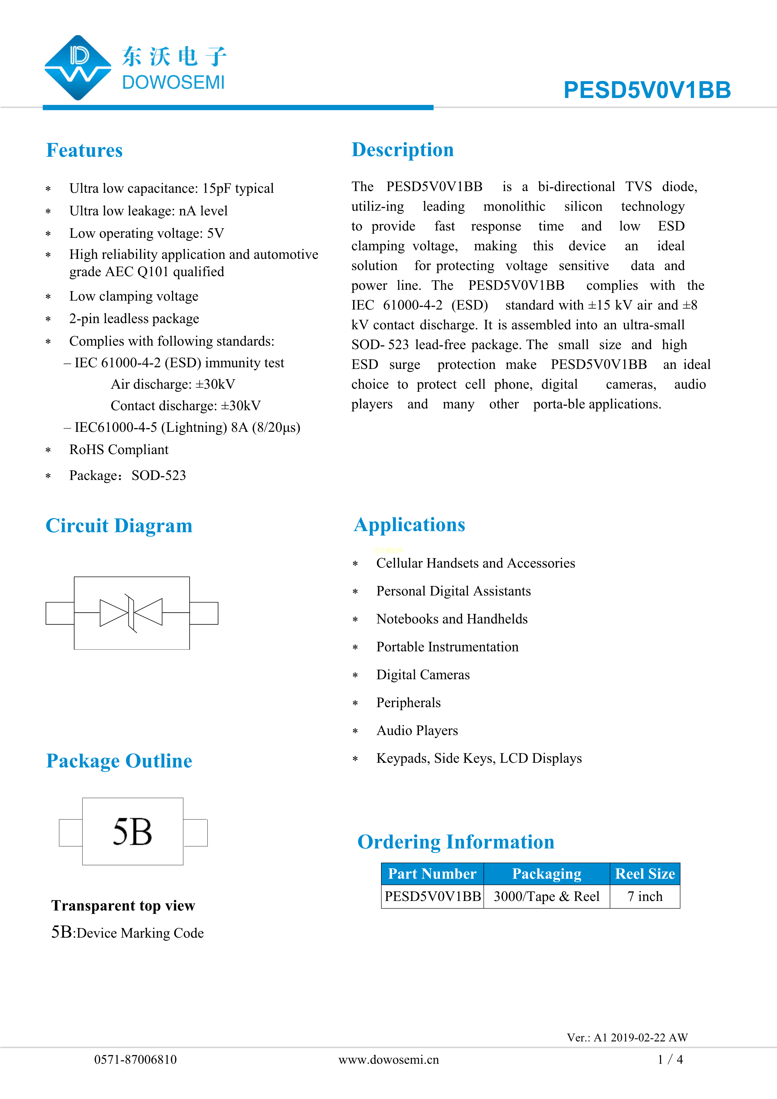 PESD5V0V1BB数据手册SOD-523封装DOWO(东沃)PDF规格书,中英文下载
