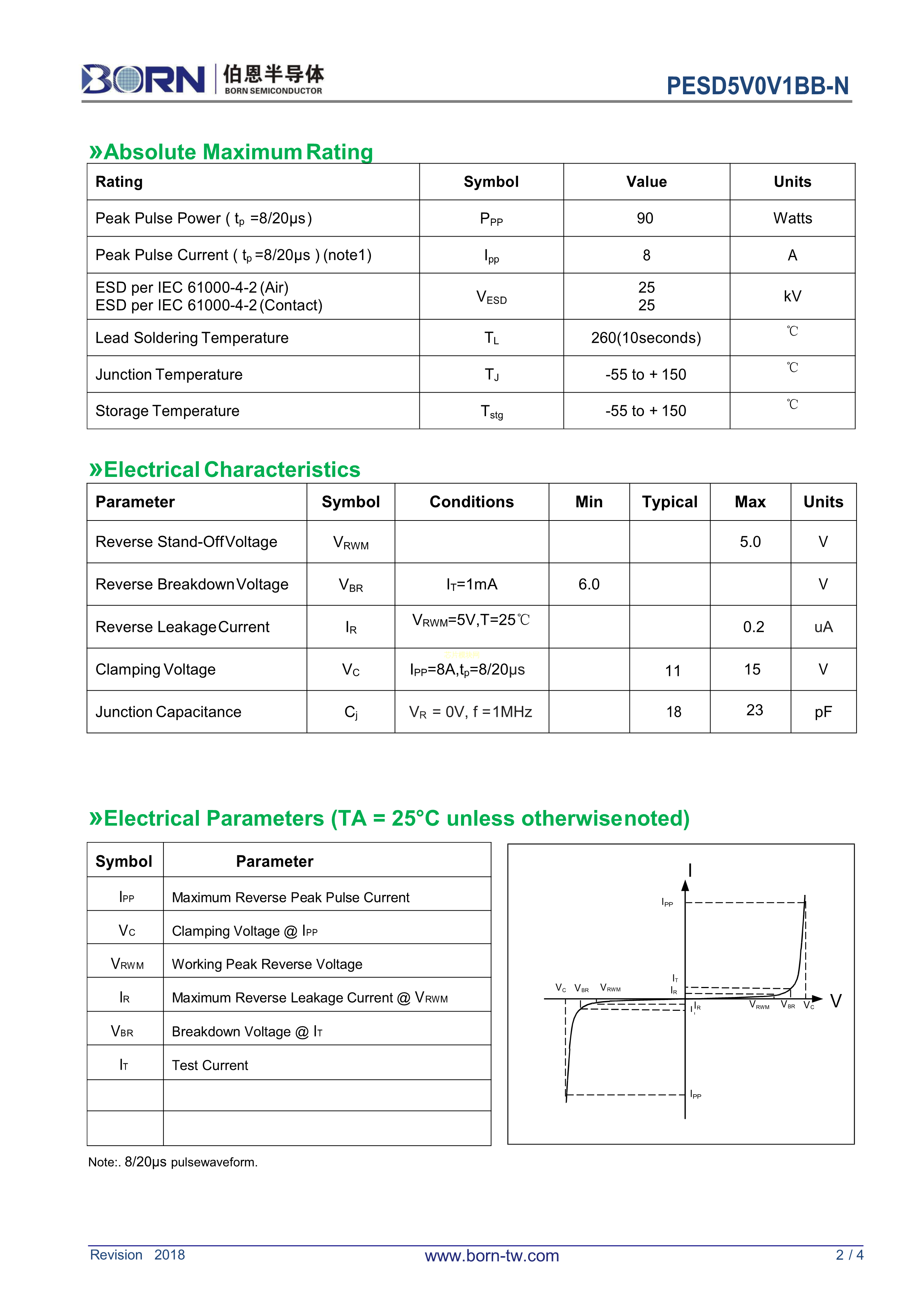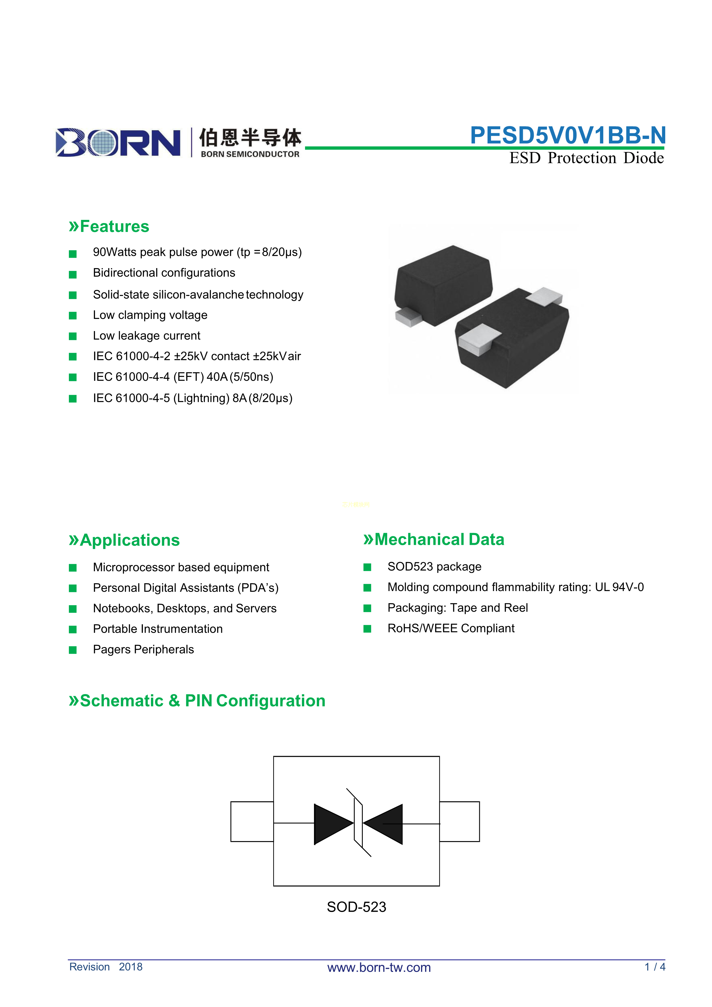 PESD5V0V1BB-N数据手册SOD-523封装BORN(伯恩半导体)PDF规格书,中英文下载