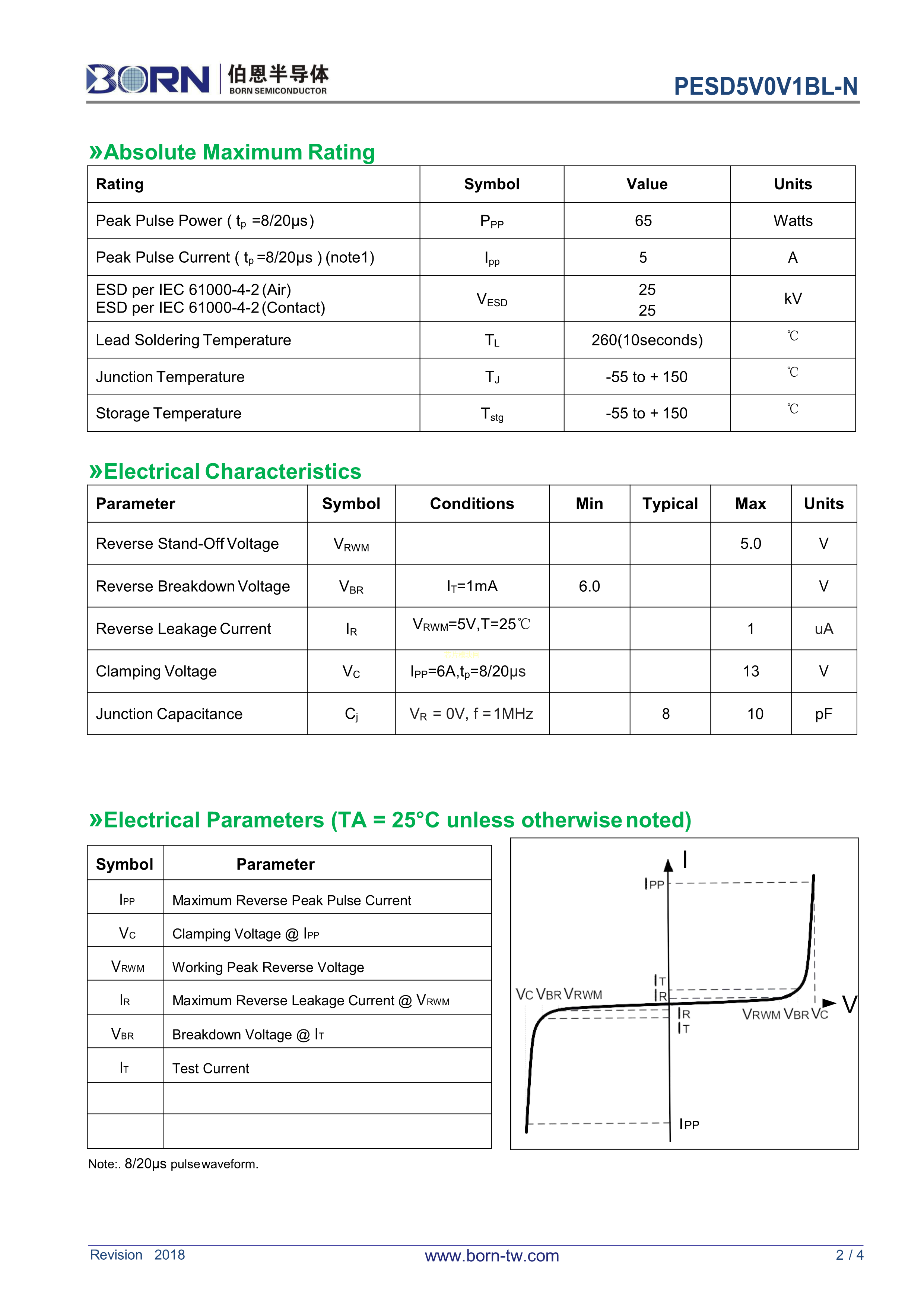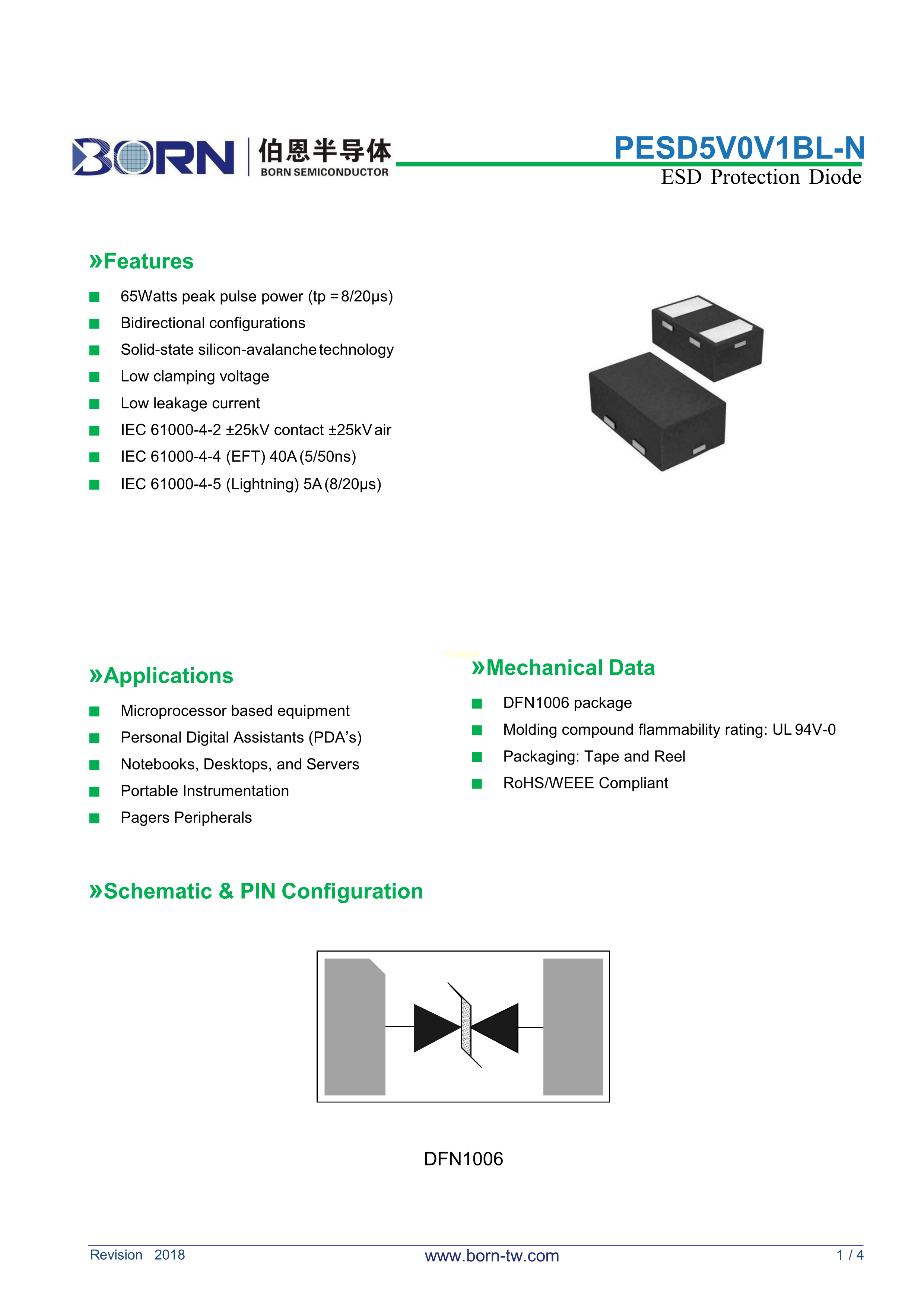 PESD5V0V1BL-N数据手册DFN1006封装BORN(伯恩半导体)PDF规格书,中英文下载