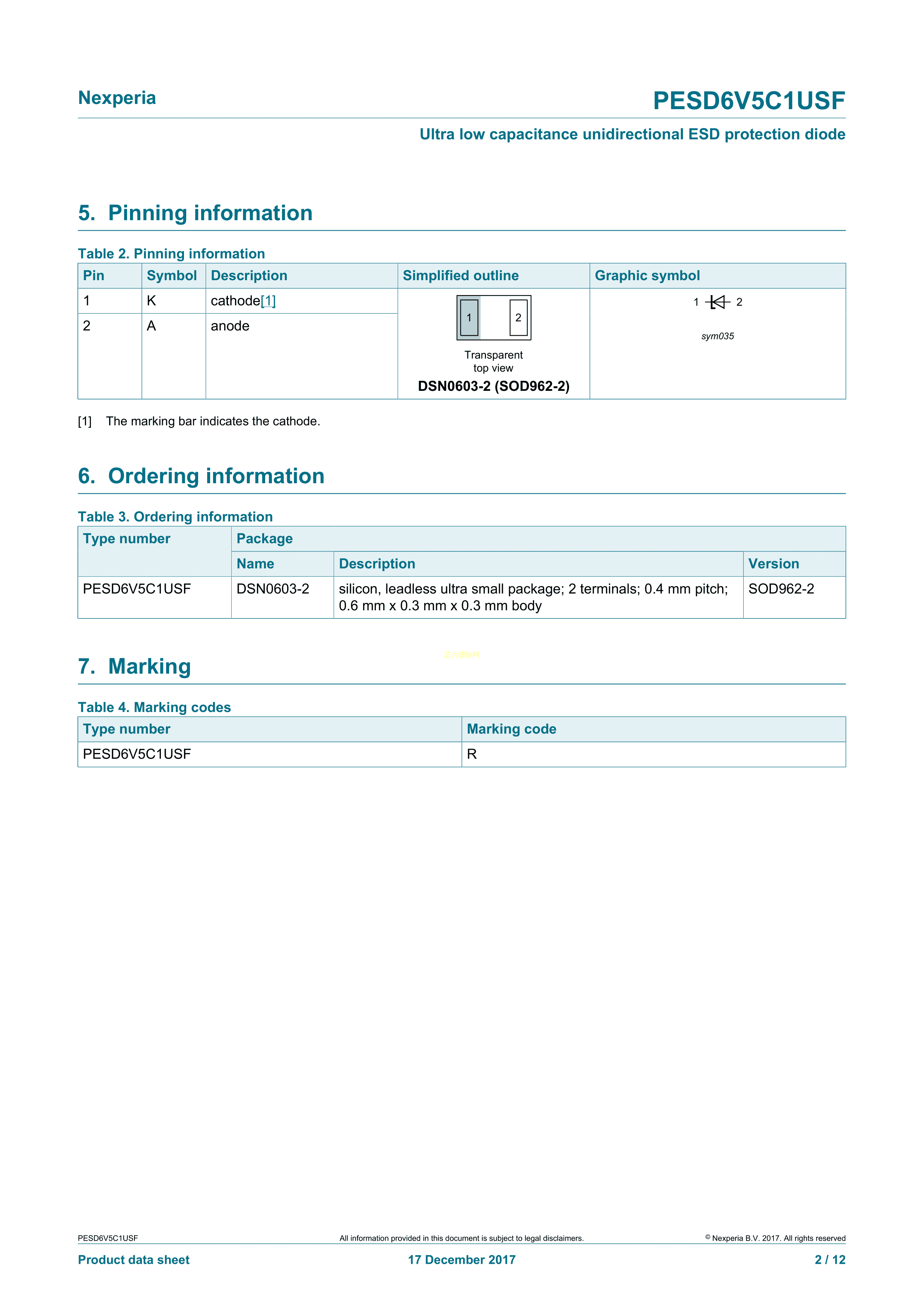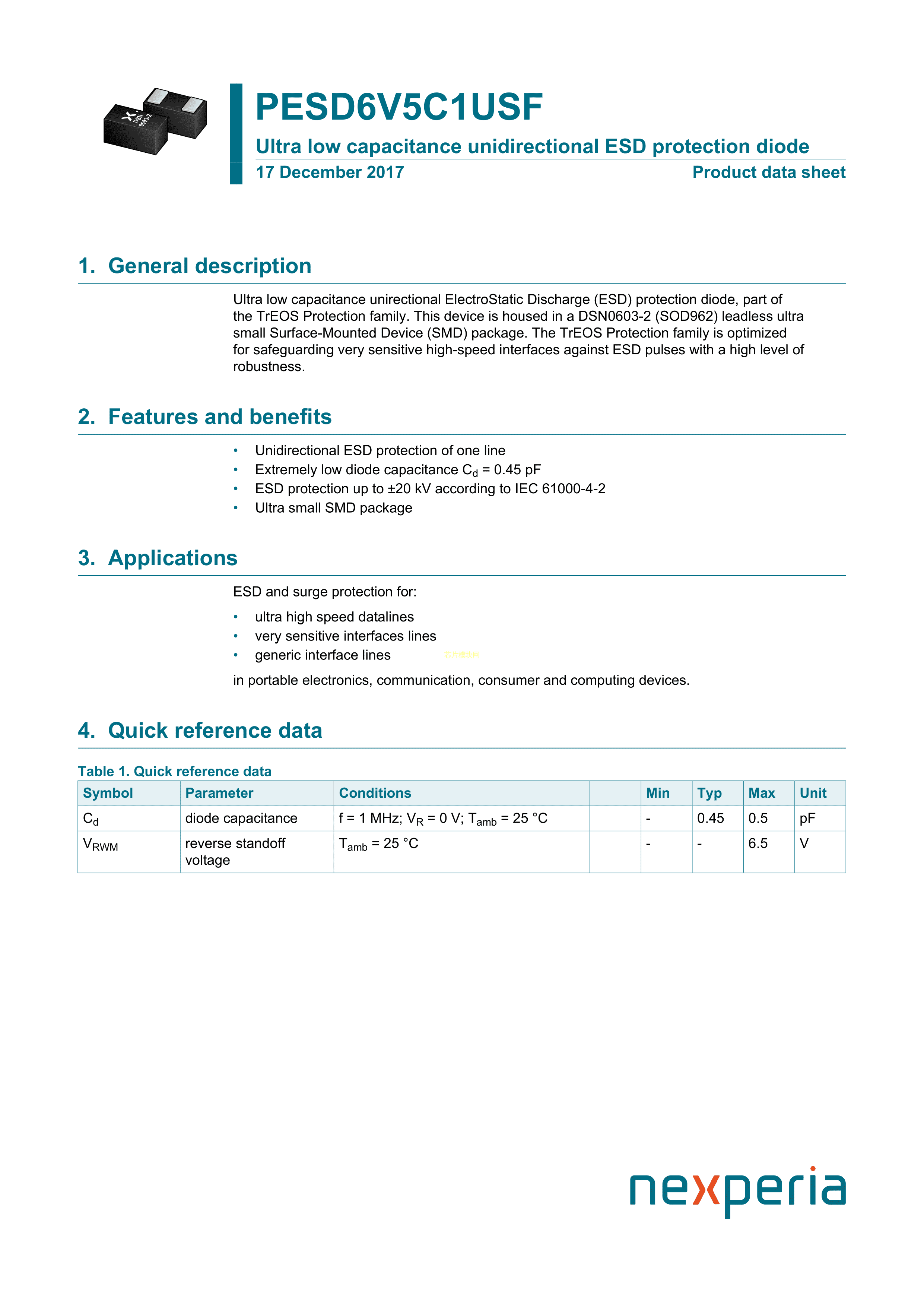 PESD6V5C1USFYL数据手册DSN0603-2封装Nexperia(安世)PDF规格书,中英文下载