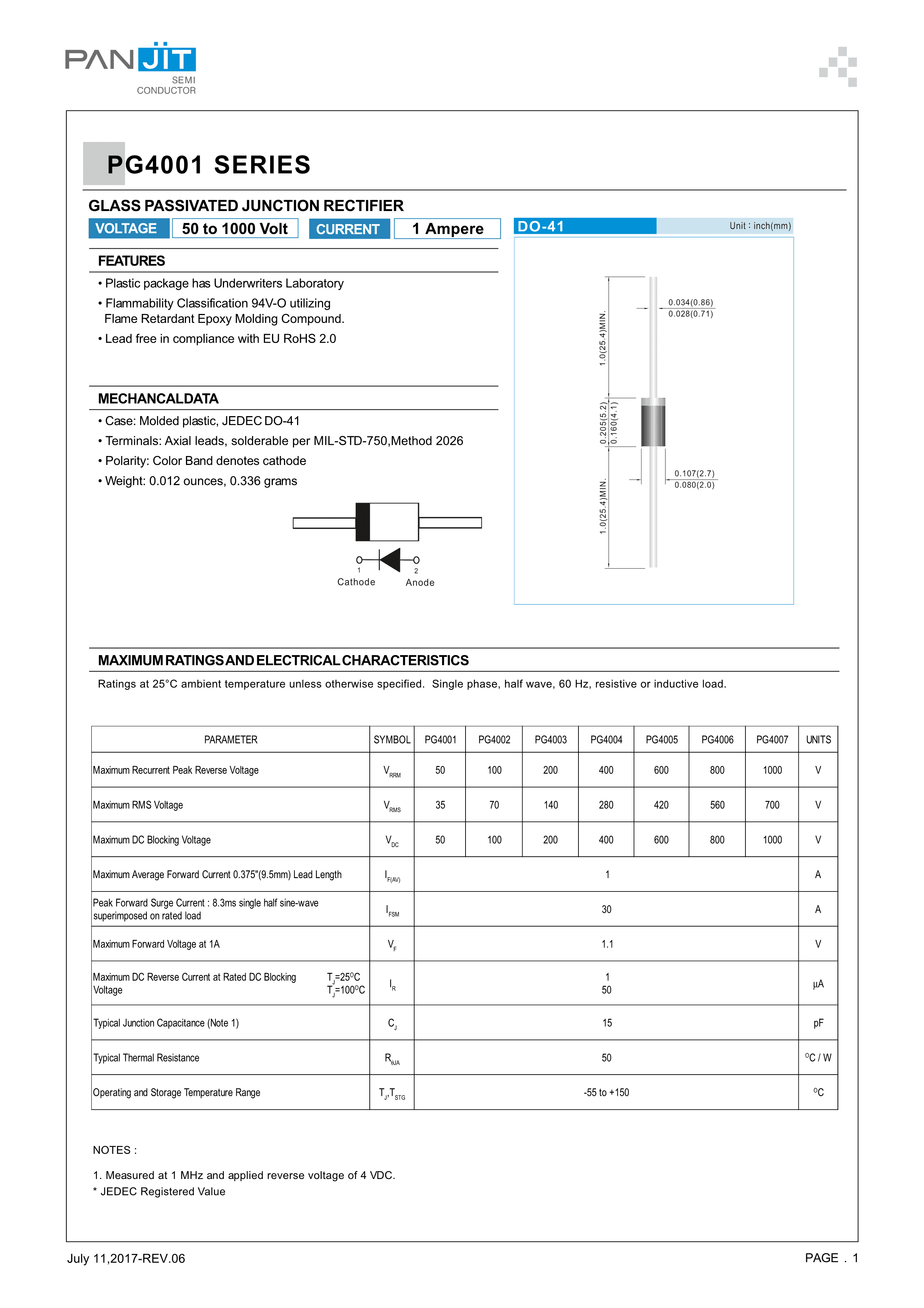 PG4007_AY_10001数据手册DO-41封装PANJIT(强茂)PDF规格书,中英文下载