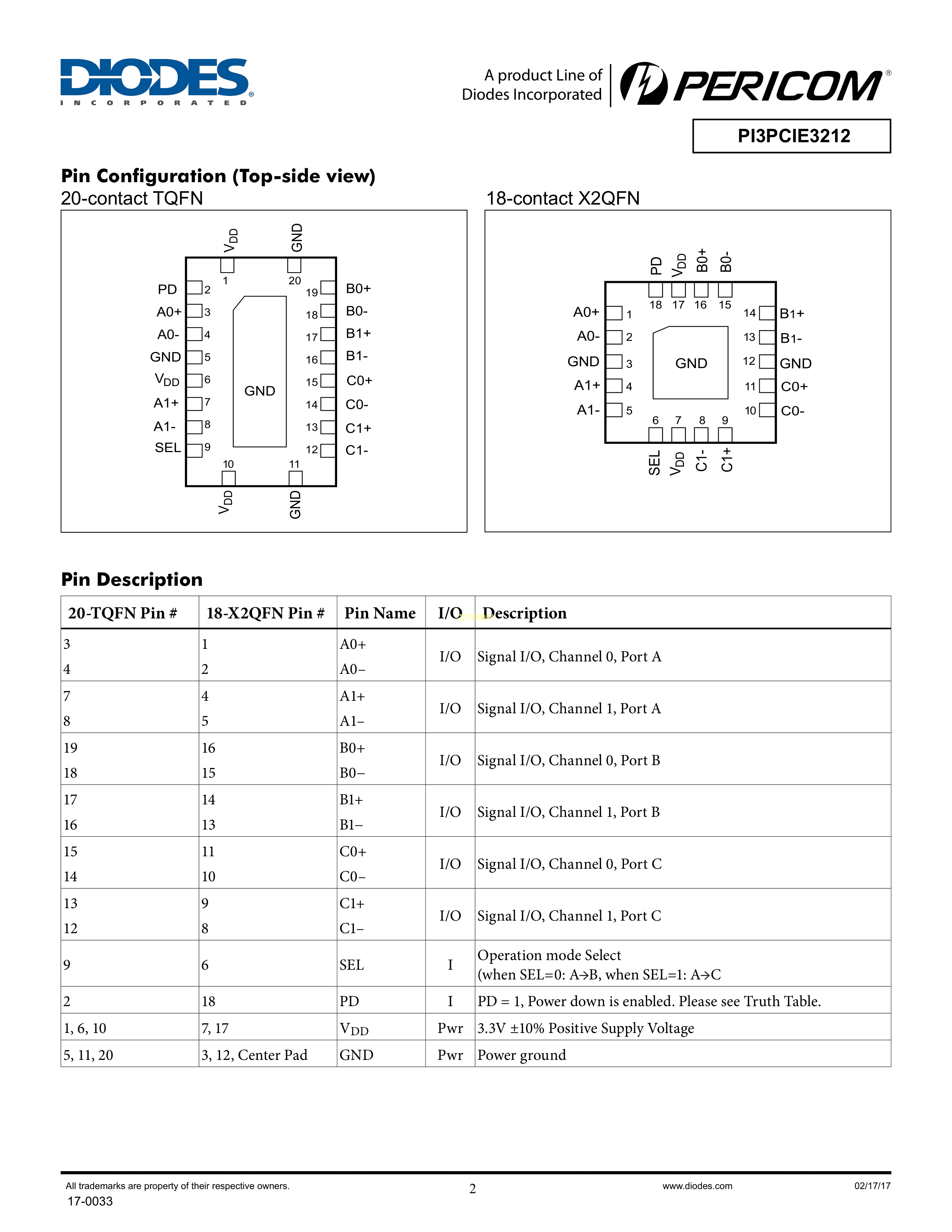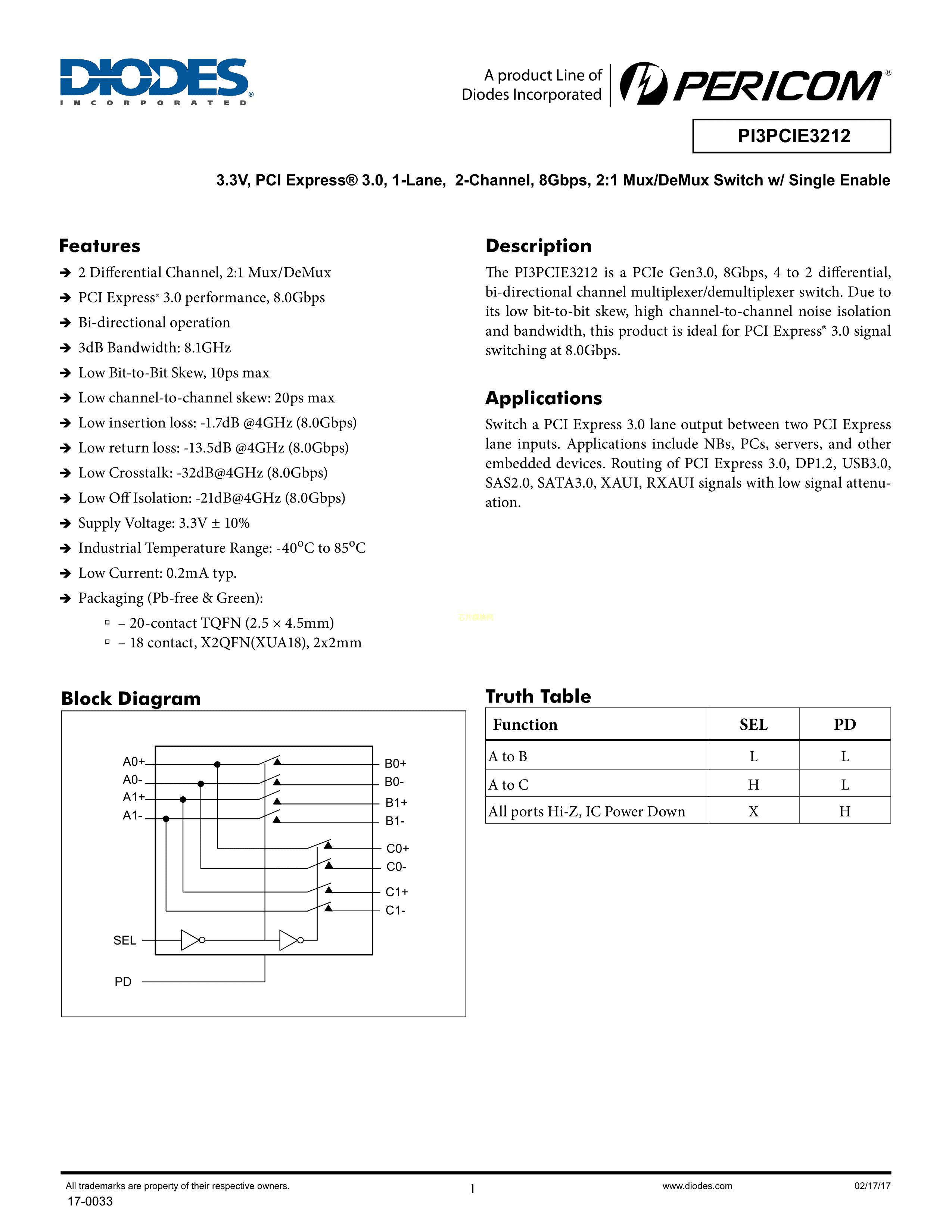PI3PCIE3212ZBEX数据手册TQFN-20_2.5x4.5x05P封装DIODES(美台)