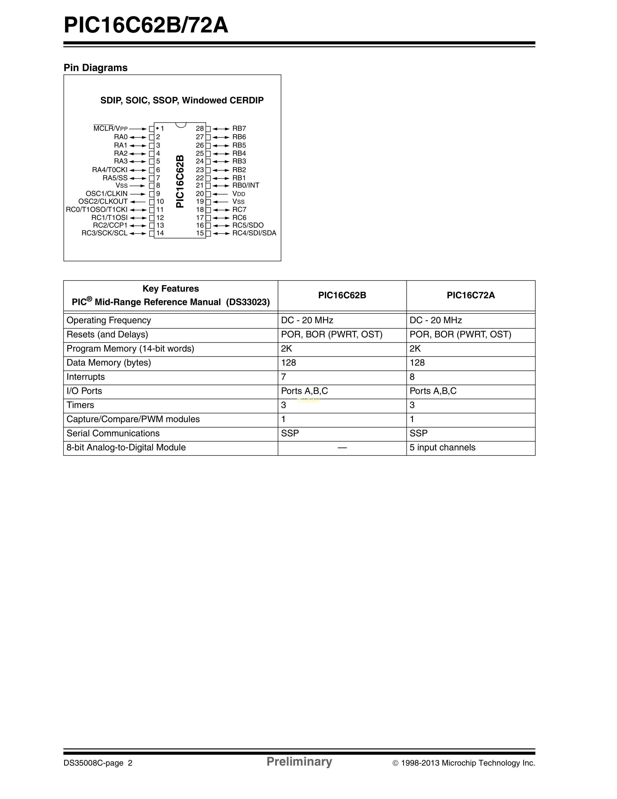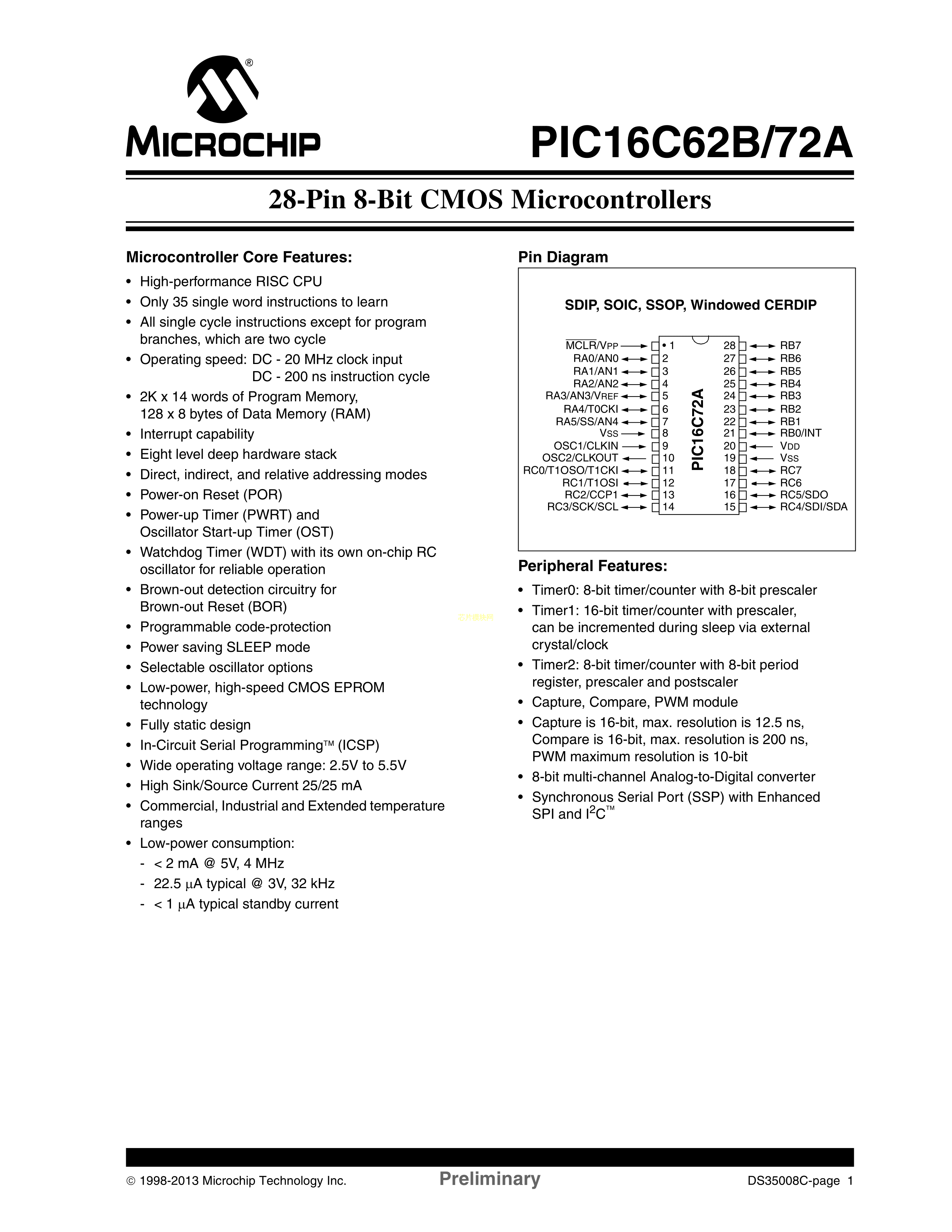 PIC16C62B-20-SP数据手册SPDIP-28封装MICROCHIP(美国微芯)PDF规格书
