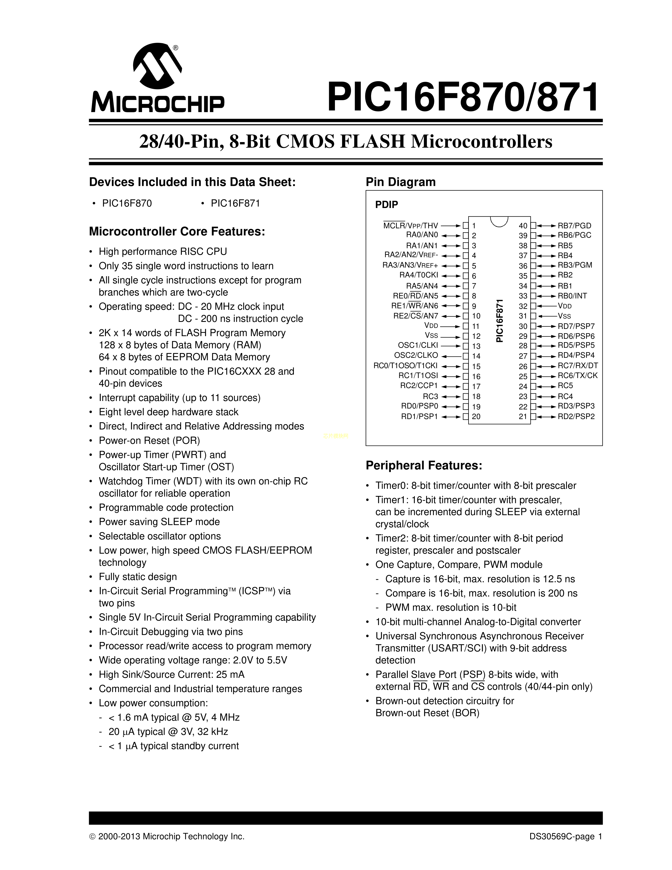 PIC16F871-I-P数据手册PDIP-40封装MICROCHIP(美国微芯)PDF规格书,中英