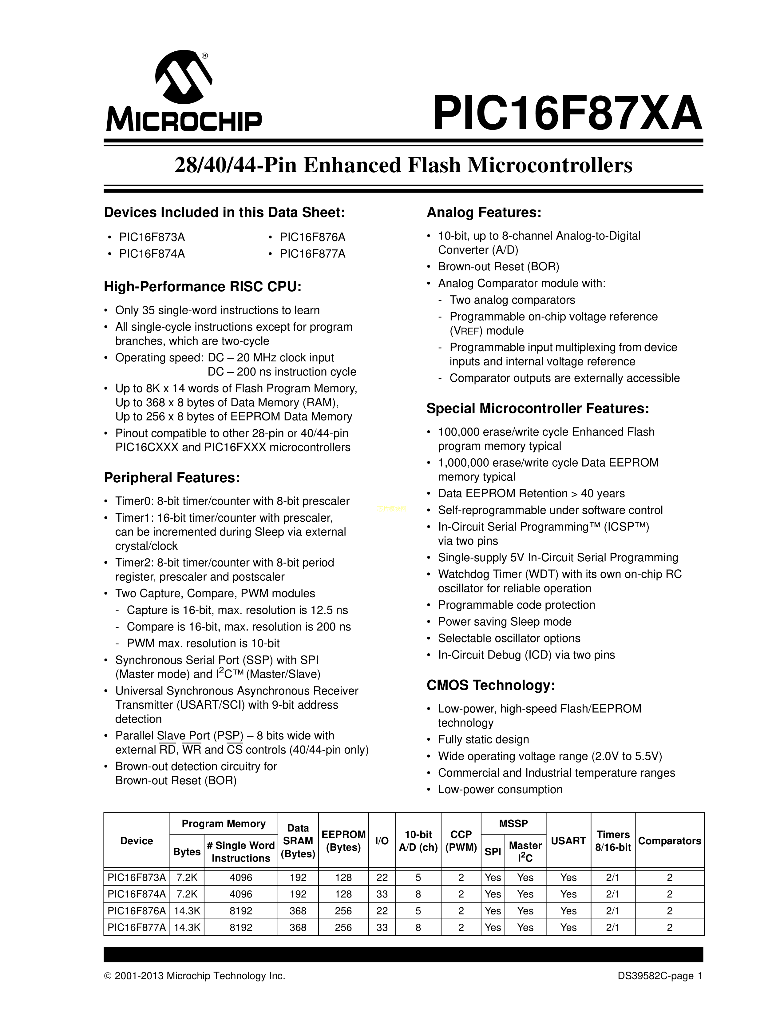 PIC16F874A-I-L数据手册PLCC-44封装MICROCHIP(美国微芯)PDF规格书,中