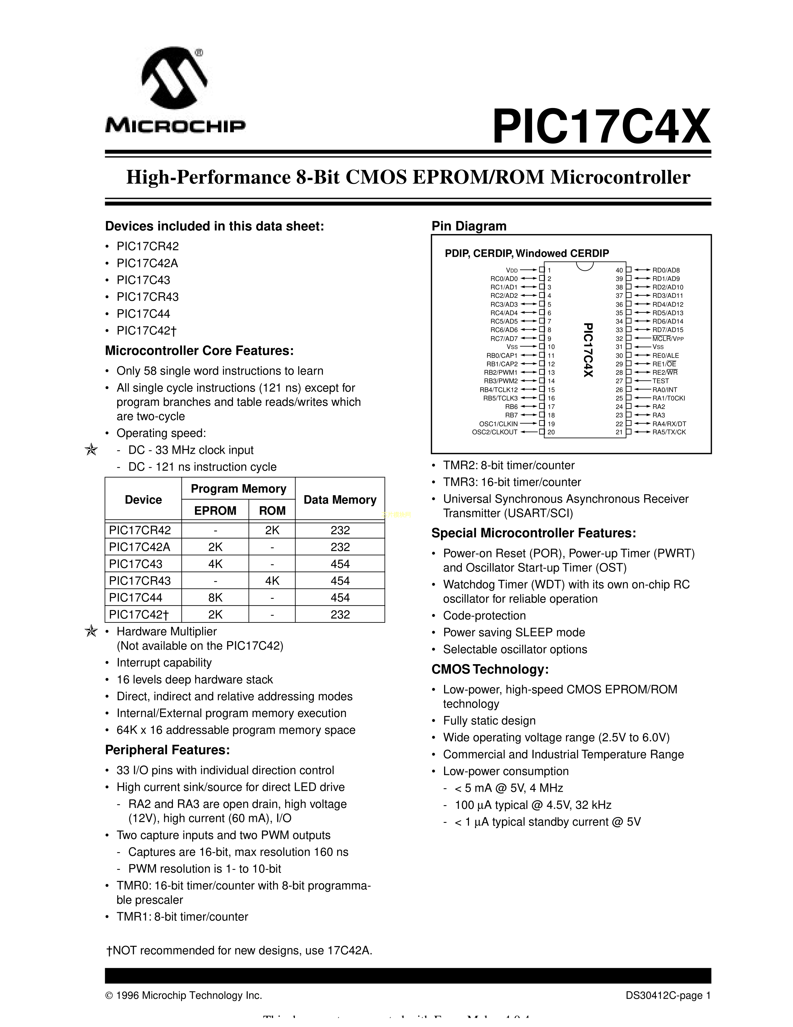 PIC17C42A-33I-P数据手册PDIP-40封装MICROCHIP(美国微芯)PDF规格书,