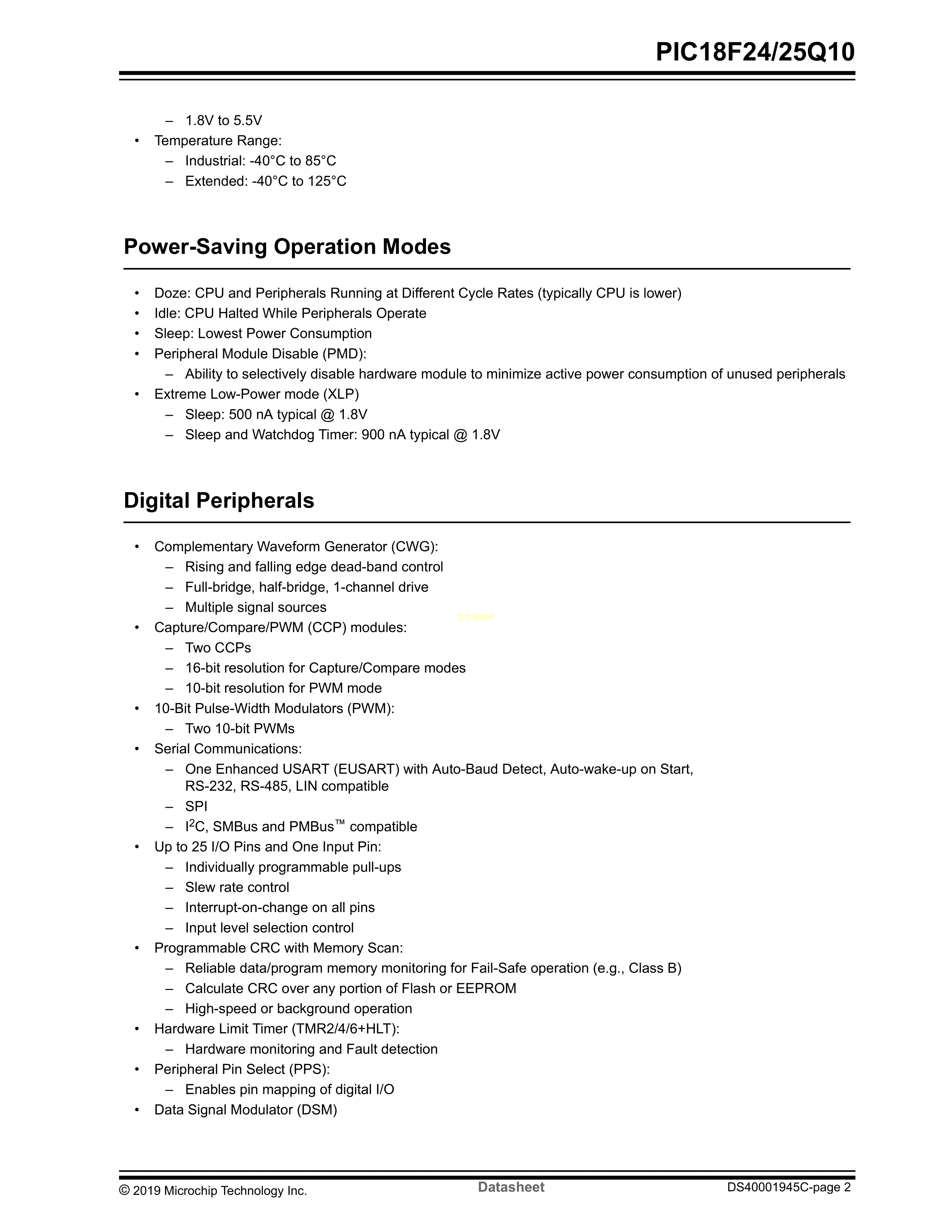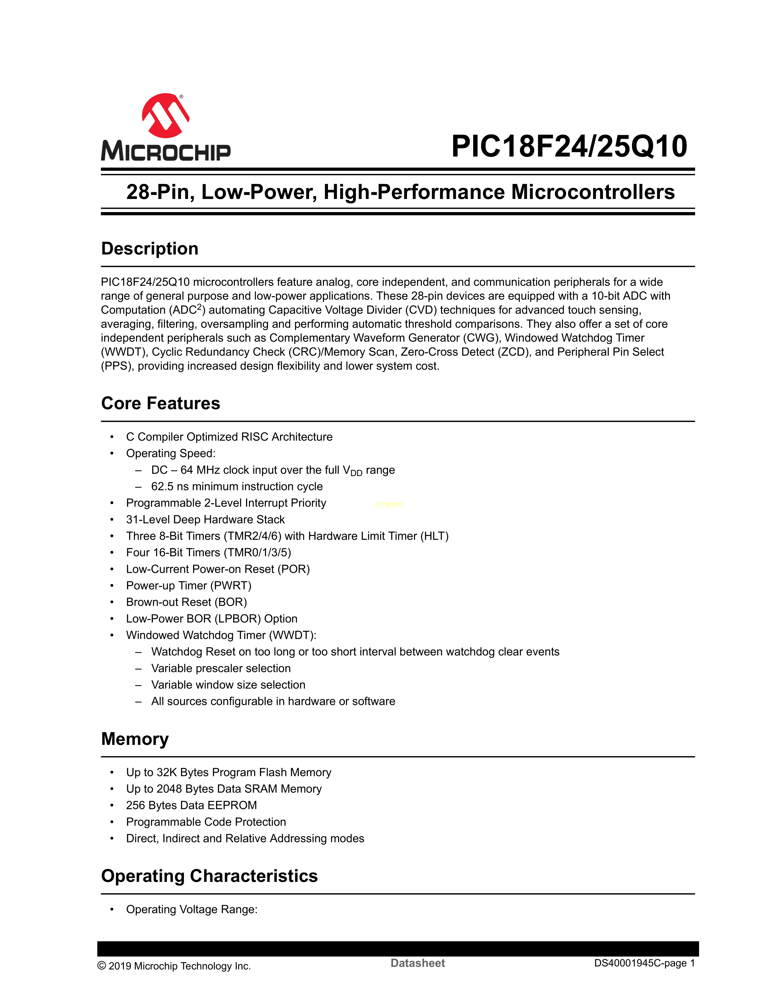 PIC18F25Q10-I-SP数据手册SPDIP-28封装MICROCHIP(美国微芯)PDF规格书,中英文下载