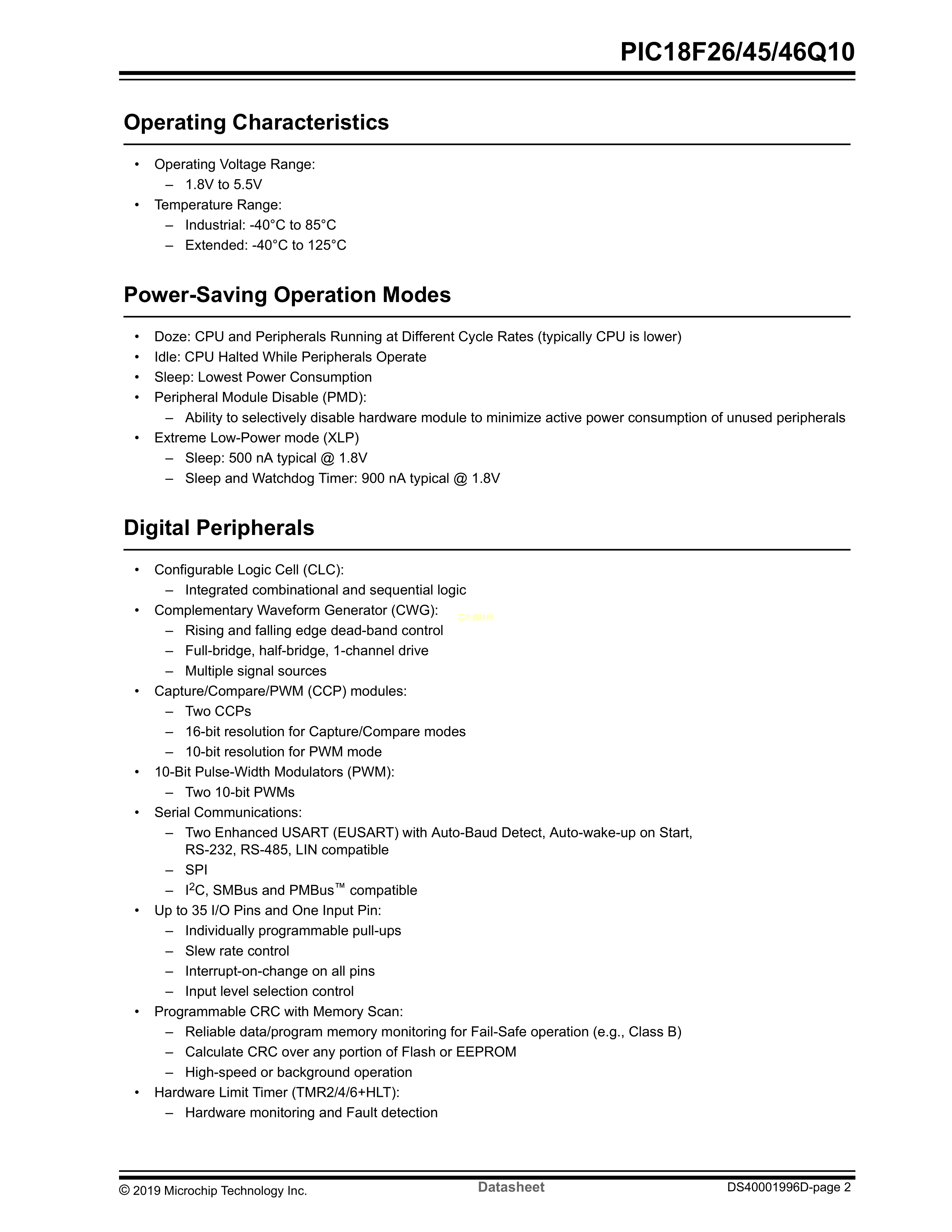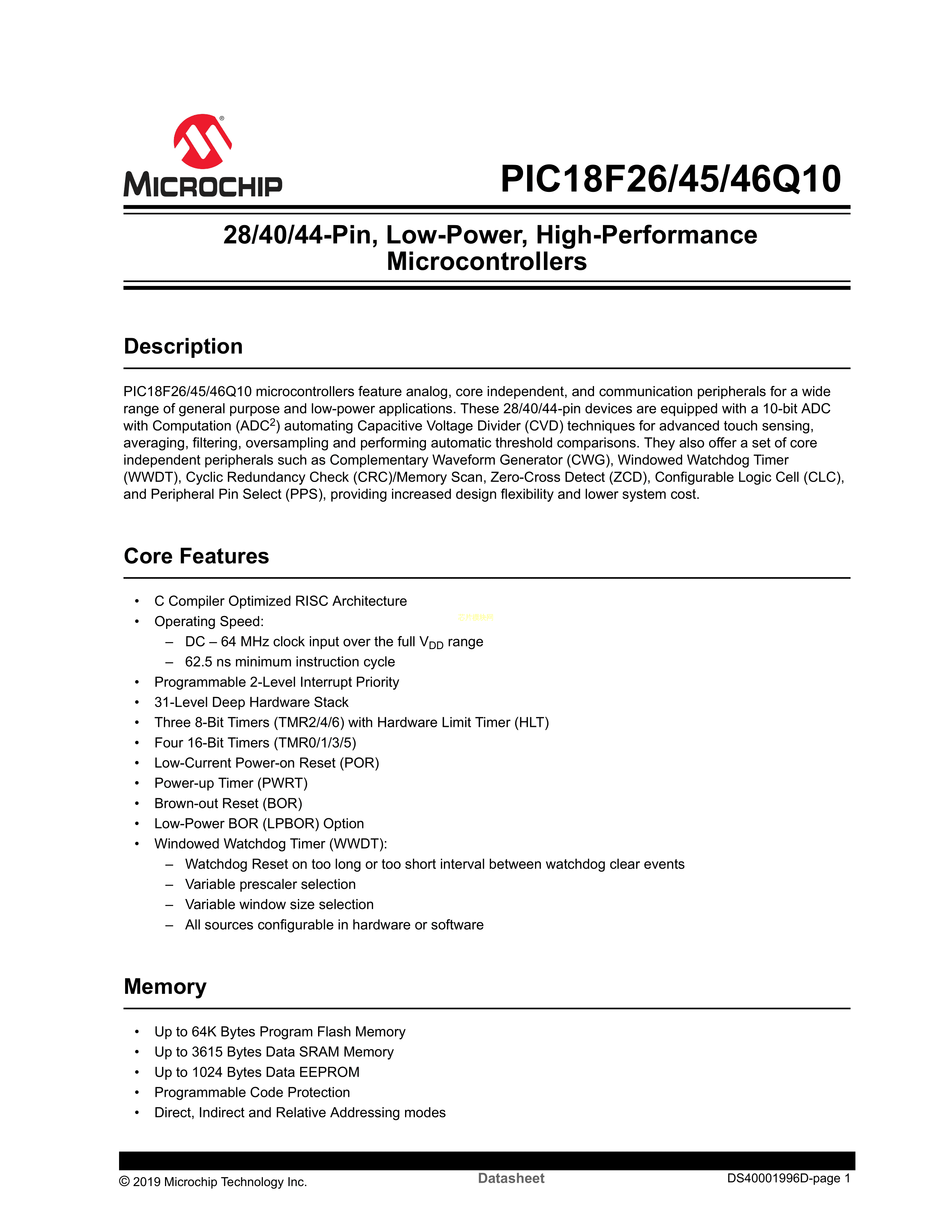 PIC18F46Q10-I-P数据手册PDIP-40封装MICROCHIP(美国微芯)PDF规格书,中英文下载