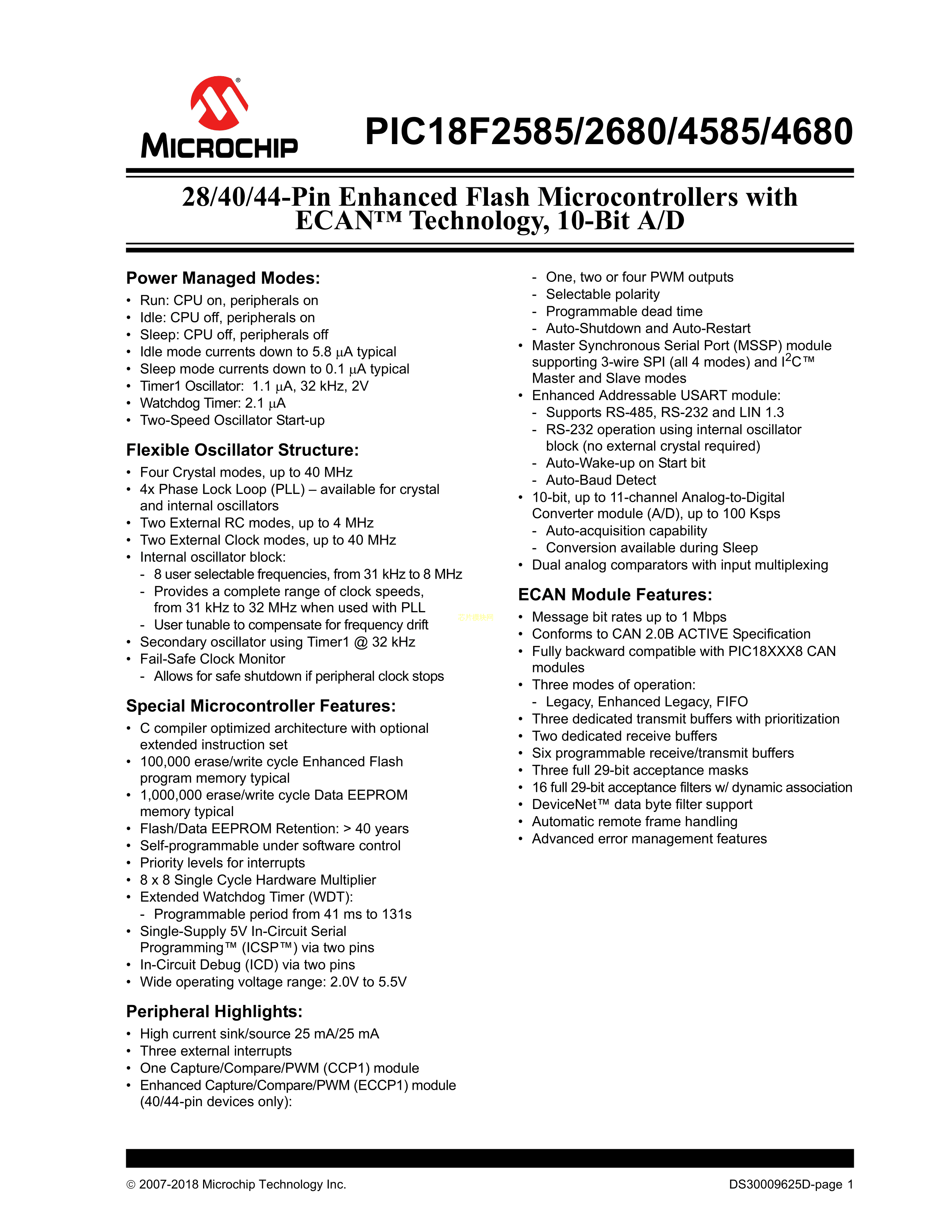 PIC18LF4585-I-P数据手册PDIP-40封装MICROCHIP(美国微芯)PDF规格书,