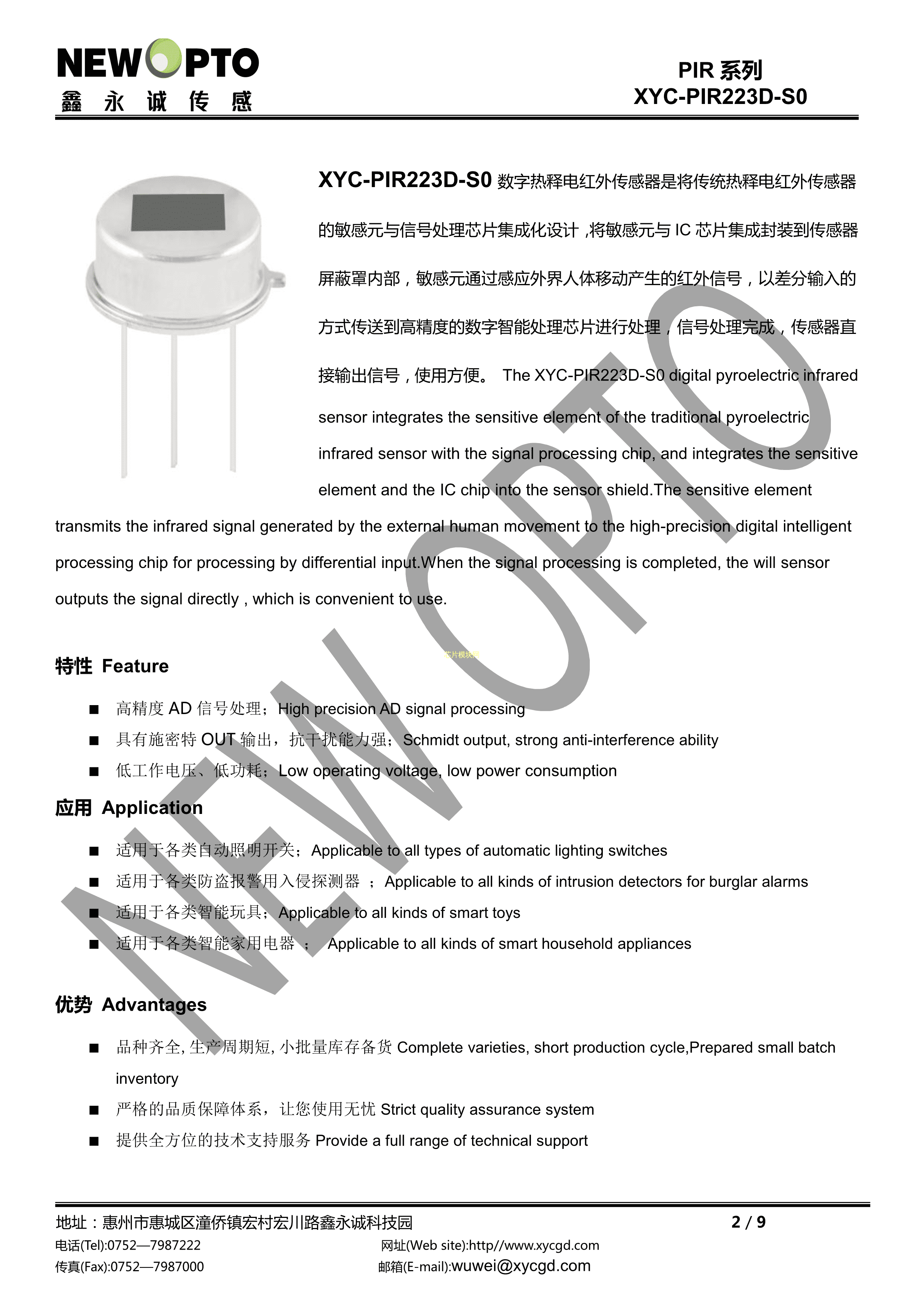 PIR223D-S0数据手册TO-5封装NEWOPTO(鑫永诚光电)PDF规格书,中英文下载
