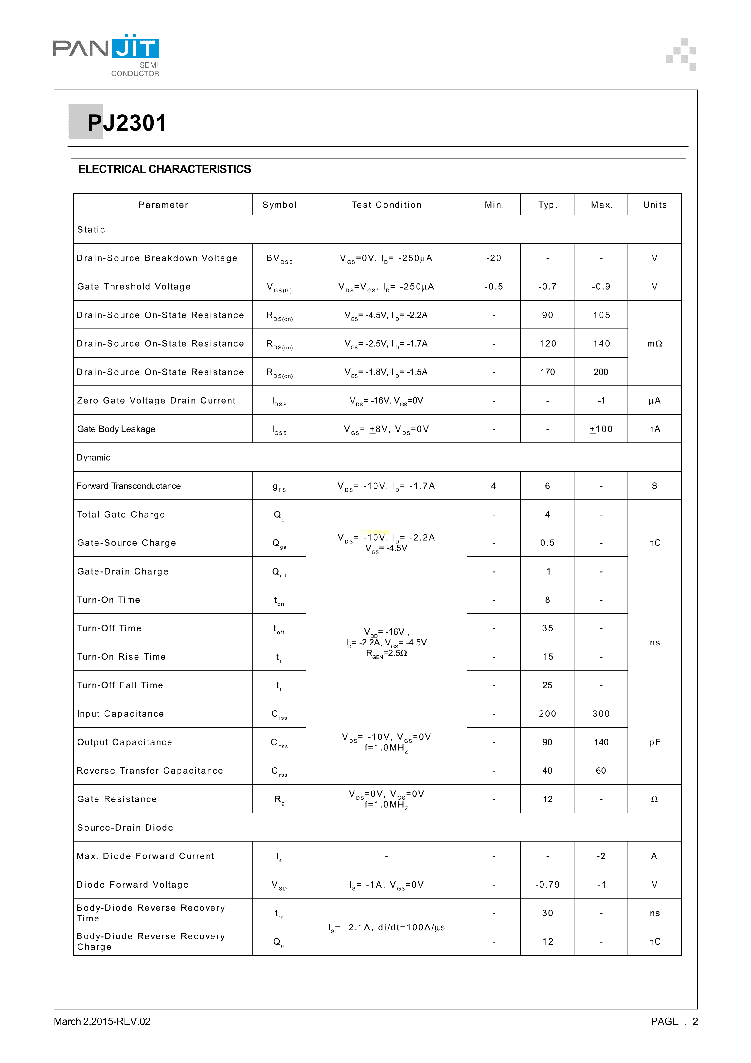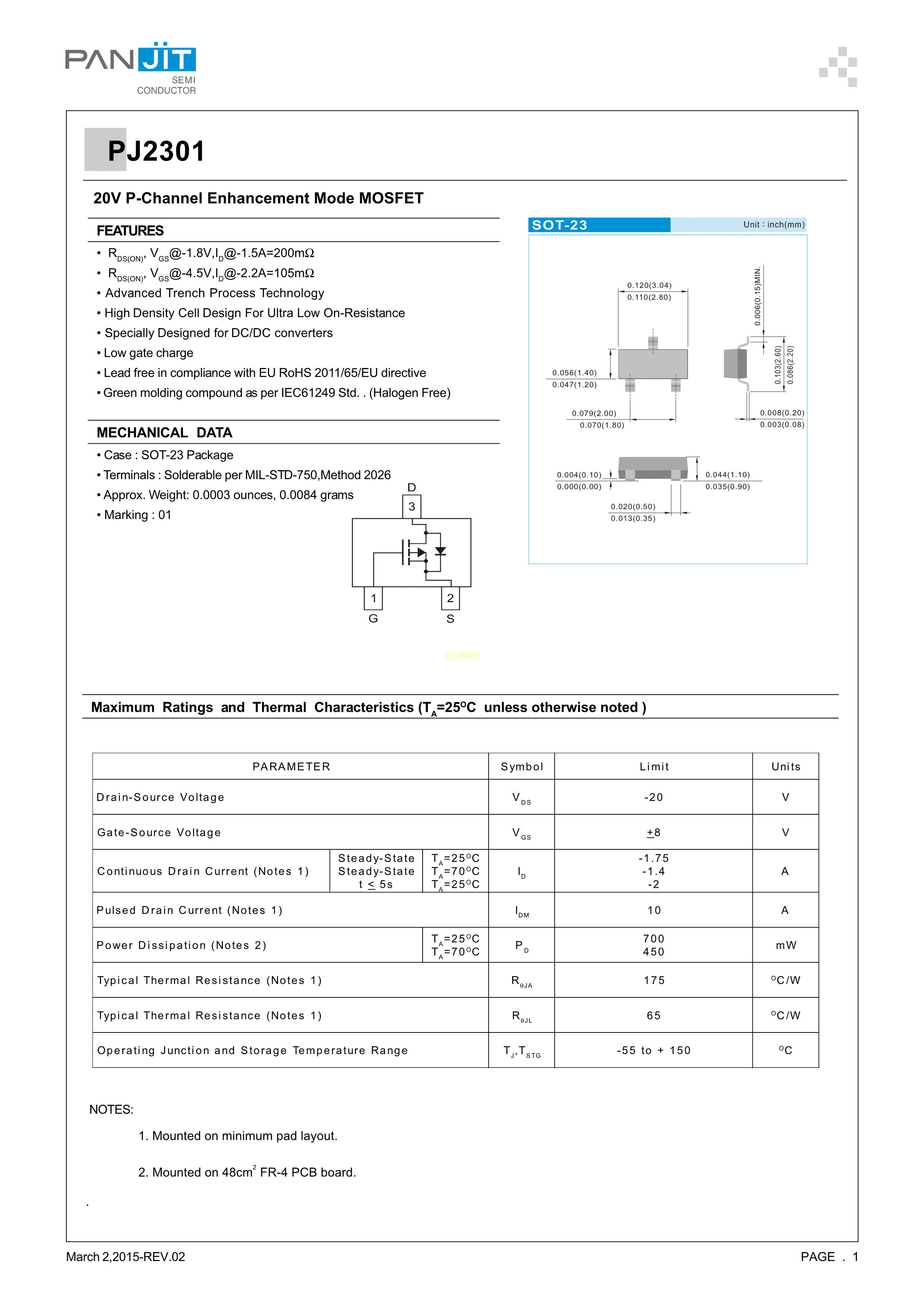 PJ2301数据手册SOT-23封装PANJIT(强茂)PDF规格书,中英文下载