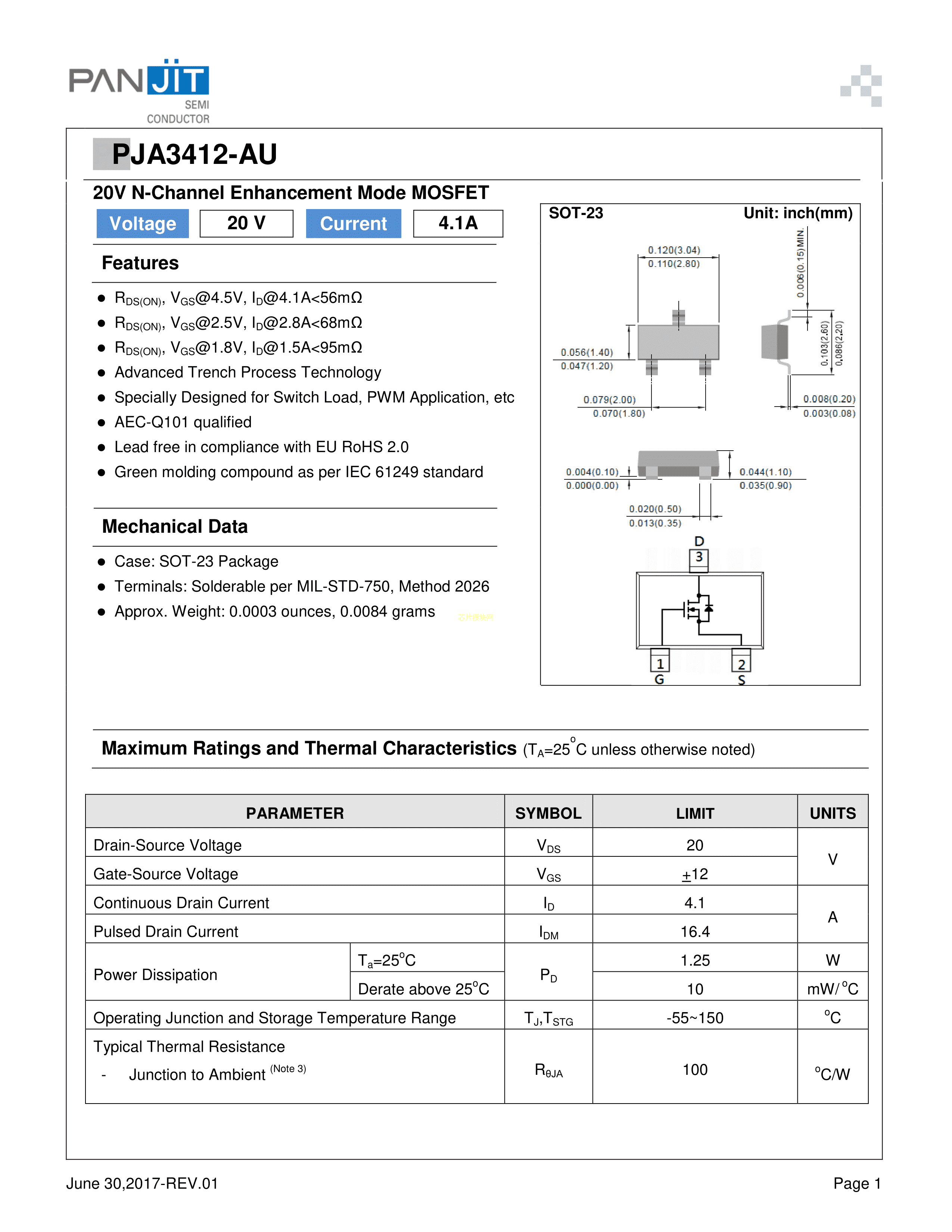 PJA3412-AU数据手册SOT-23封装PANJIT(强茂)PDF规格书,中英文下载