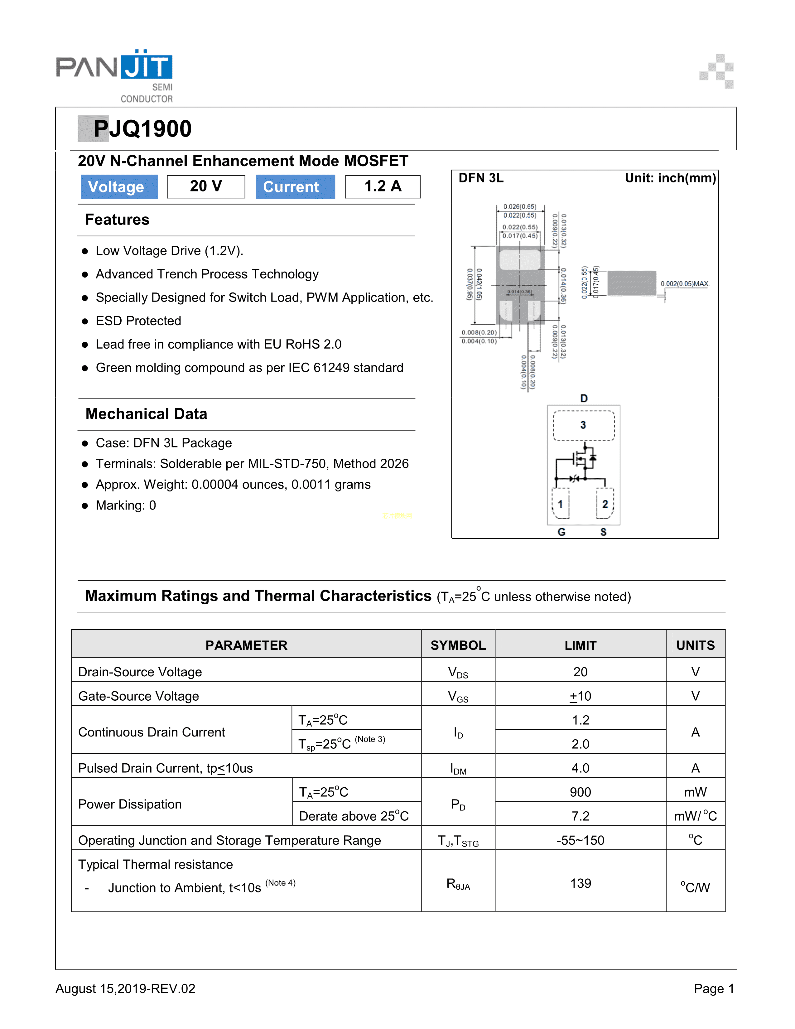 PJQ1900_R1_00001数据手册DFN-3L封装PANJIT(强茂)PDF规格书,中英文下载