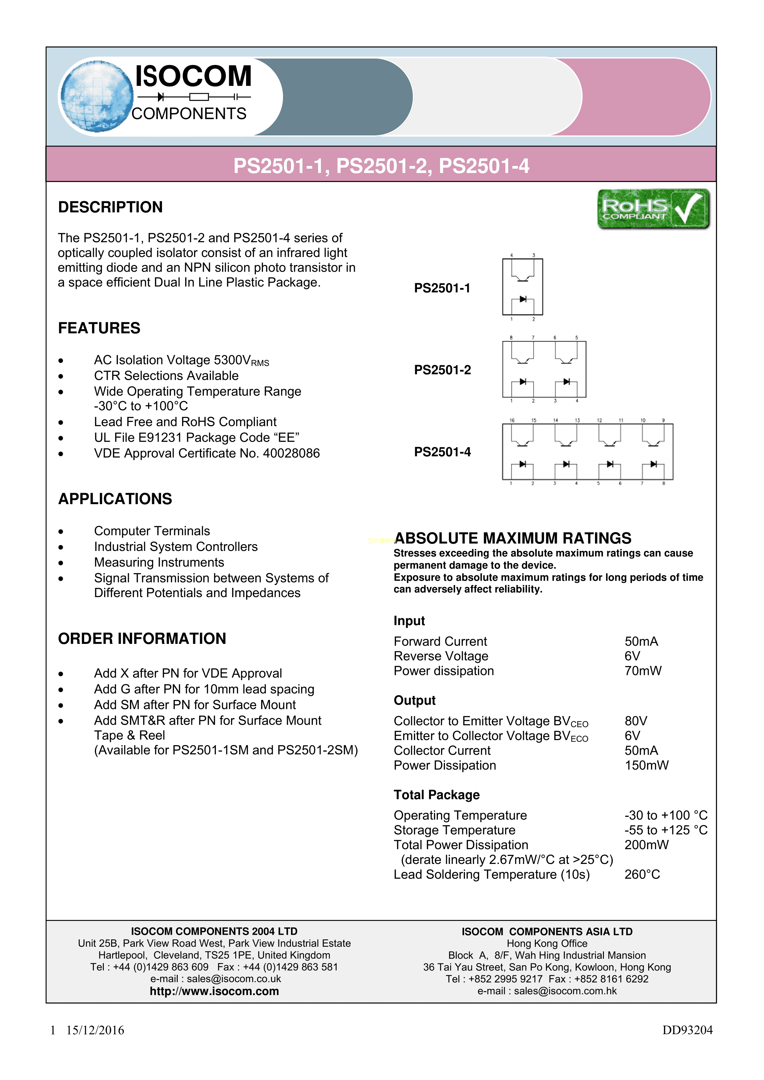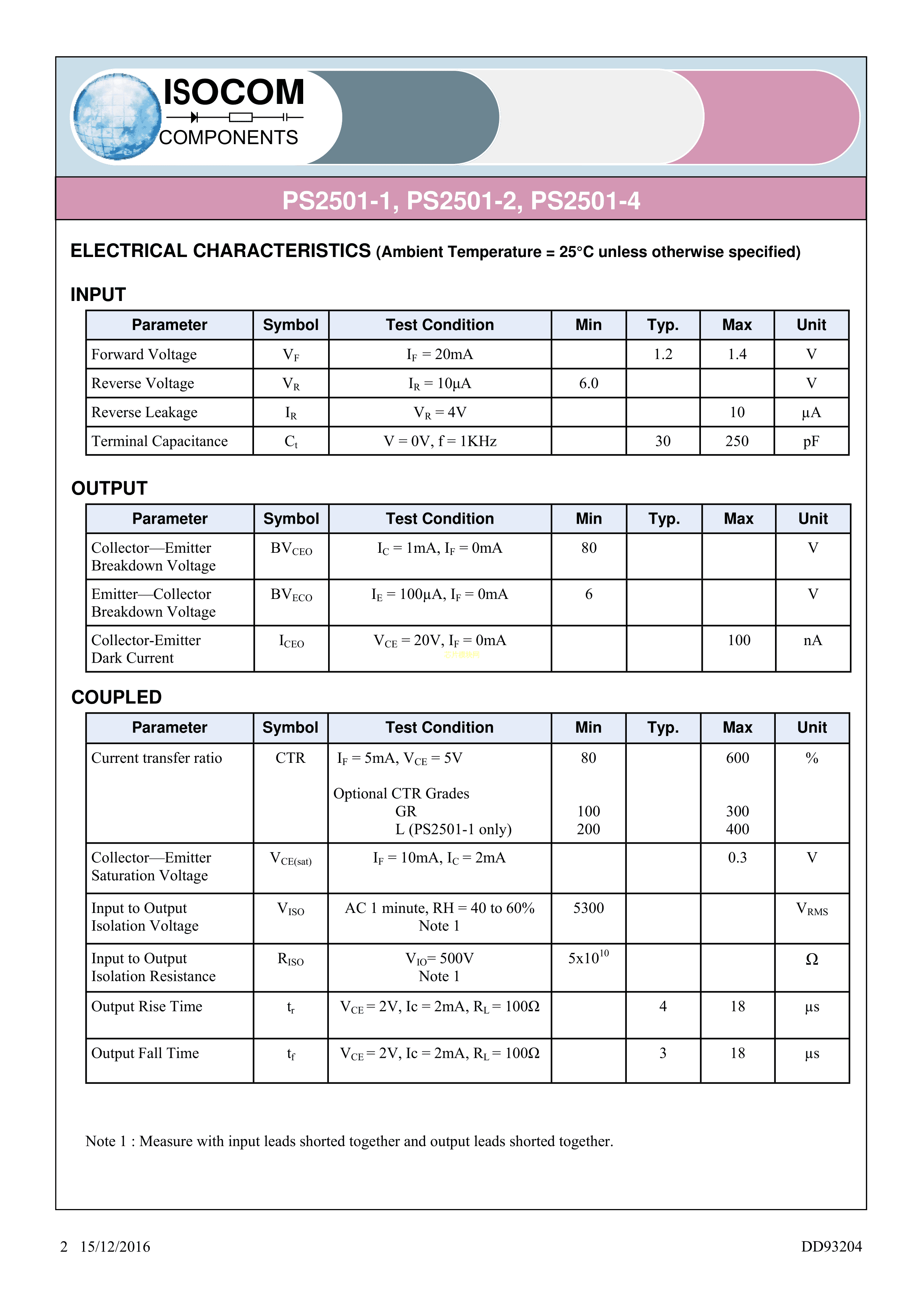 PS2501-1XSM数据手册SMD-4封装ISOCOM(英国安数光)PDF规格书,中英文下载