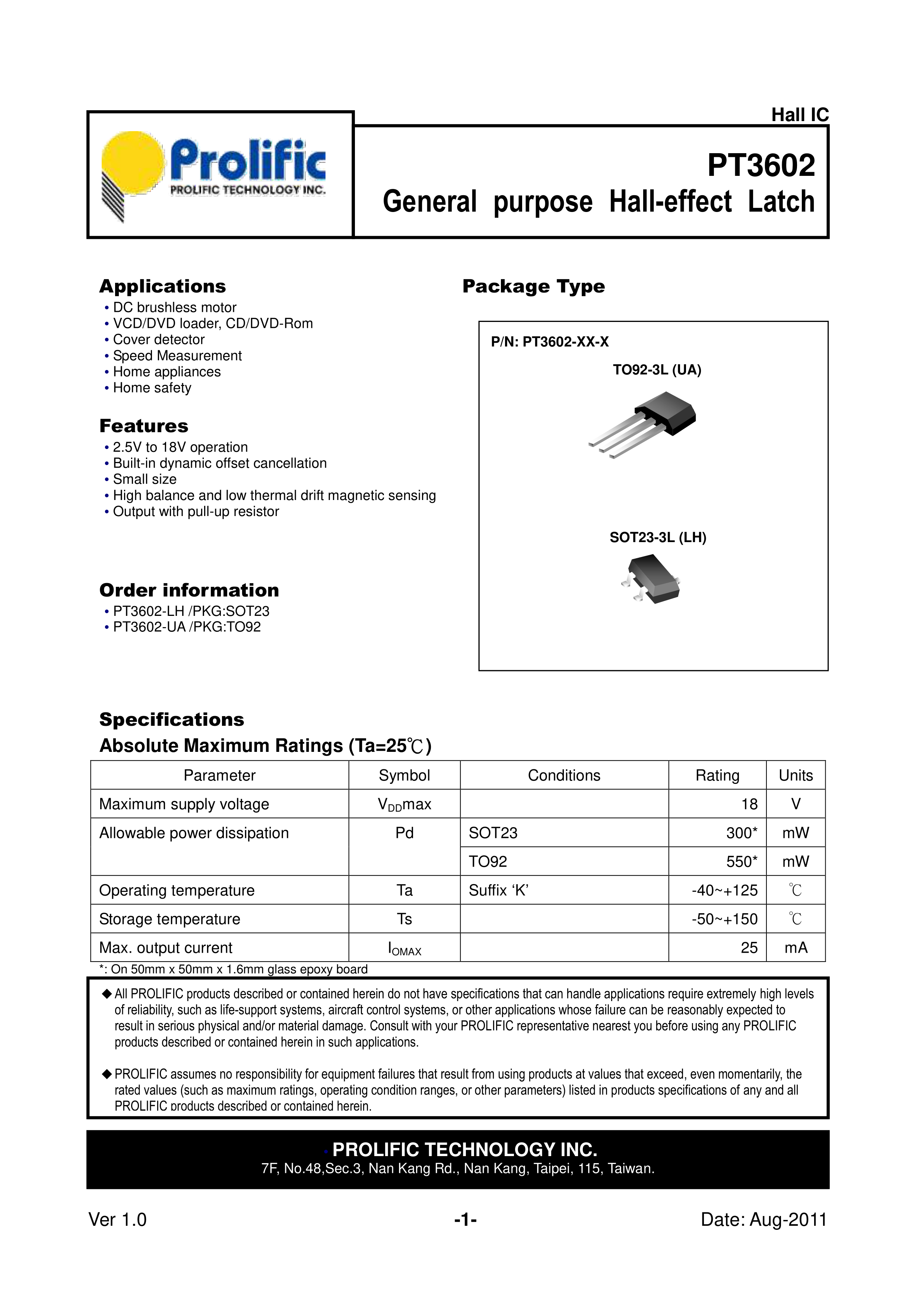PT-3602A LF数据手册SOT-23-3L封装PROLIFIC(旺玖)PDF规格书,中英文下载