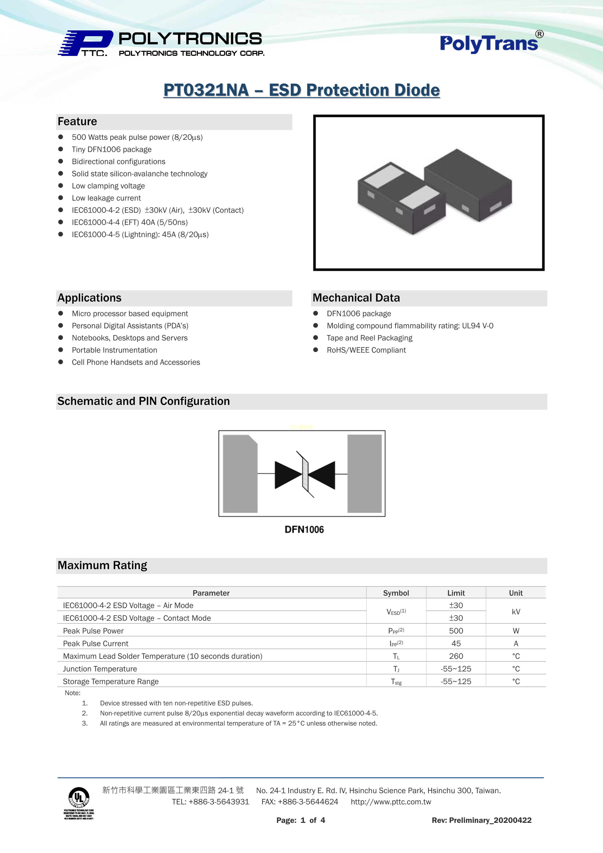 PT0321NA数据手册DFN1006封装PTTC(聚鼎)PDF规格书,中英文下载