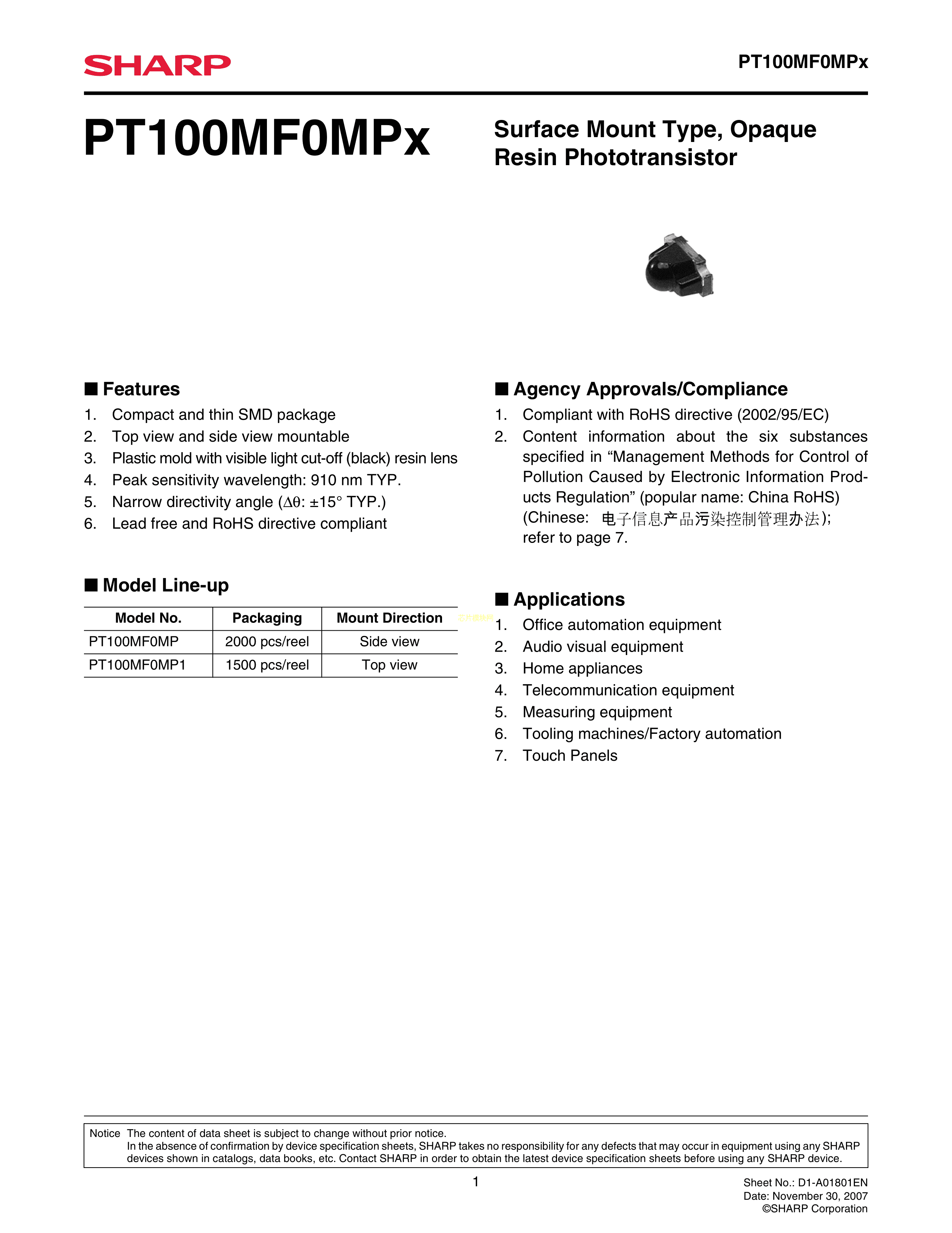 PT100MF0MP1数据手册-封装SHARP(夏普)PDF规格书,中英文下载