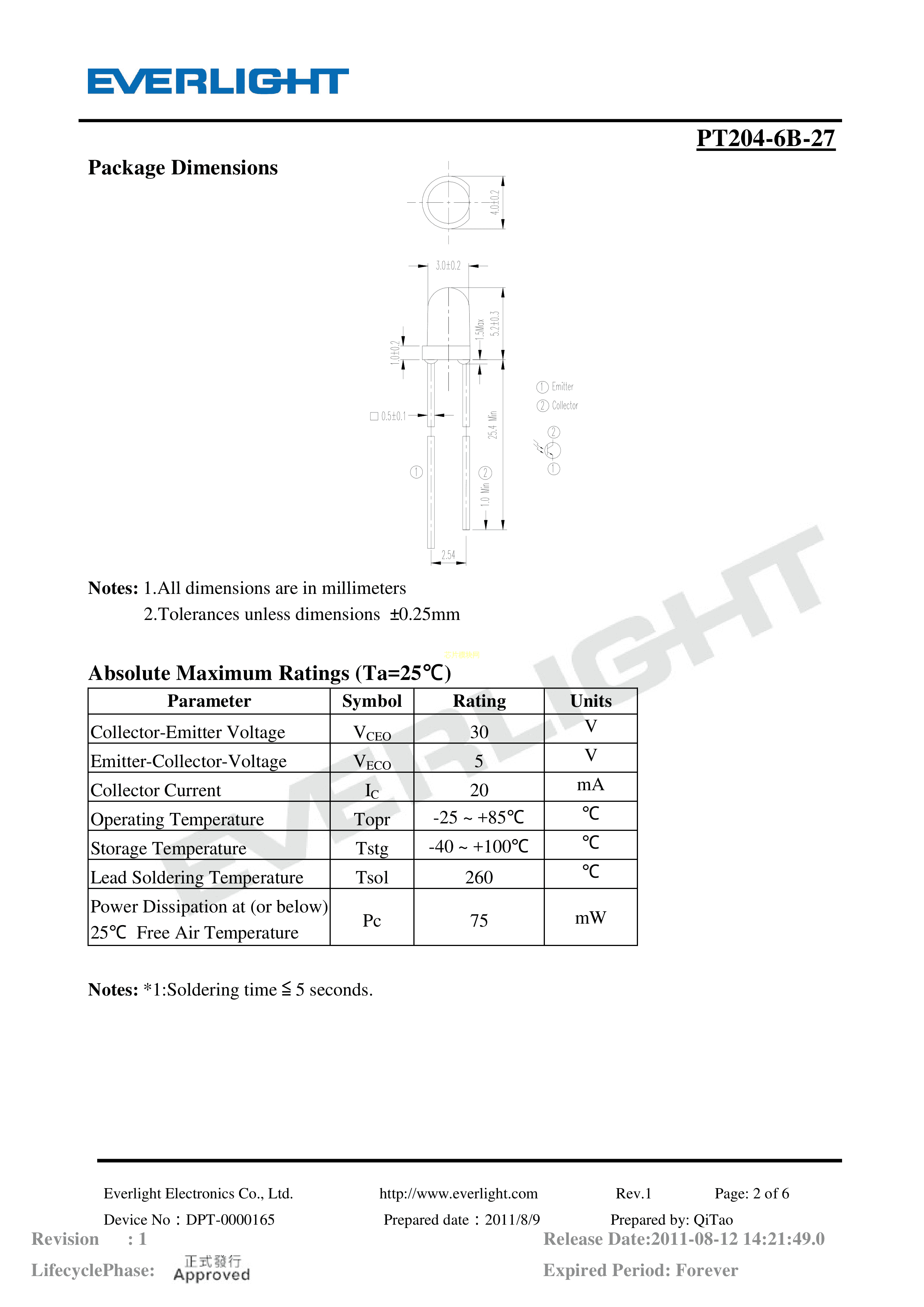 PT204-6B-27数据手册ThroughHole封装EVERLIGHT(台湾亿光)PDF规格书,中英文下载