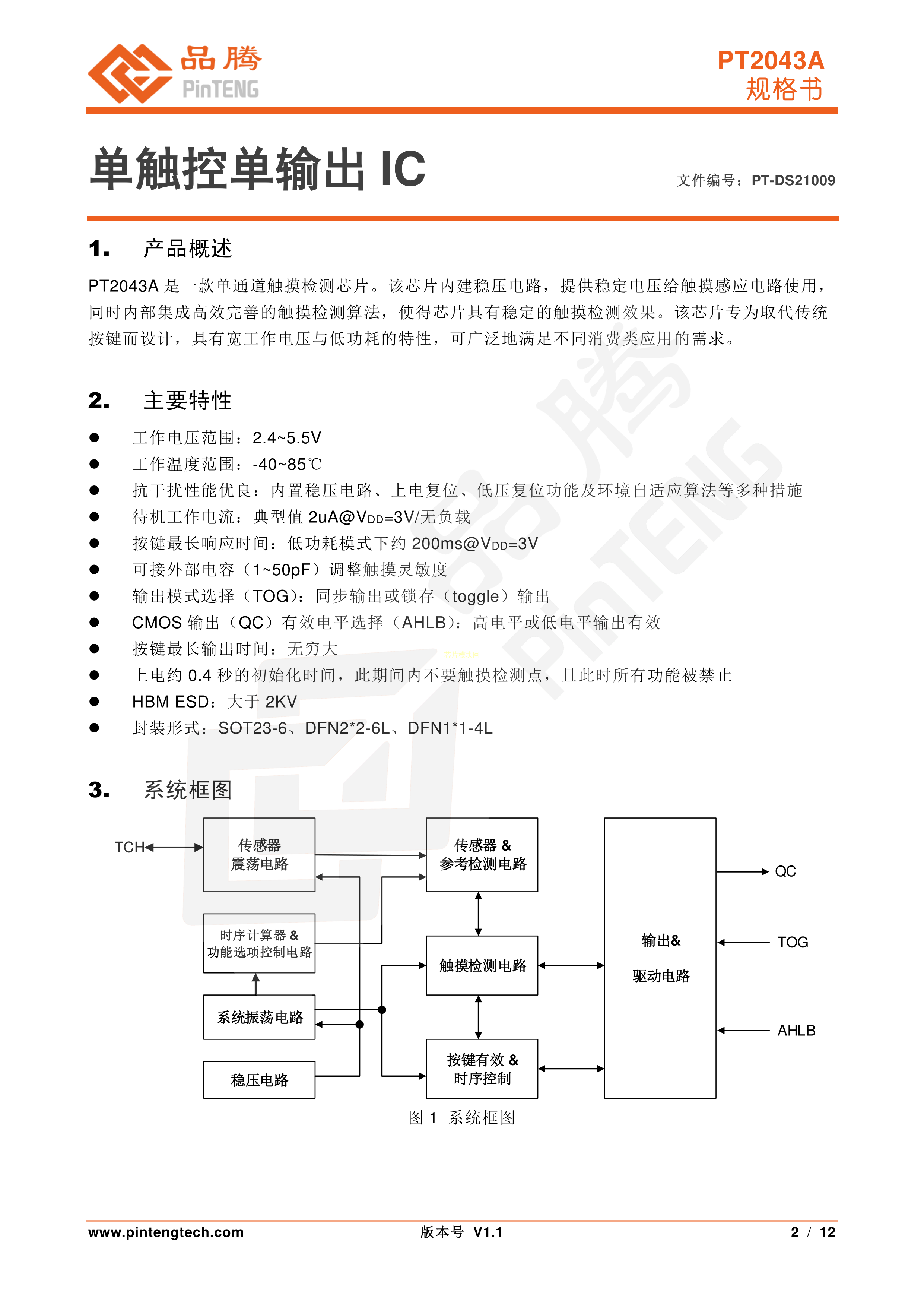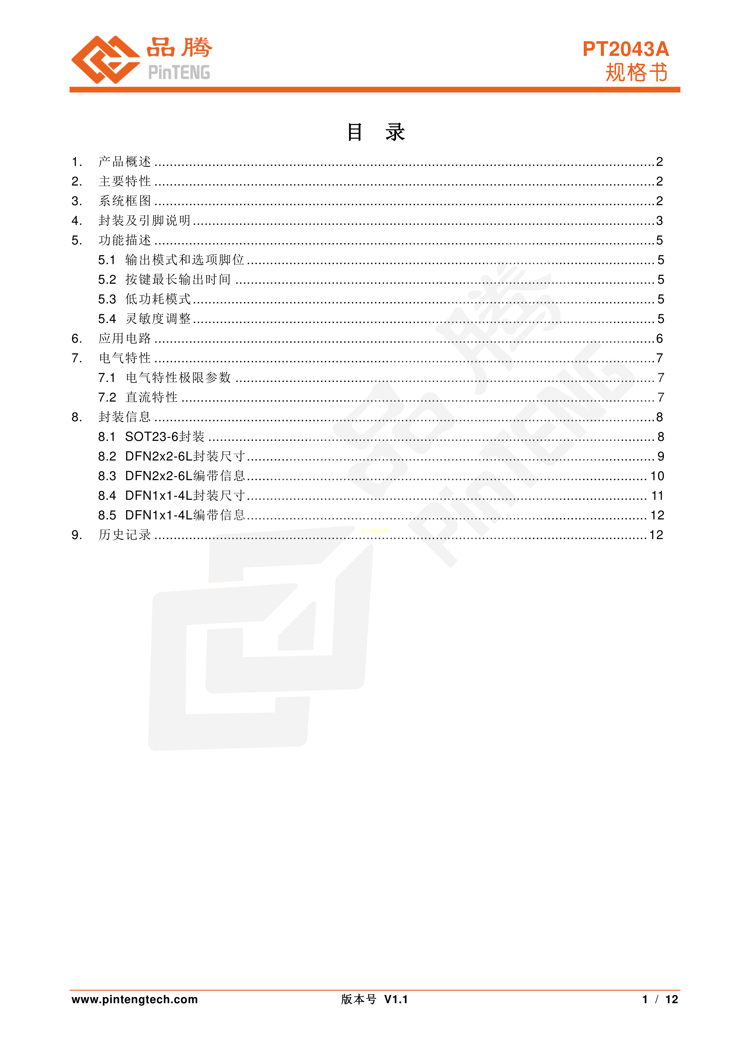 PT2043AT6数据手册SOT-23-6封装PinTENG(品腾)PDF规格书,中英文下载