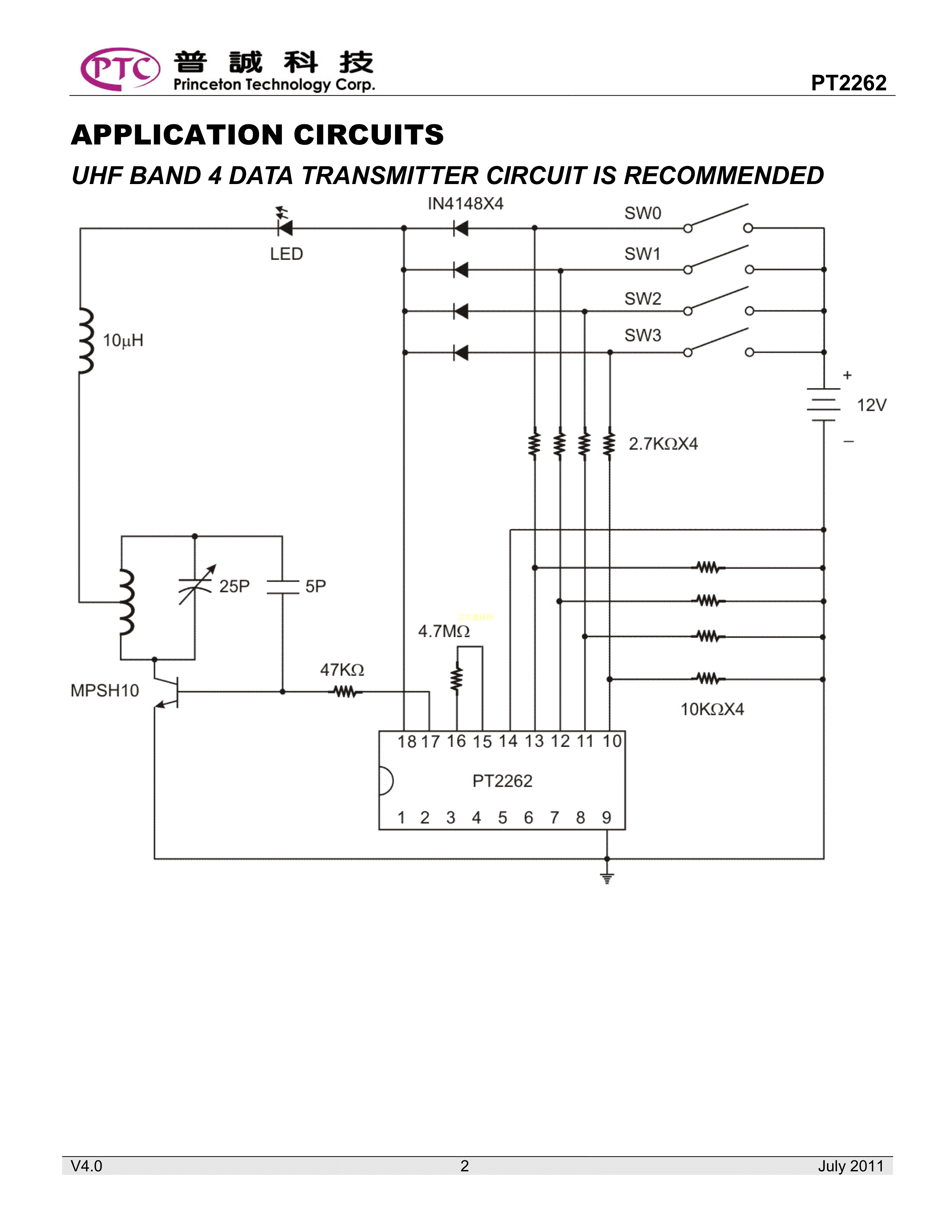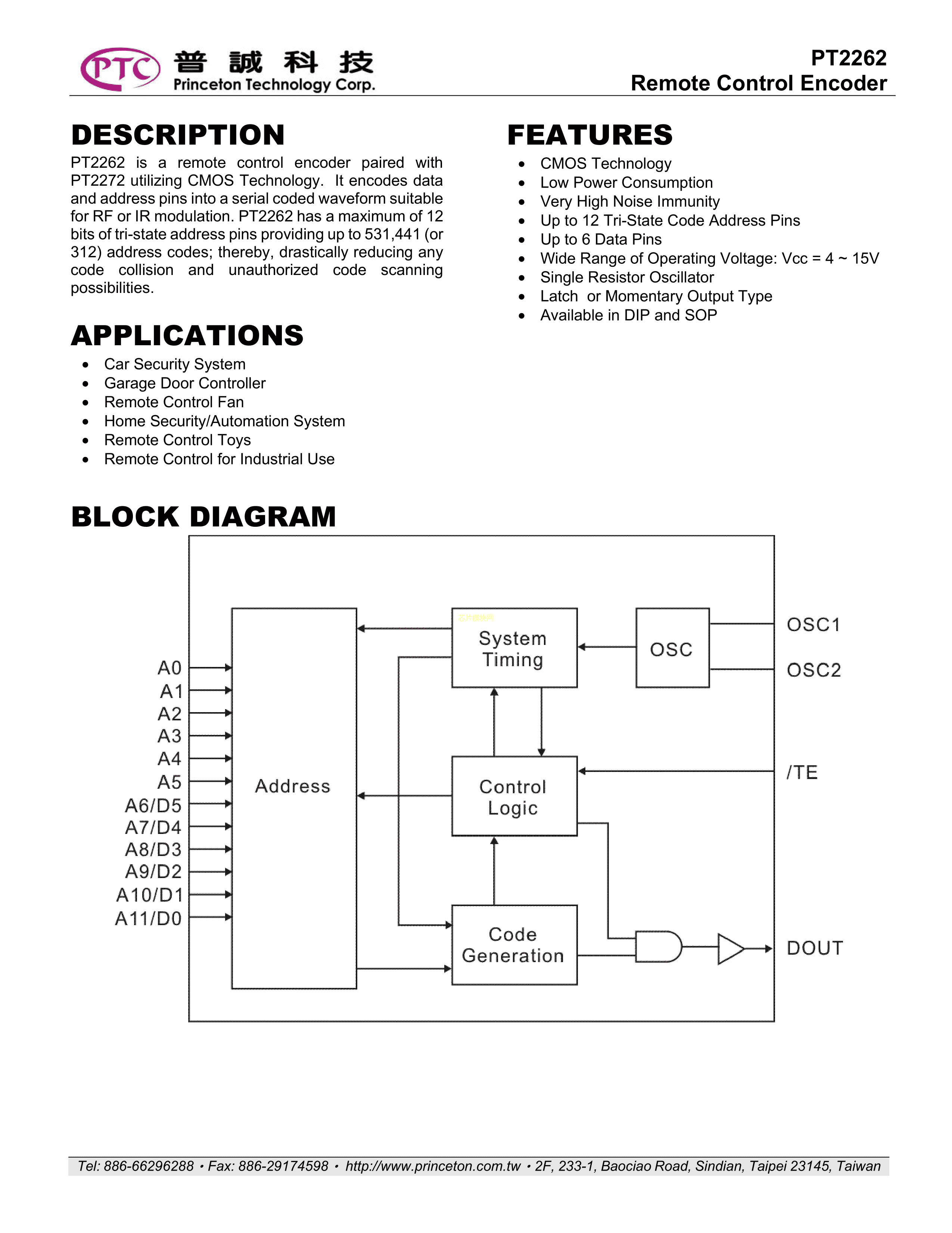 PT2262数据手册DIP-18封装PTC(台湾普诚)PDF规格书,中英文下载