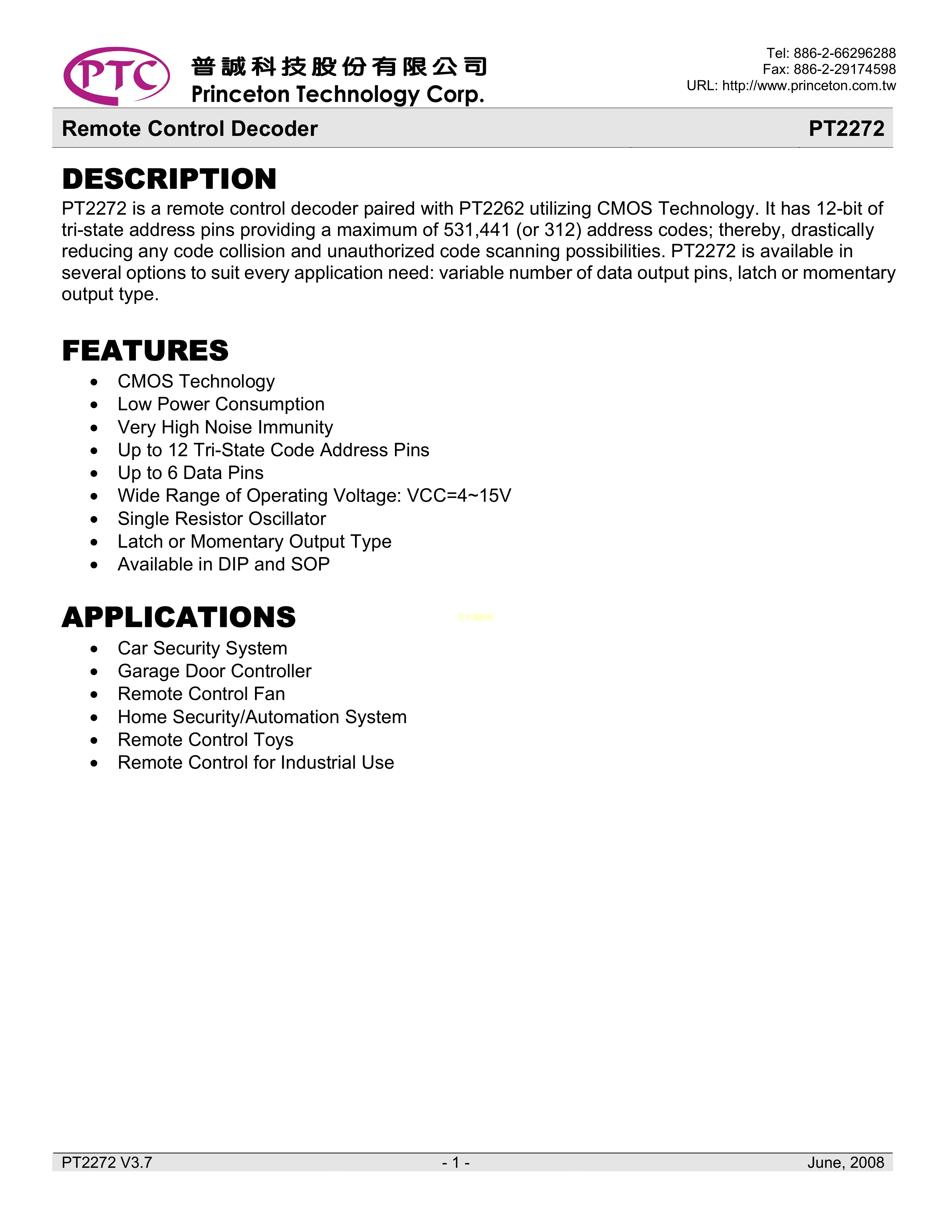 PT2272-L4S数据手册SOP-20_300mil封装PTC(台湾普诚)PDF规格书,中英文下载