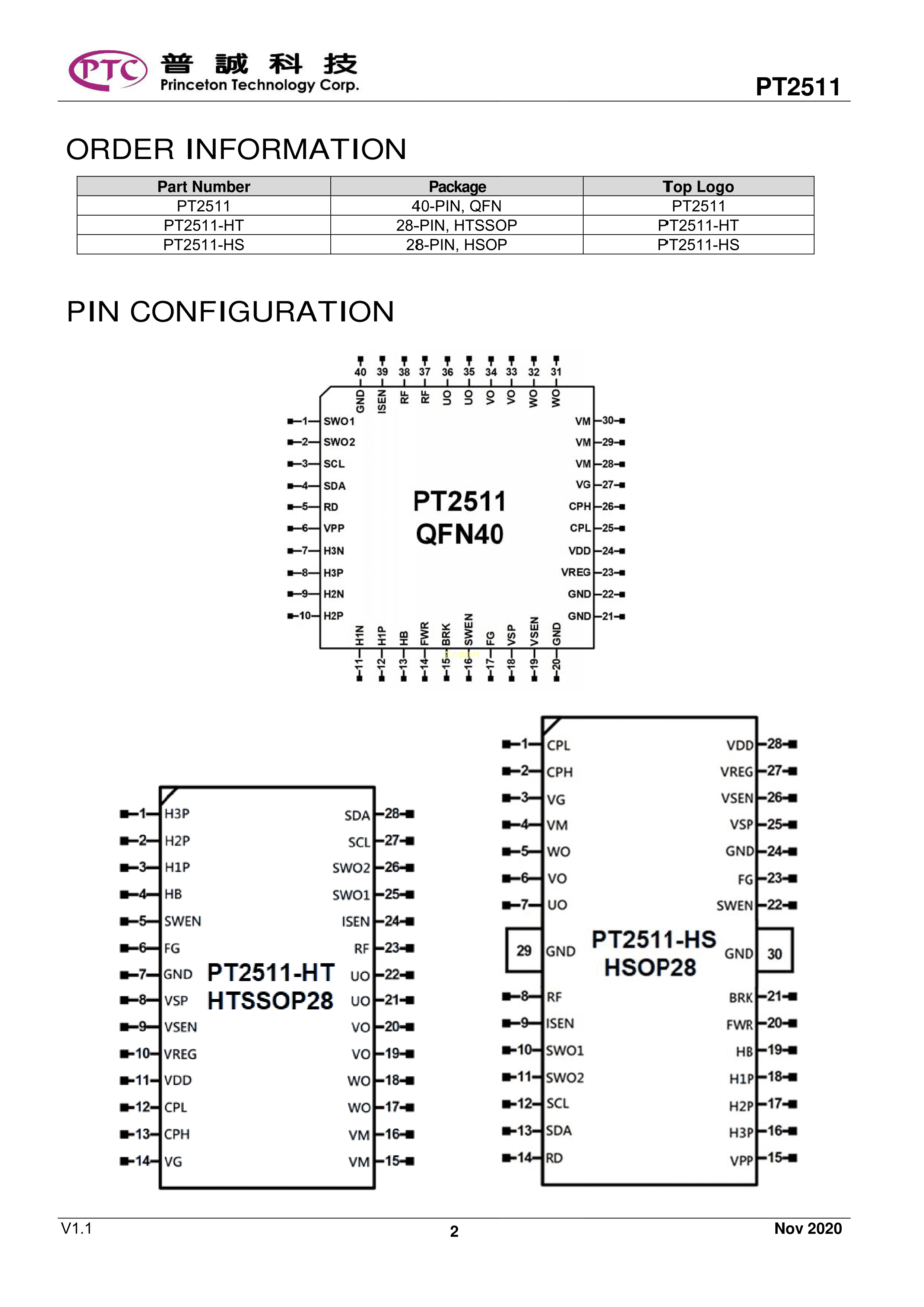 PT2511数据手册QFN-40封装PTC(台湾普诚)PDF规格书,中英文下载