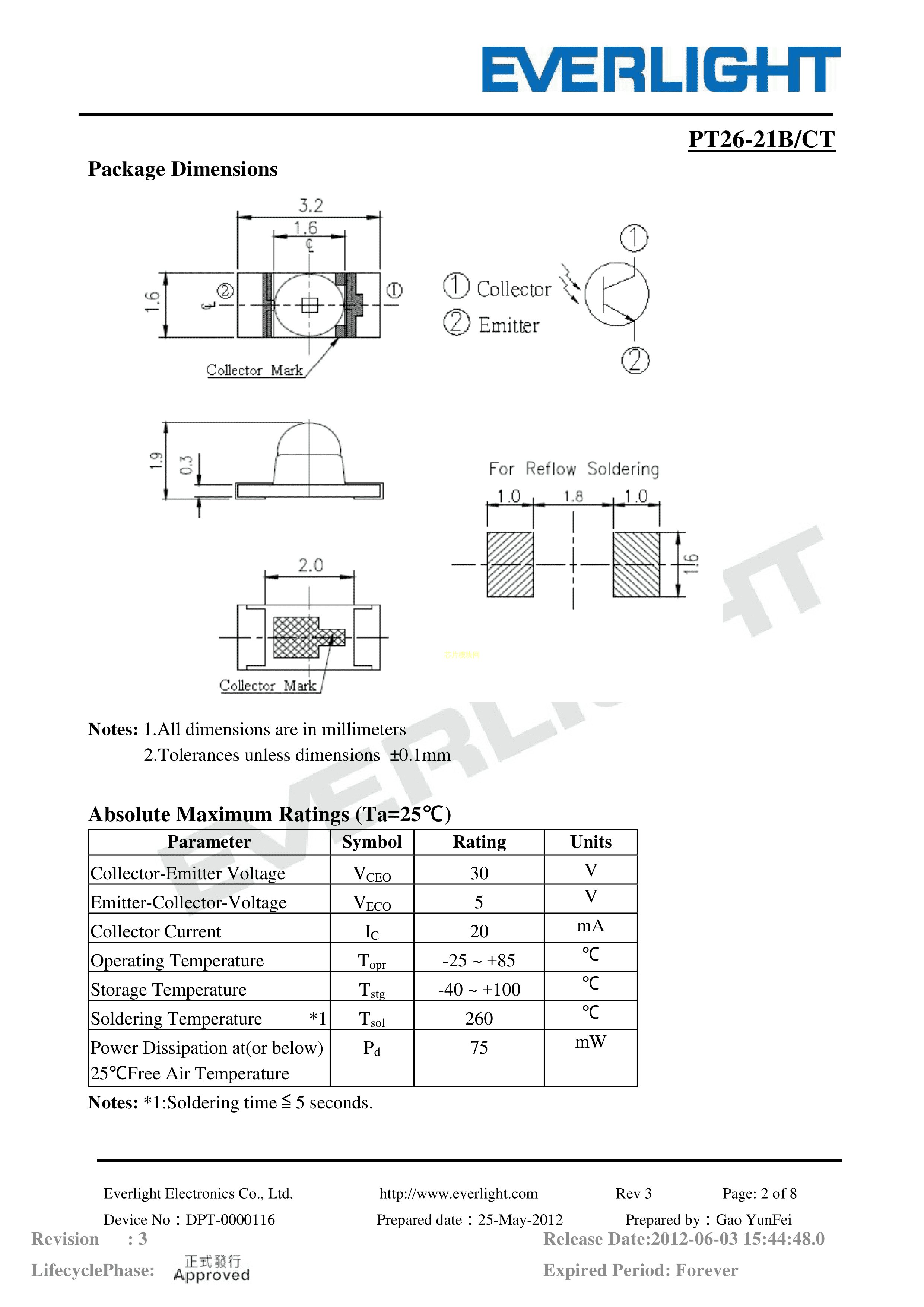 PT26-21B-CT数据手册1206封装EVERLIGHT(台湾亿光)PDF规格书,中英文下载