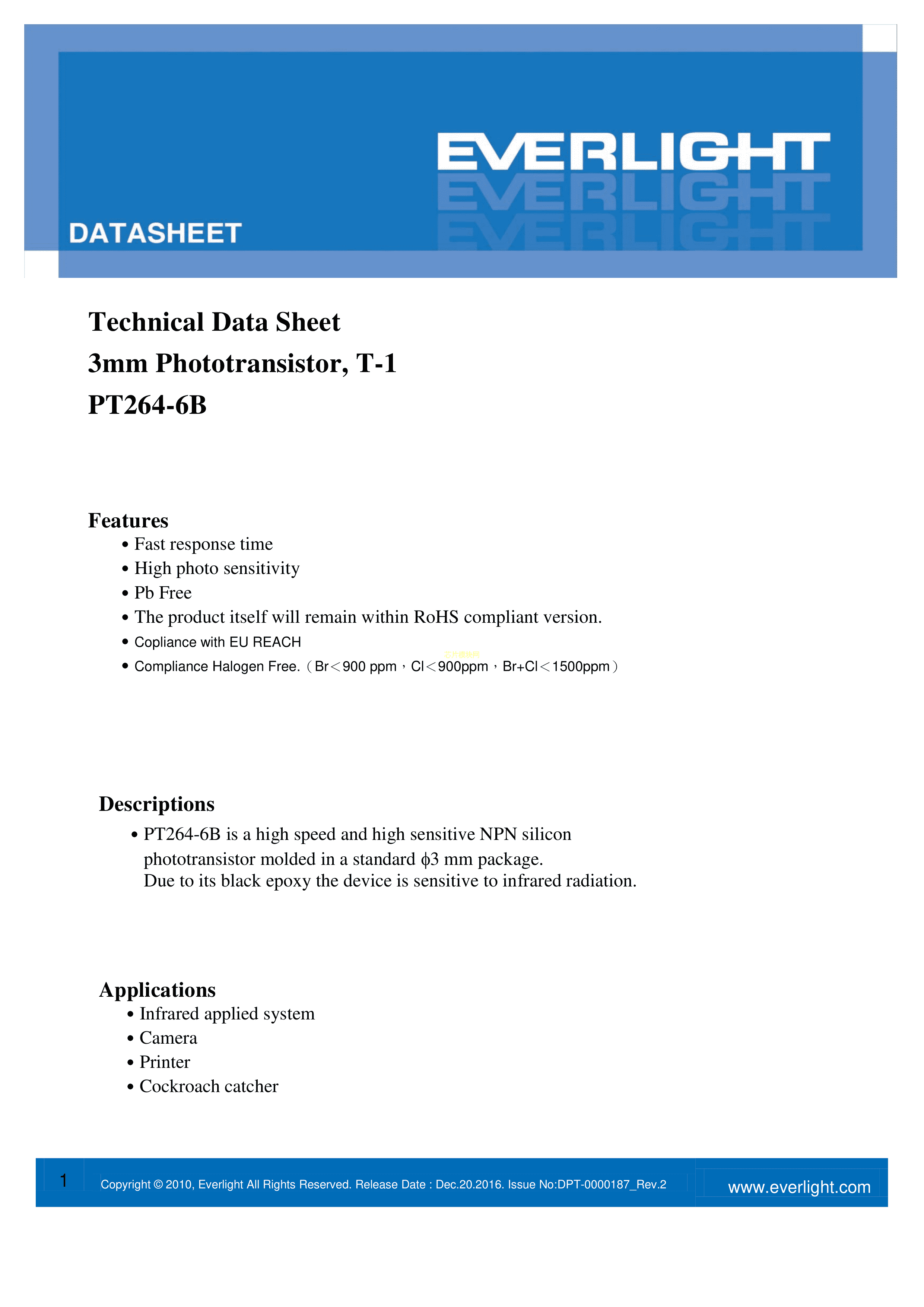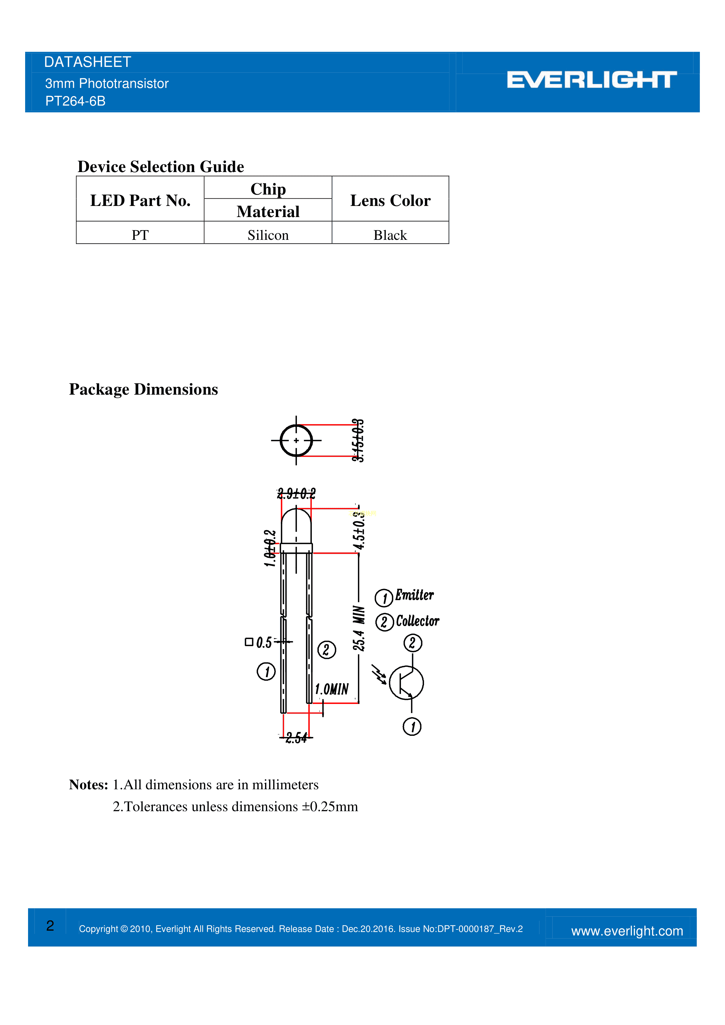 PT264-6B数据手册ThroughHole封装EVERLIGHT(台湾亿光)PDF规格书,中英文下载