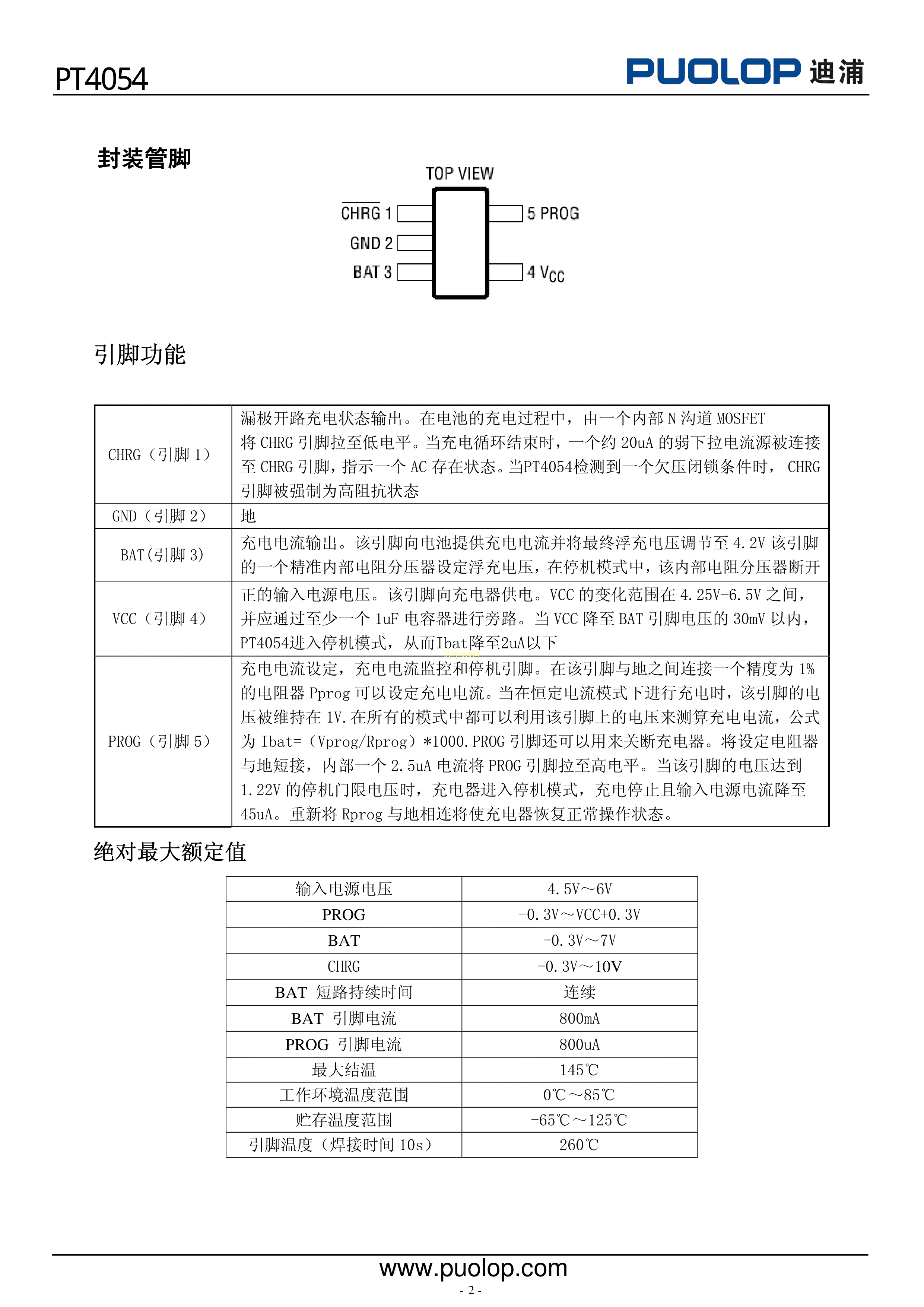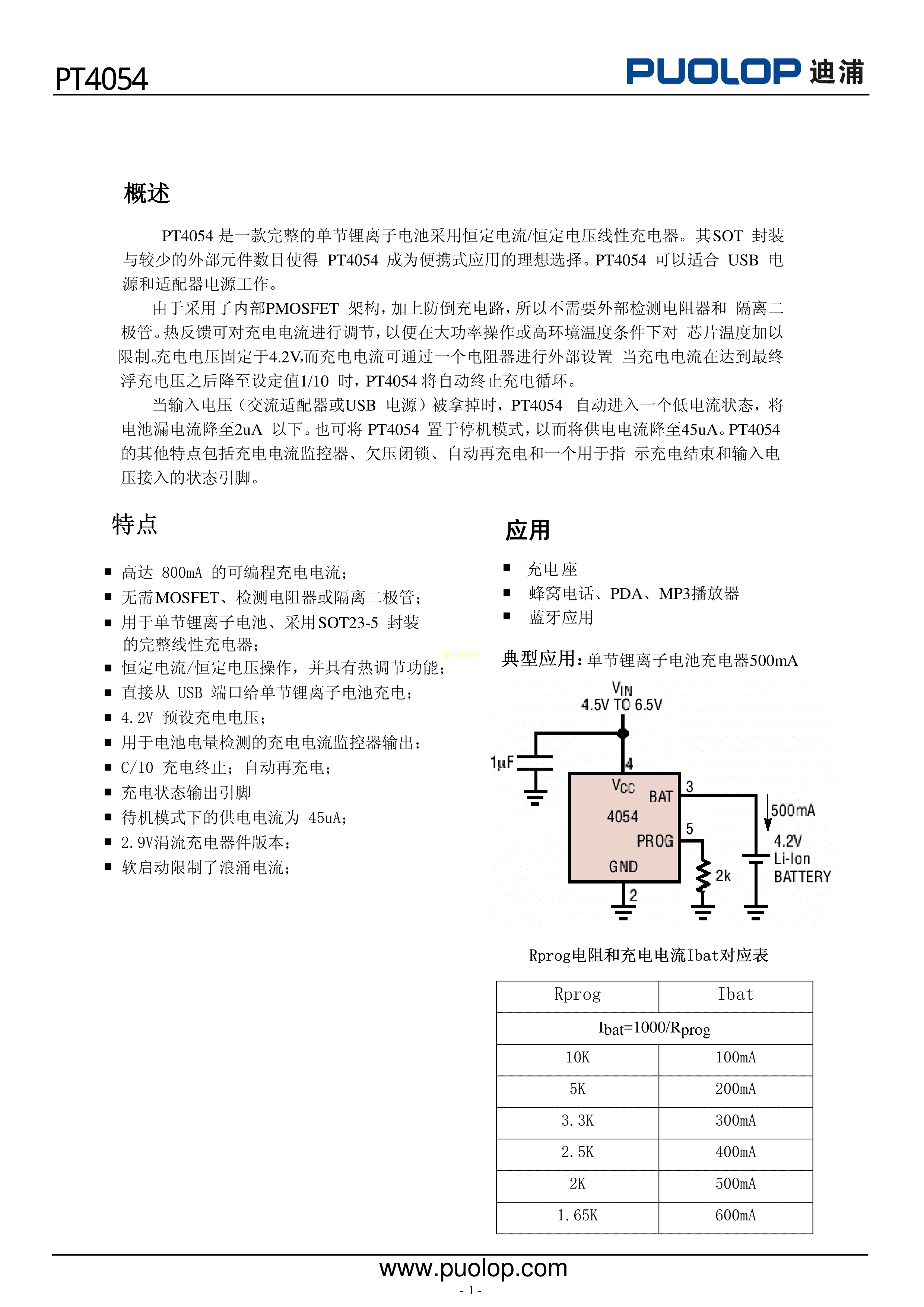 PT4054数据手册SOT-23-5L封装PUOLOP(迪浦)PDF规格书,中英文下载