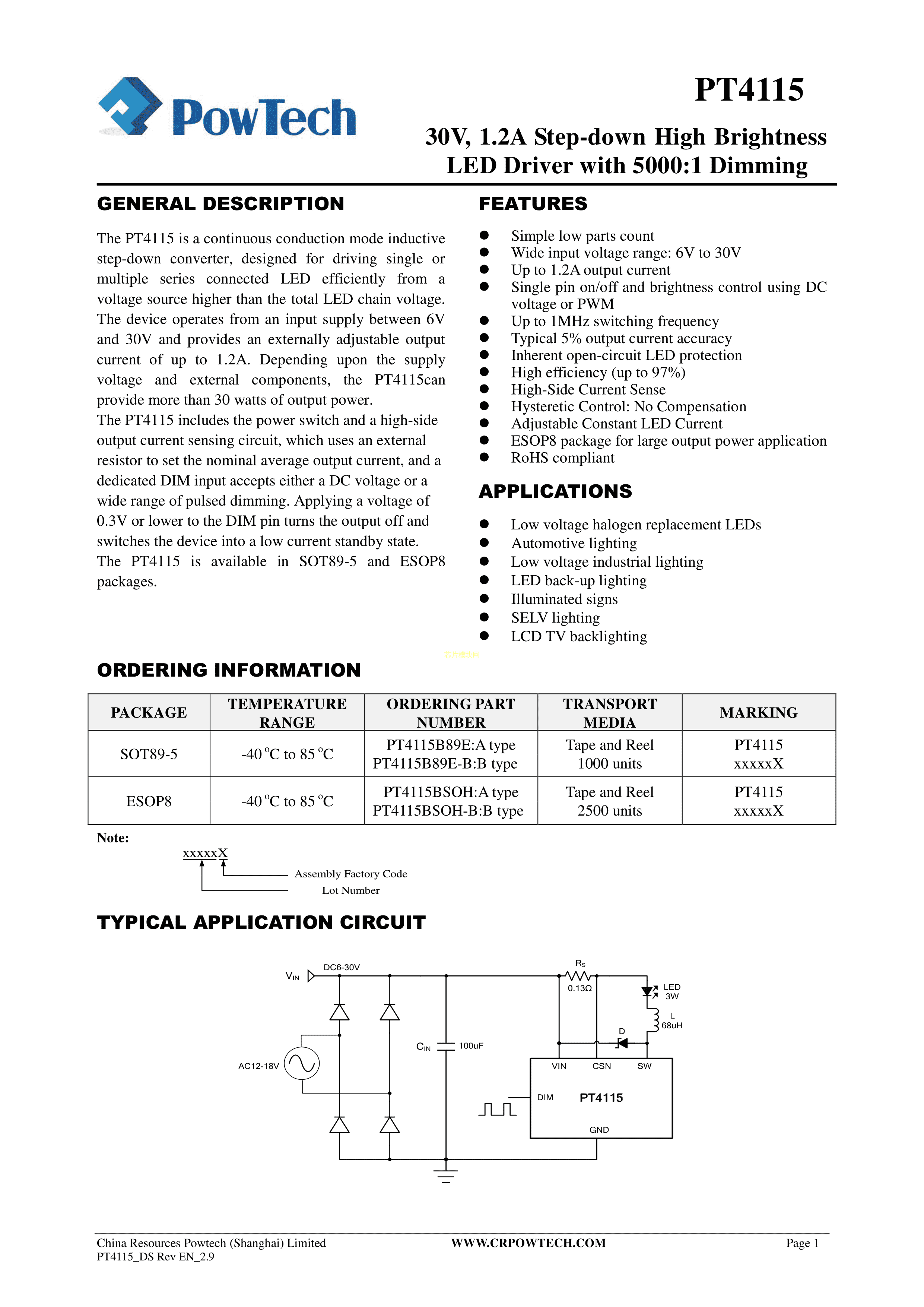 PT4115B89E数据手册SOT-89-5封装PowTech(华润矽威)PDF规格书,中英文下载