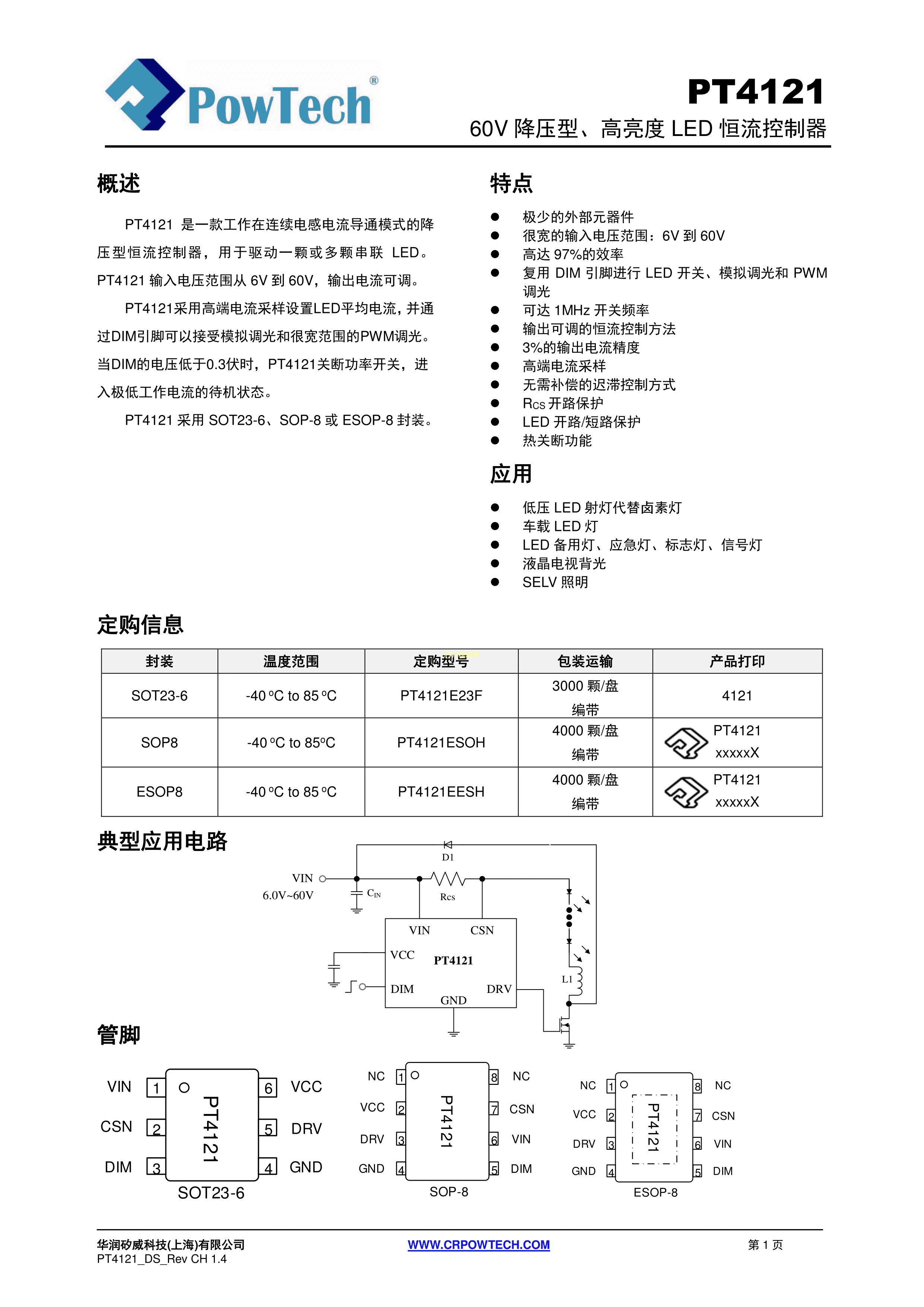 PT4121E23F数据手册SOT-23-6封装PowTech(华润矽威)PDF规格书,中英文下载