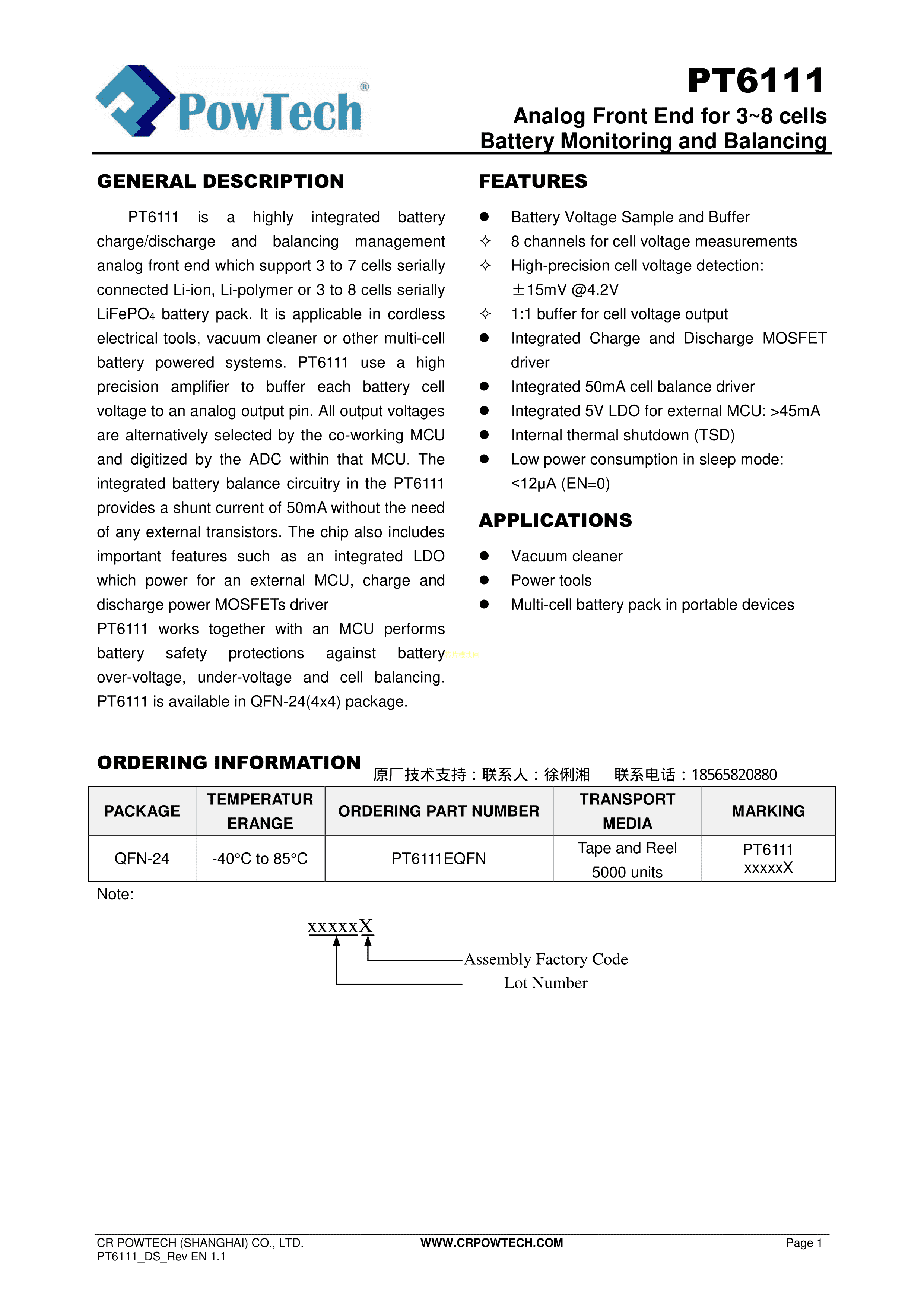 PT6111数据手册QFN-24封装PowTech(华润矽威)PDF规格书,中英文下载