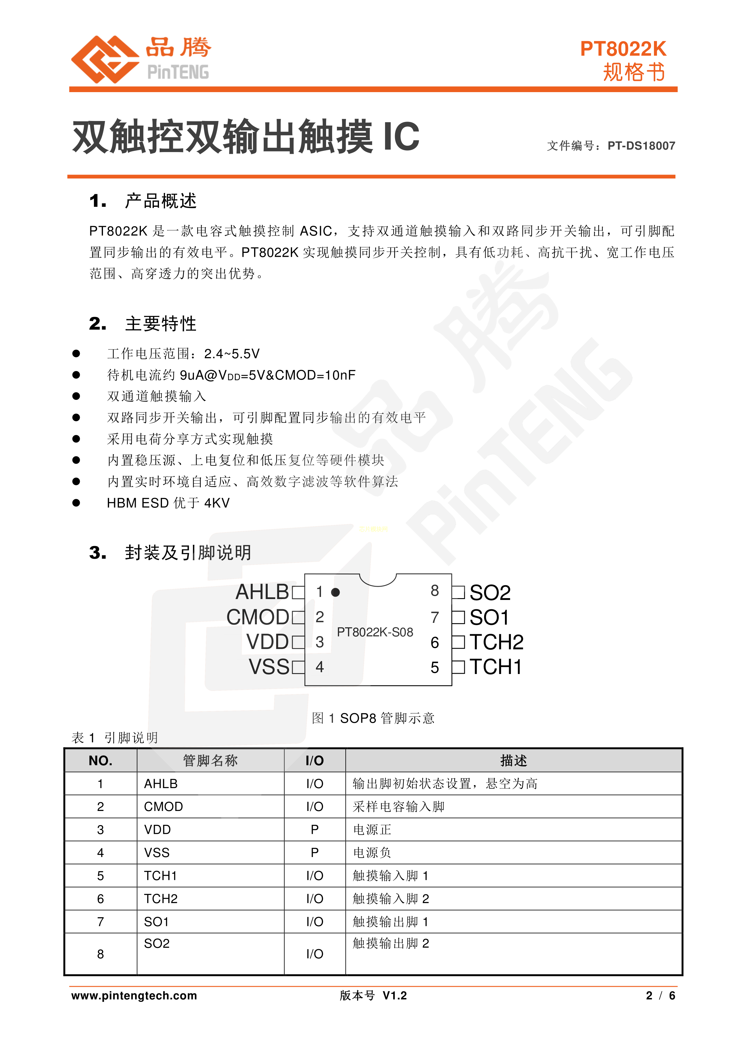 PT8022K-S08数据手册SOP-8封装PinTENG(品腾)PDF规格书,中英文下载