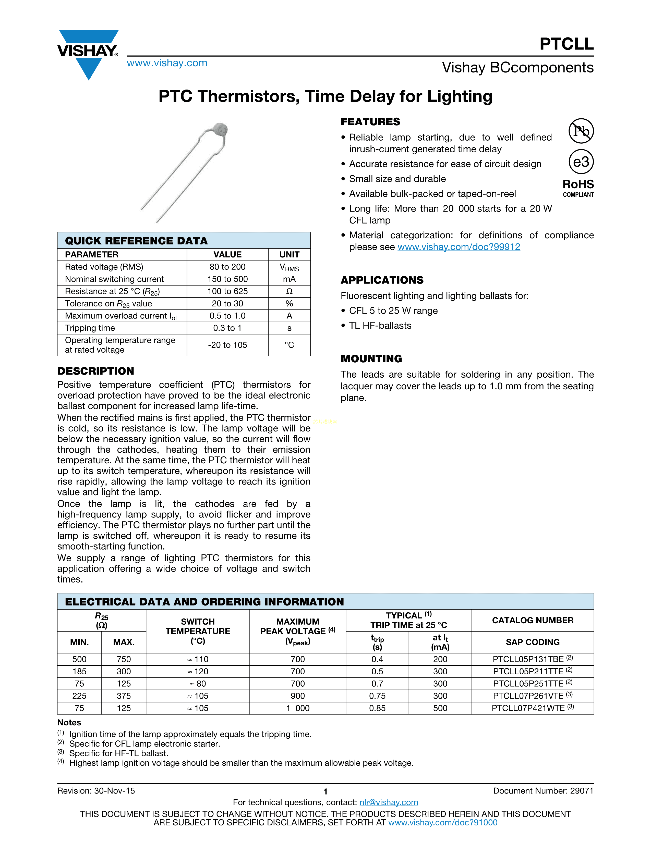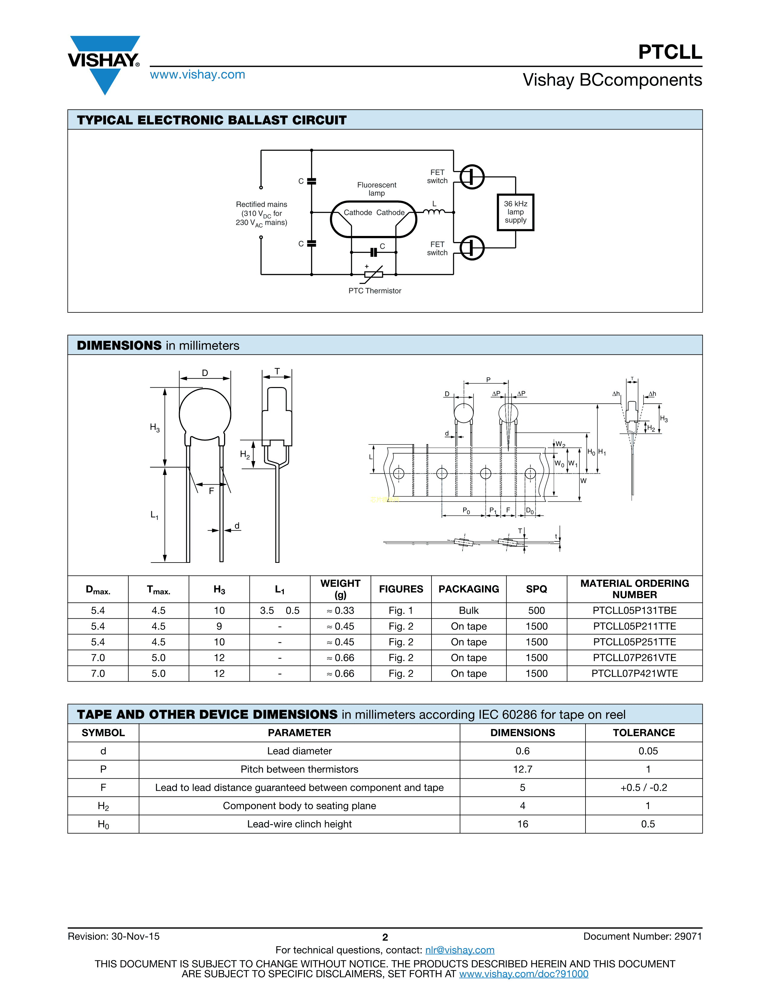 PTCLL07P261VTE数据手册径向引线P5mm封装VISHAY(威世)PDF规格书,中英文下载