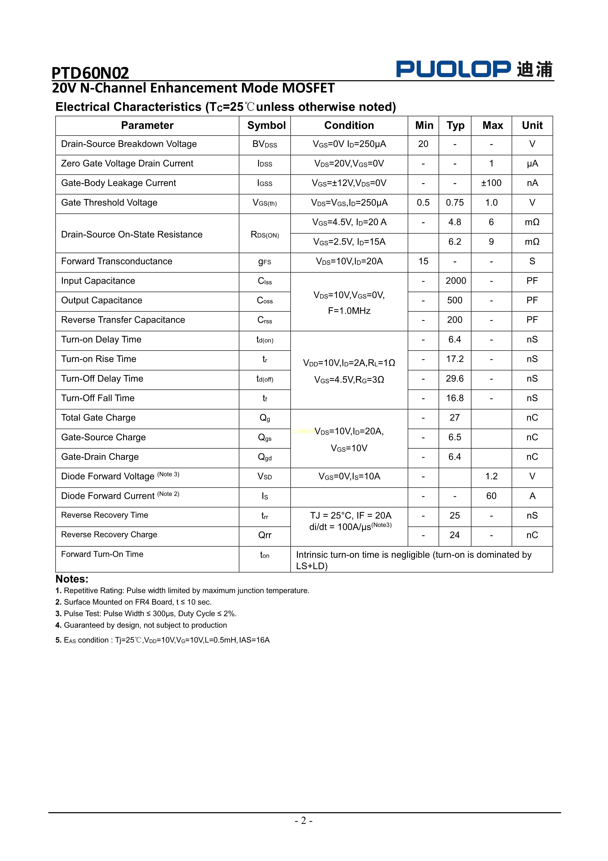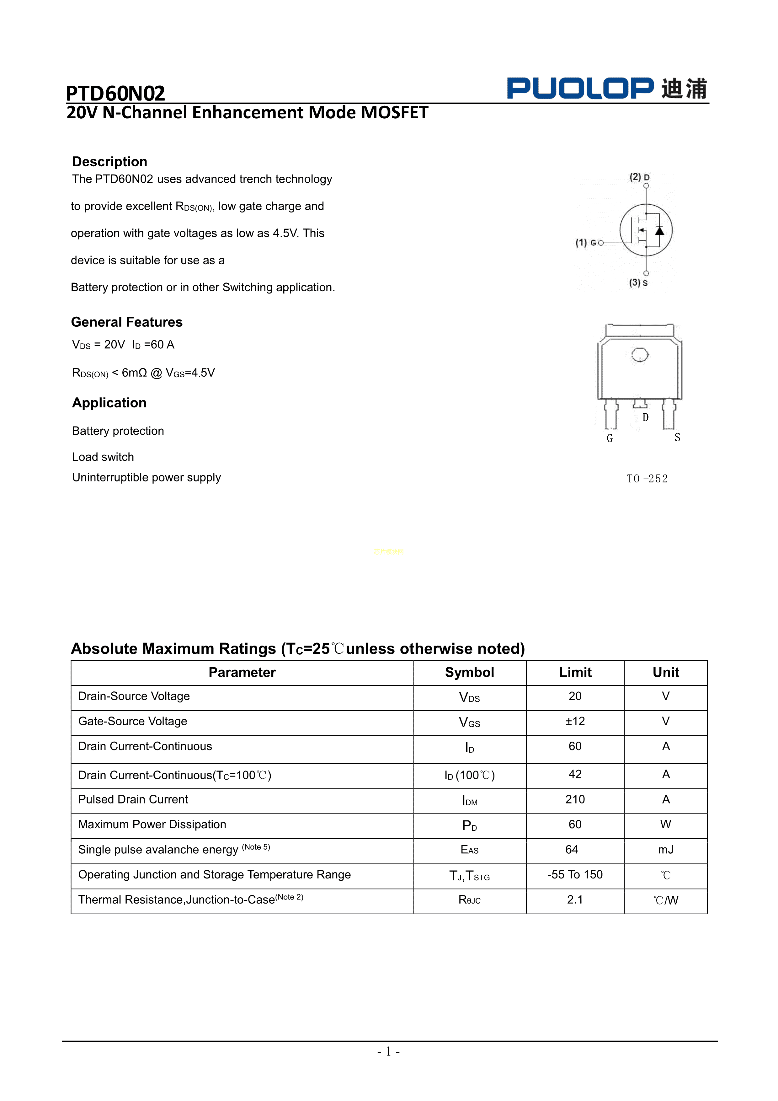 PTD60N02数据手册TO-252封装PUOLOP(迪浦)PDF规格书,中英文下载