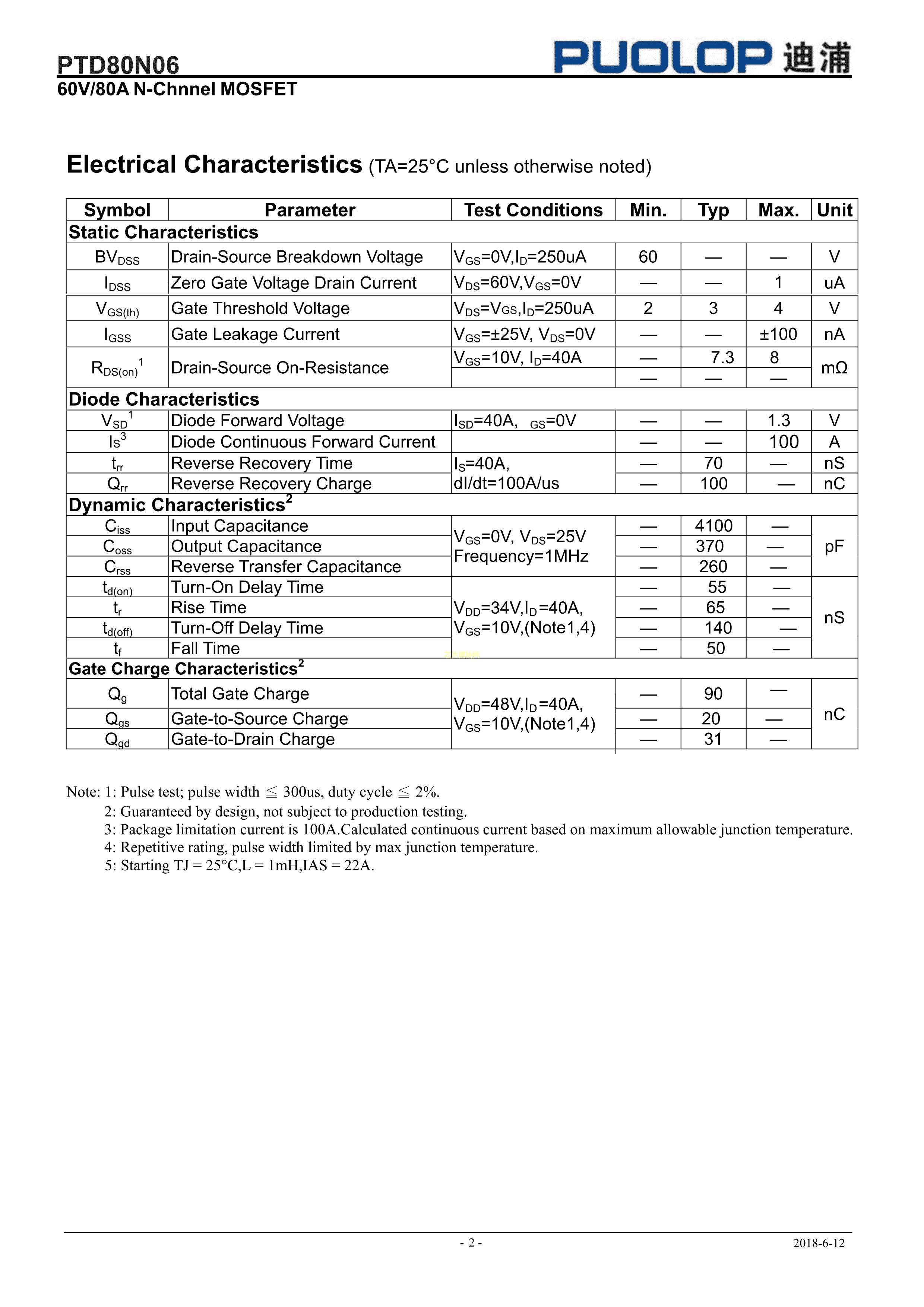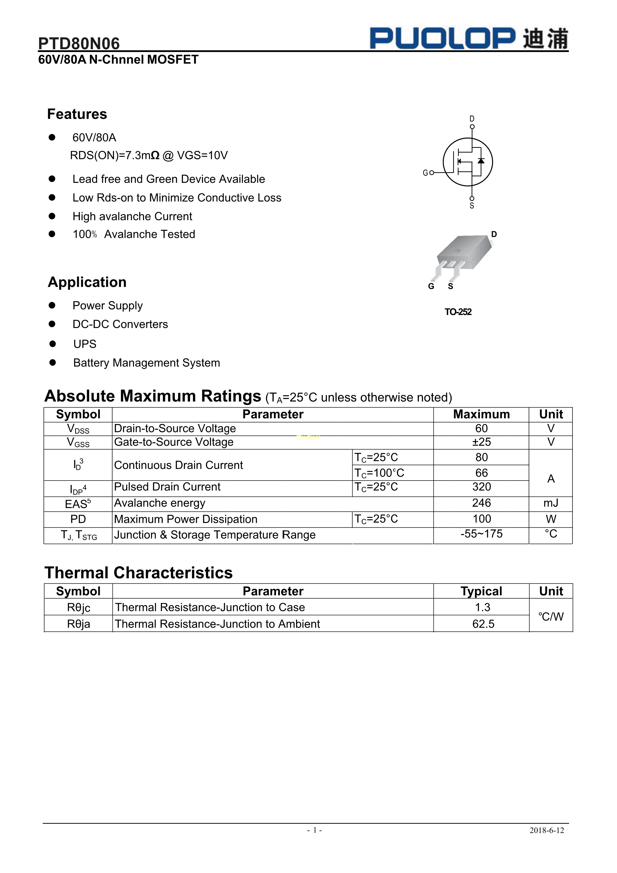 PTD80N06数据手册TO-252封装PUOLOP(迪浦)PDF规格书,中英文下载