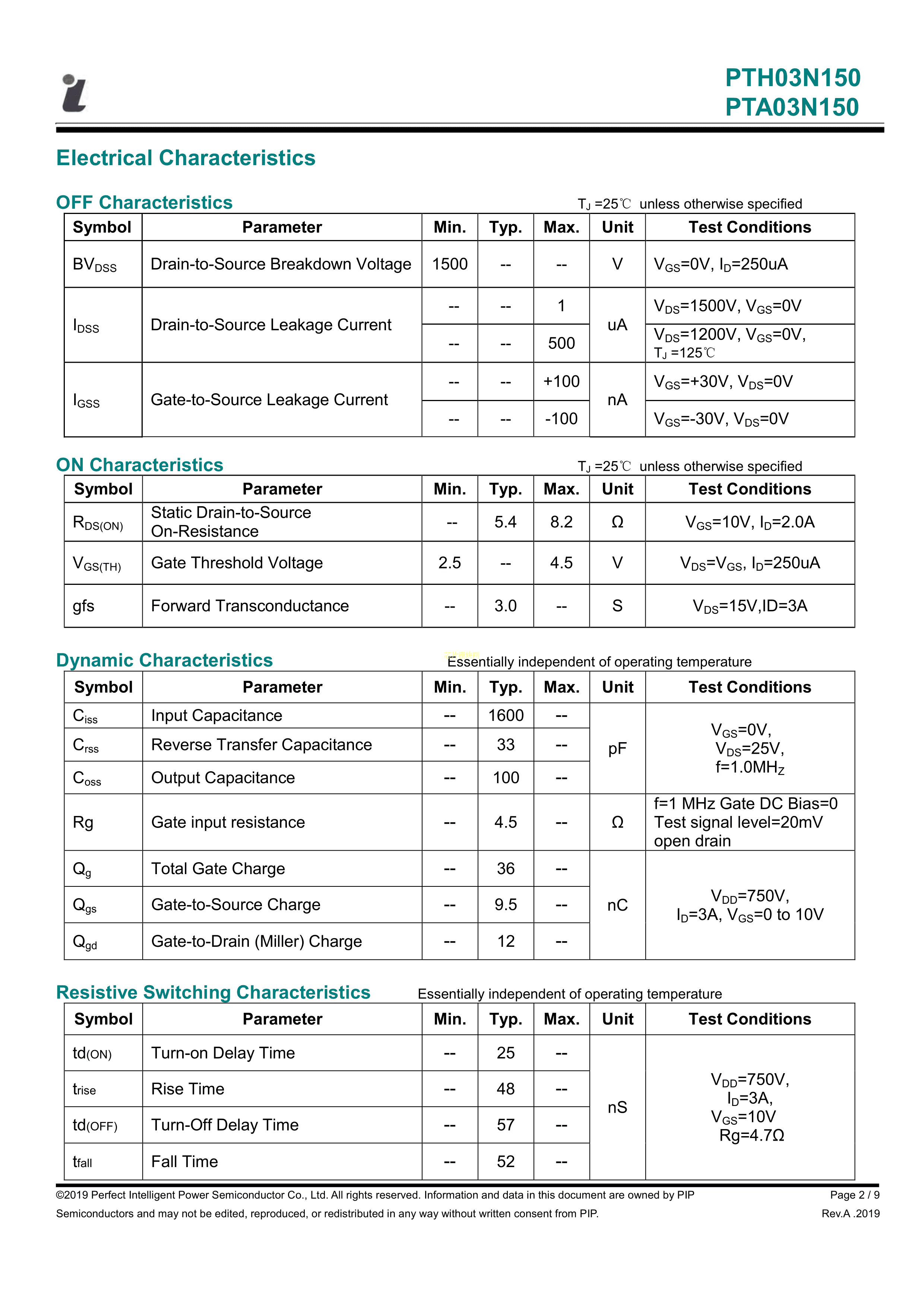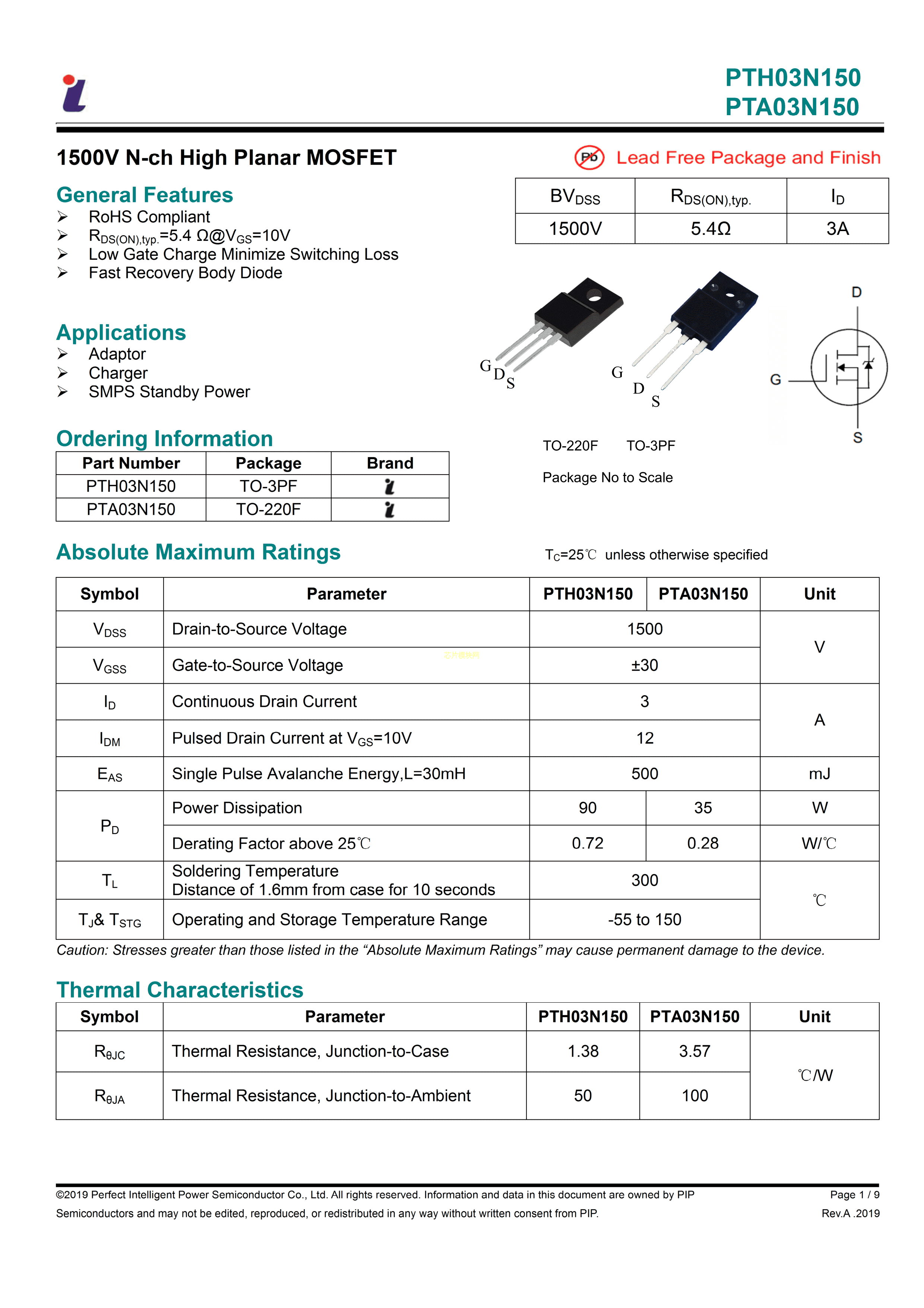 PTH03N150数据手册TO-3PF封装PIP(丽隽)PDF规格书,中英文下载