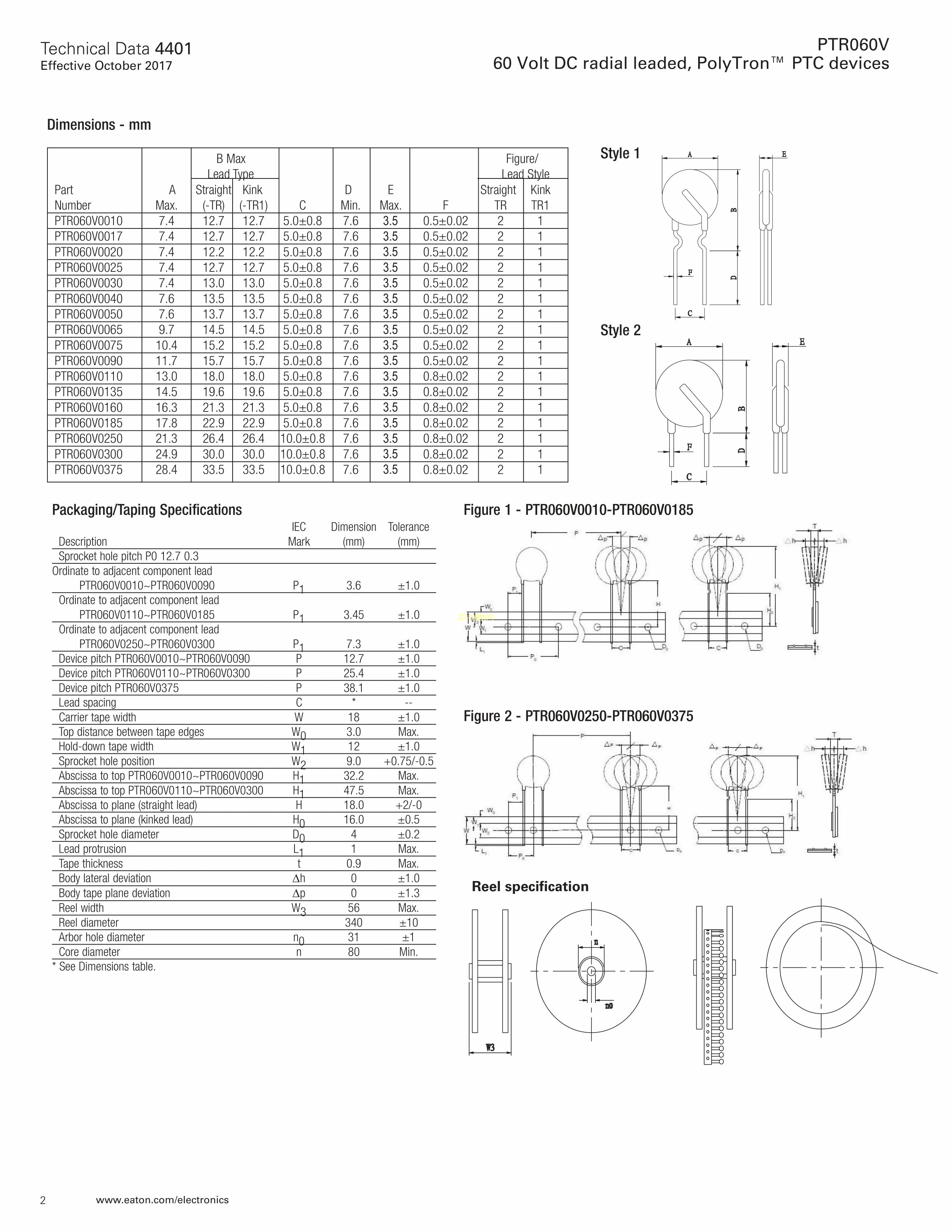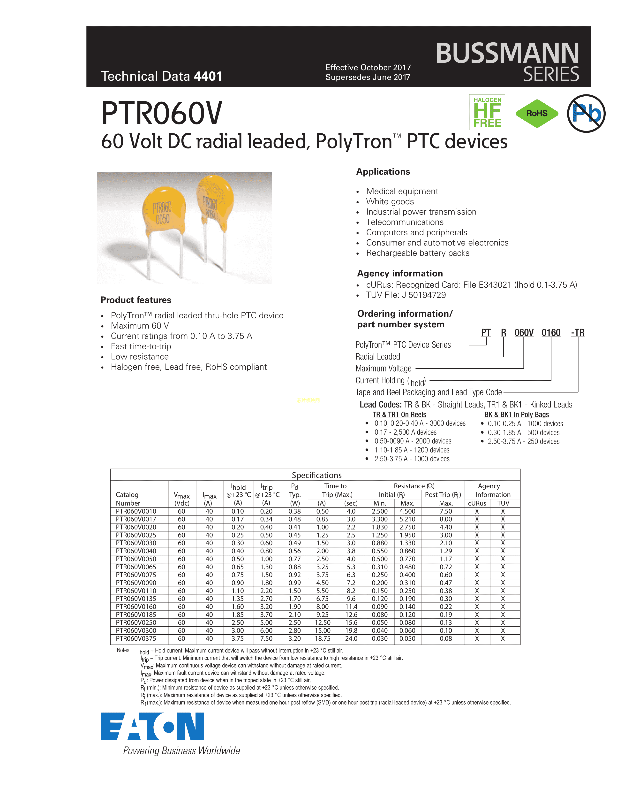 PTR060V0185-BK数据手册径向引线封装EATON(伊顿)PDF规格书,中英文下载
