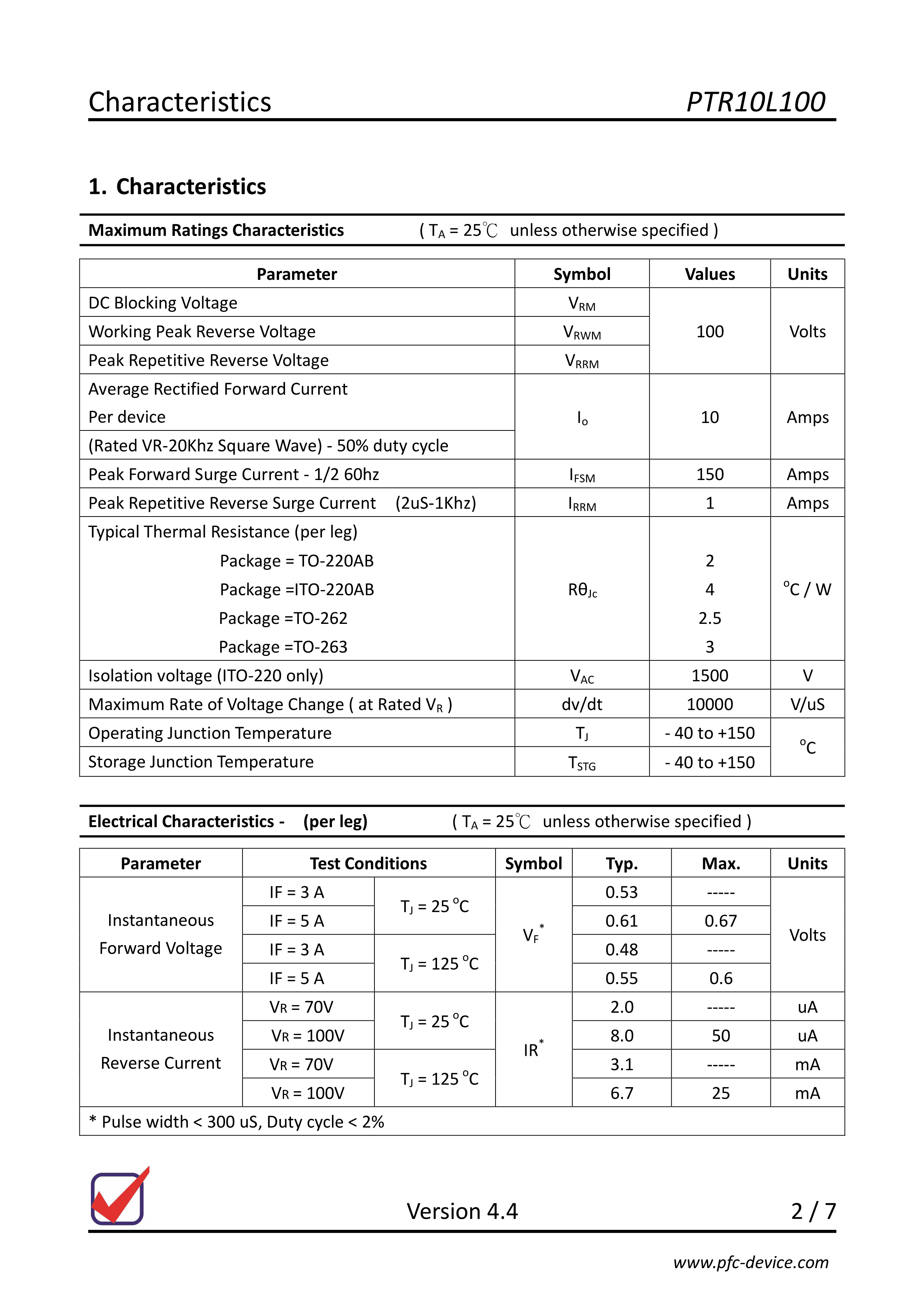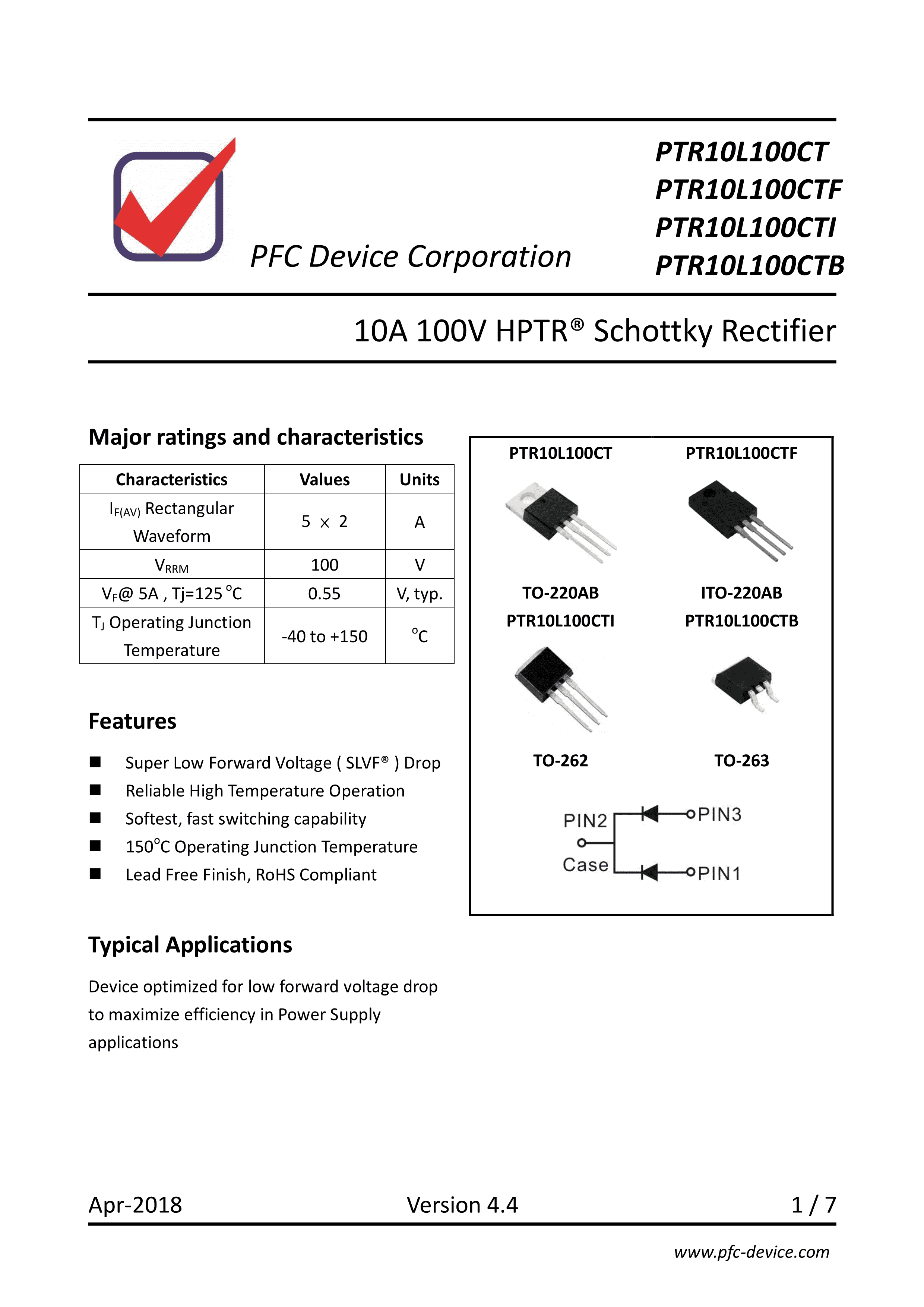 PTR10L100CT数据手册TO-220AB封装PFCPDF规格书,中英文下载