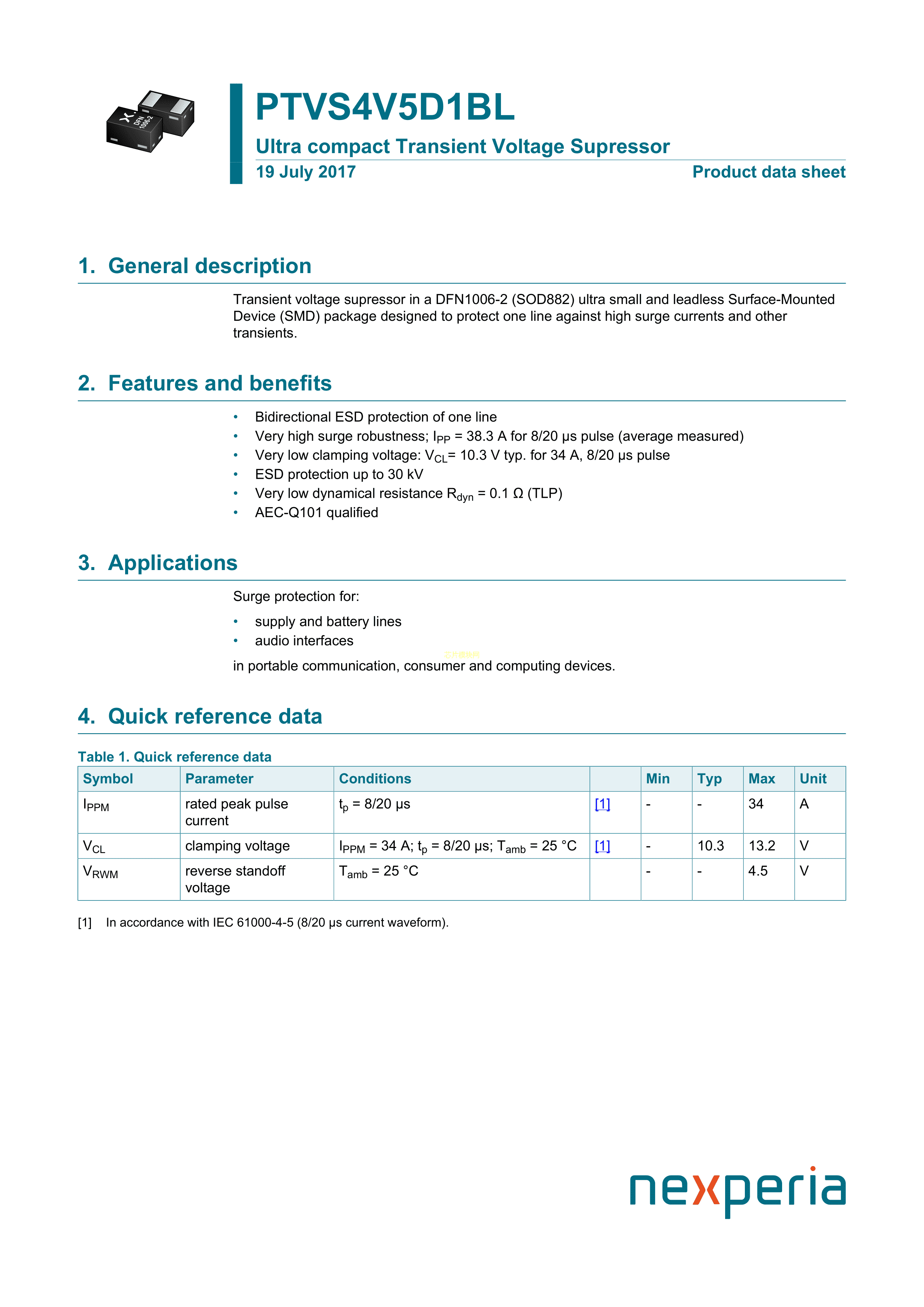 PTVS4V5D1BLYL数据手册SOD-882封装Nexperia(安世)PDF规格书,中英文下载