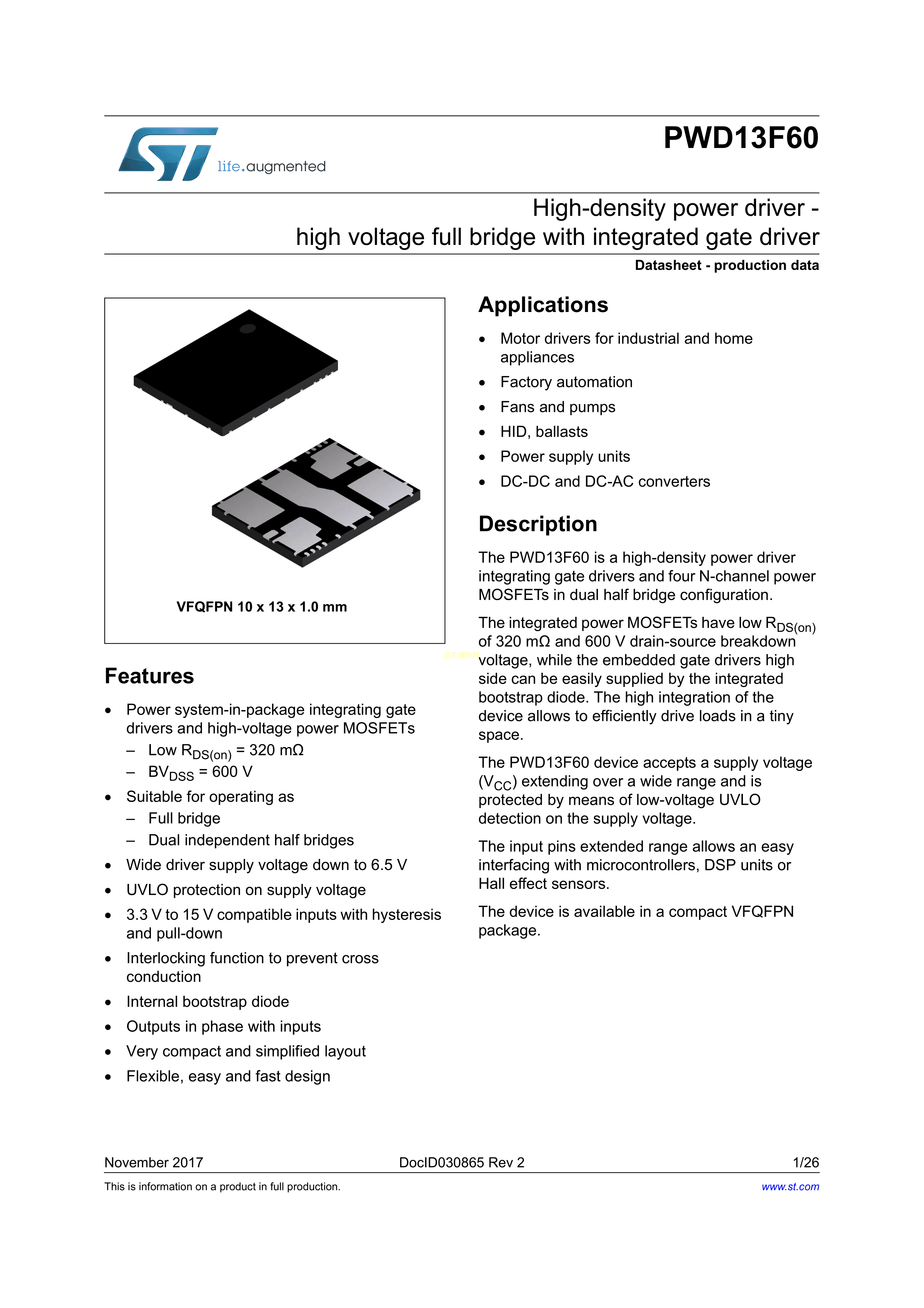 PWD13F60TR数据手册VFQFPN-28(10x13)封装ST(意法半导体)PDF规格书,中英
