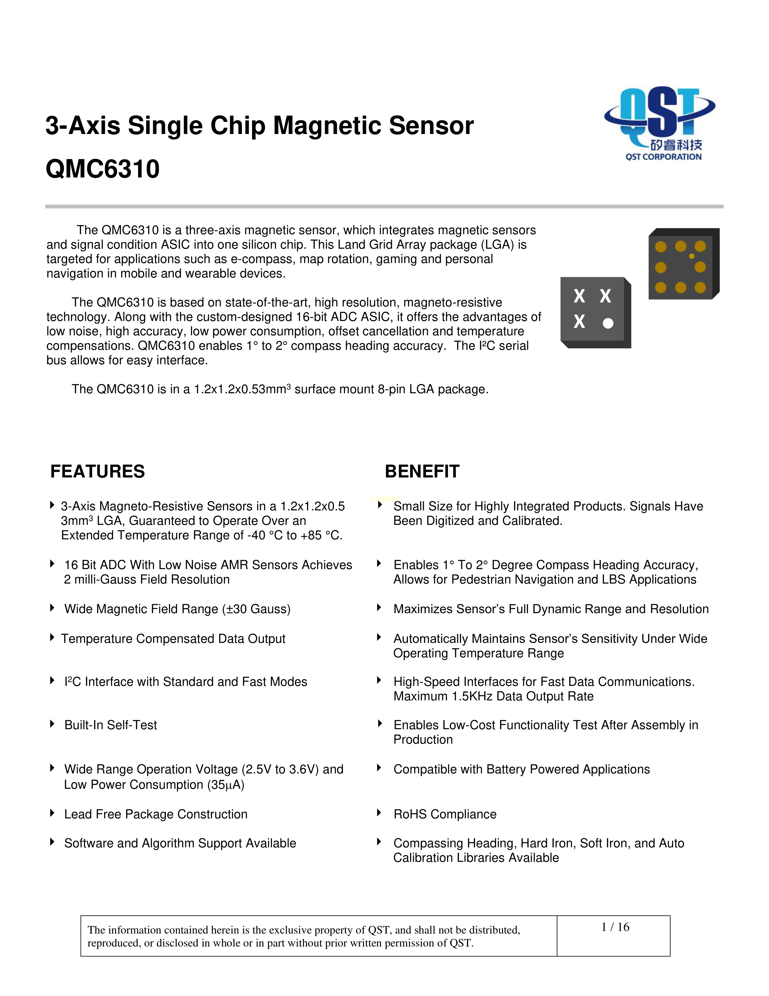 QMC6310U数据手册LGA-8(1.2x1.2x0.53mm)封装QST(上海矽睿)PDF规格书