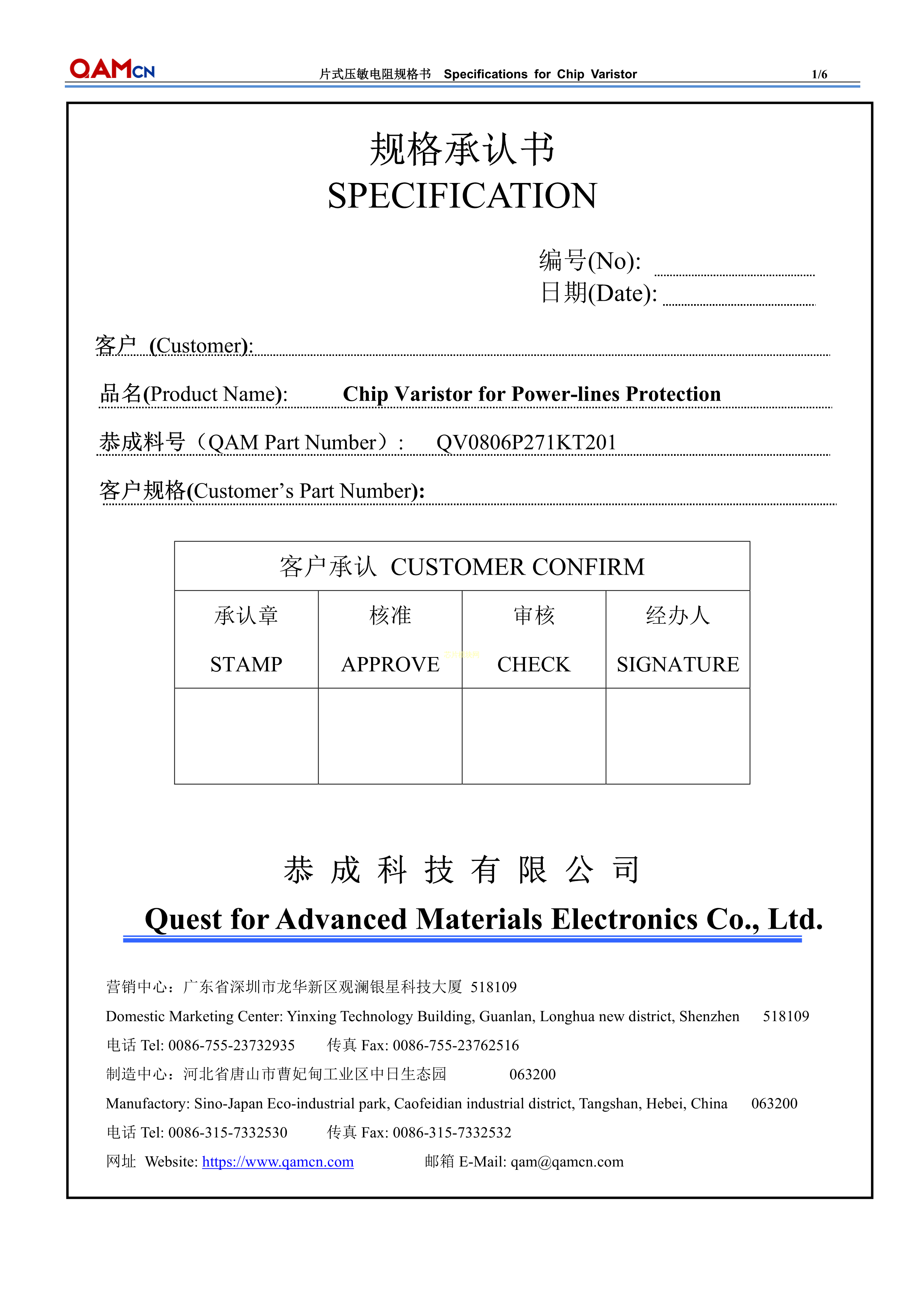 QV0806P271KT201数据手册SMD2x1.6x1.6mm封装QAMcn(恭成科技)PDF规