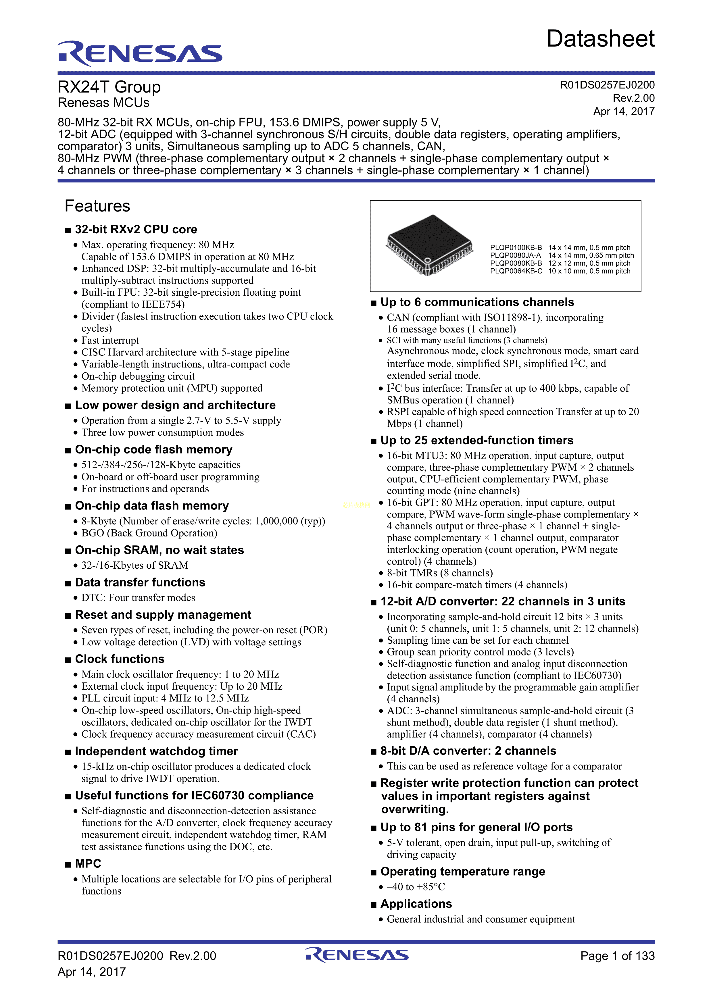 R5F524T8ADFM#31数据手册LFQFP-64(10x10)封装RENESAS(瑞萨)-ID
