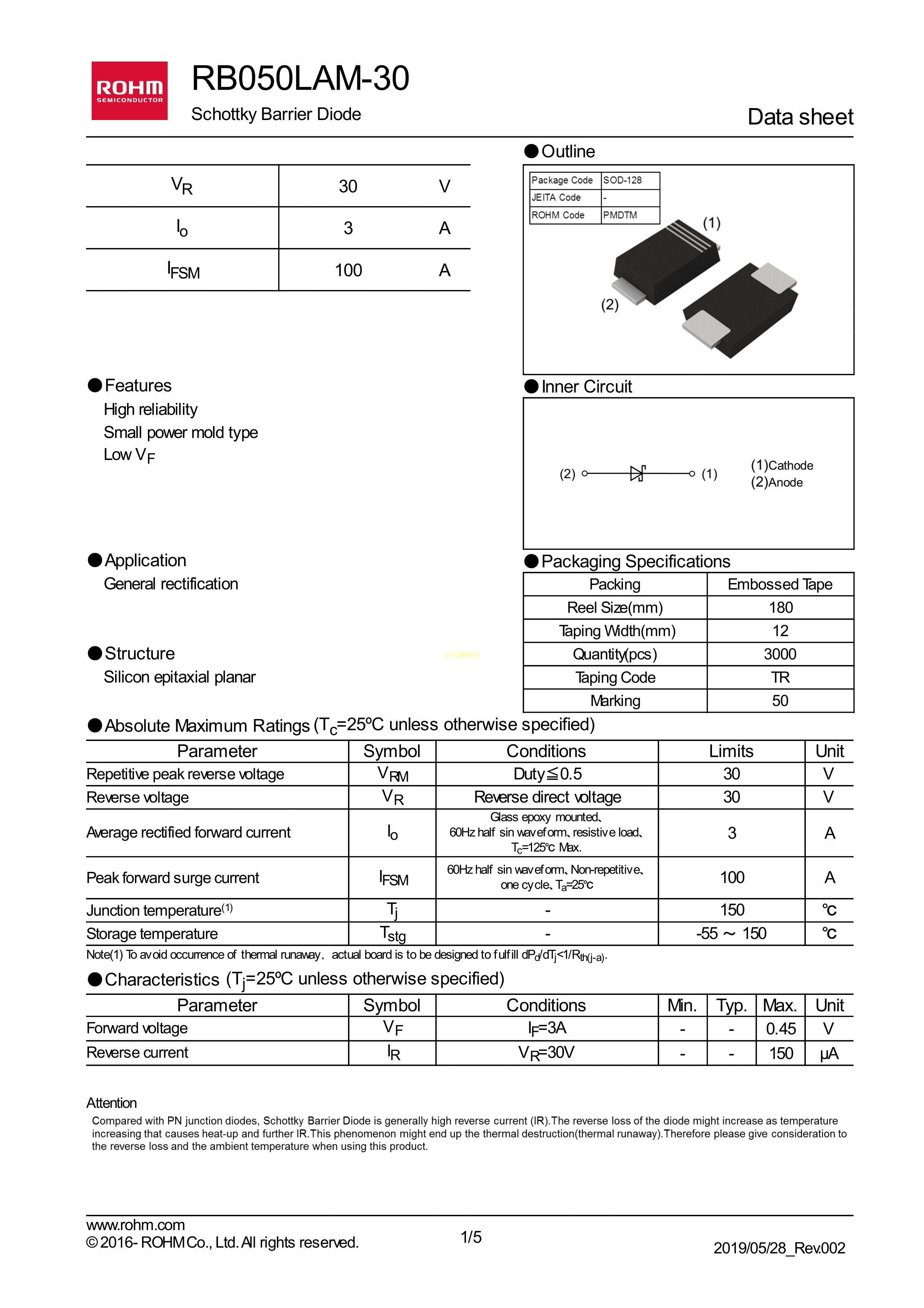 RB050LAM-30TR数据手册SOD-128-2封装ROHM(罗姆)PDF规格书,中英文下载