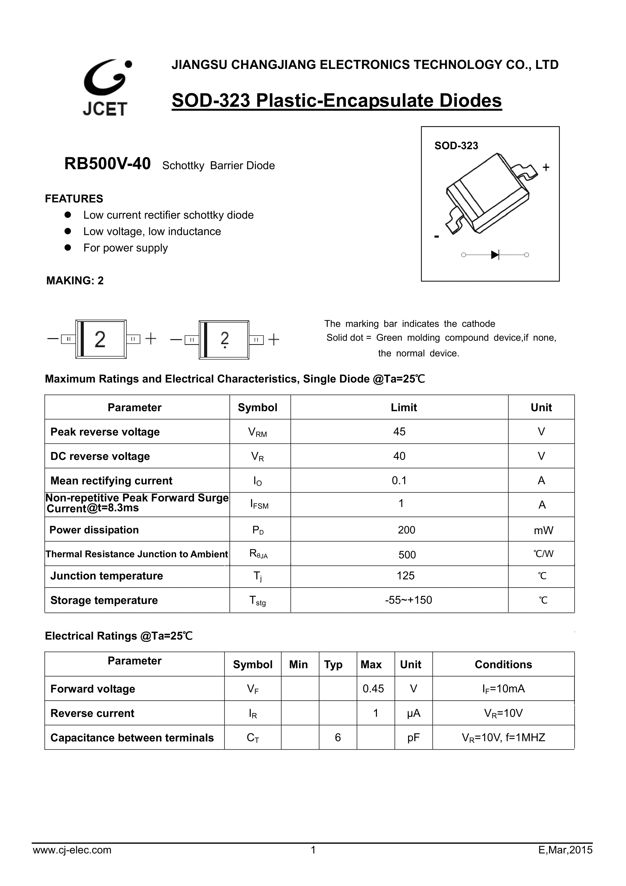 RB500V-40数据手册SOD-323封装CJ(江苏长电-长晶)PDF规格书,中英文下载